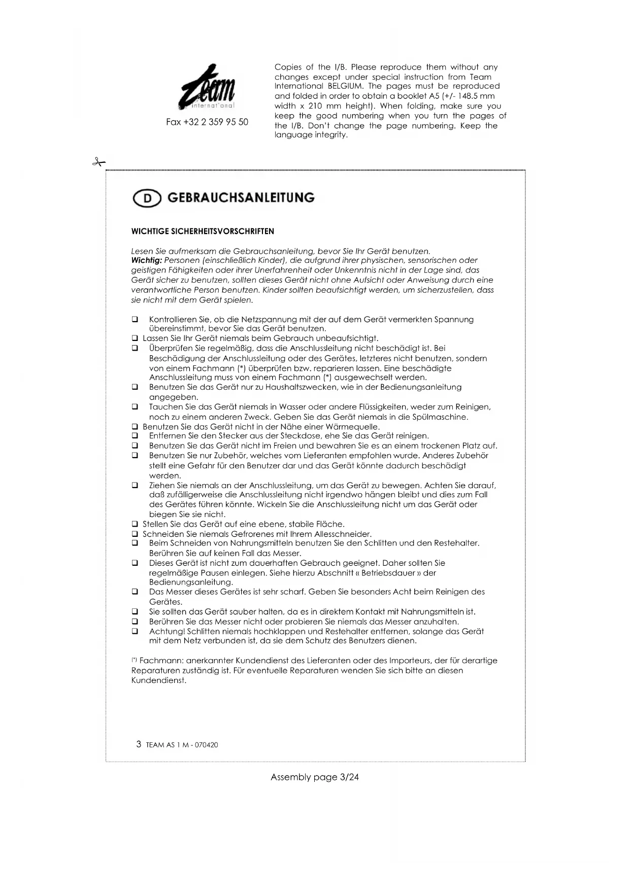 Fax +32 2 359 95 50 BETRIEBSDAUER Dieses Gerät ist nicht für den Dauerbetrieb geeignet. Die auf dem Typenschild angegebene Betriebsdauer darf nicht überschritten werden. Bei Nichtbeachtung kann der Motor beschädigt werden. Richten Sie sich bitte nach dem Typenschild, auf dem die optimale Betriebsdauer angegeben ist (KB xx min wobei xx die zugelassene maximale Betriebsdauer ist). Die Pausen sollten mindestens 10 Minuten betragen. INBETRIEBNAHME Das Gerät gewährleistet einen sicheren Gebrauch durch die Verwendung des Schlittens (4) mit dem Daumenschutz (6) und dem Restehalter (3). Der Schlitten gleitet leicht mit dem Schnittgut am Rundmesser vorbei und schneidet es somit in die gewünschten Scheiben. Fassen Sie den Schlitten dabei immer am Griff des Resthalters an. Er ermöglicht es, die Nahrungsmittel während des Schneidens zu halten und die Hand trotzdem aus dem Bereich des Rundmessers fernzuhalten. Wischen Sie alle Teile des Gerätes ab, bevor Sie es zum ersten Mal benutzen. Stellen Sie das Gerät auf eine ebene, stabile Arbeitsfläche und setzen Sie den Schlitten (4) mit dem Restehalter (3) auf. Schließen Sie das Gerät an das Stromnetz an. Der Allesschneider ist nun betriebsbereit. Stellen Sie einen Teller oder ein Tablett neben den Allesschneider, um die Scheiben aufzufangen. Ziehen Sie den Schlitten nach hinten und legen Sie das Schneidgut darauf. Stellen Sie die gewünschte Scheibendicke mit der Schnittstärkeneinstellung (5) ein. Stellen Sie den Schalter (2) auf die Stellung 1. Das Rundmesser (1) dreht sich und die Kontrollleuchte des Schalters leuchtet. Führen Sie das Schnittgut mit dem Schlitten am Rundmesser vorbei. Mit dem Restehalter drücken Sie dabei das Schnittgut leicht an das Rundmesser. Wenn es das Rundmesser schwer läuft, ziehen Sie das Schnittgut etwas zurück und schieben es dann erneut nach vorn. Fetten oder ölen Sie das Rundmesser leicht, bevor Sie mit dem Schneiden beginnen. Damit vermeiden Sie, dass die Nahrungsmittelreste am Rundmesser kleben bleiben. Der Allesschneider sollte nicht benutzt werden für Fleisch mit Knochen, Esswaren mit großen Kernen, verzwirnte Rollbraten, Verpackungsmaterial (z.B. Aluminiumfolie), gefrorene Esswaren oder harte, nicht essbare Stücke von Lebensmitteln. PFLEGEHINWEISE Der EIN/AUS-Schalter muss auf Stellung AUS geschaltet und das Gerät muss vom Netz getrennt sein, bevor Sie es reinigen. Reinigung der Außen- und Innenseite des Gerätes nur mit einem Tuch oder Schwamm. Es darf nicht in der Geschirr-Spülmaschine gespült werden (Um die Reinigung zu vereinfachen, ist der Schlitten klappbar). Niemals mit metallischen Gegenständen reinigen oder Schleif- und Scheuermittel verwenden. Gerät nicht ins Wasser oder andere Flüssigkeiten tauchen. Trocknen Sie alle Teile gut ab bevor Sie das Gerät wegstellen. RUNDMESSER ABNEHMEN Für eine gründliche Reinigung besteht die Möglichkeit, das Messer abzunehmen. Schalten Sie das Gerät aus, und ziehen Sie den Stecker aus der Steckdose. Lösen Sie dann die 3 Schrauben (mithilfe eines Schraubenziehers). Copies of the I/B. Please reproduce them without any changes except under special instruction from Team International BELGIUM. The pages must be reproduced and folded in order to obtain a booklet A5 (+/- 148.5 mm width x 210 mm height). When folding, make sure you keep the good numbering when you turn the pages of the I/B. Don’t change the page numbering. Keep the language integrity.