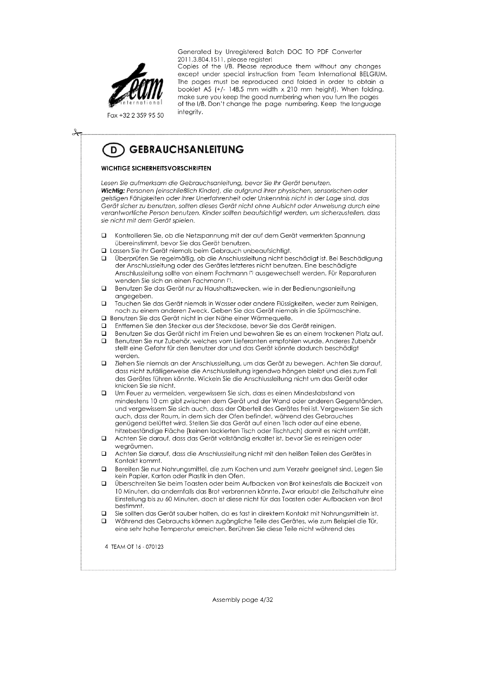 Benutzen Sie das Gerät nur zu Haushaltszwecken, wie in der Bedienungsanleitung angegeben. Tauchen Sie das Gerät niemals in Wasser oder andere Flüssigkeiten, weder zum Reinigen, noch zu einem anderen Zweck. Geben Sie das Gerät niemals in die Spülmaschine. Benutzen Sie das Gerät nicht in der Nähe einer Wärmequelle. Entfernen Sie den Stecker aus der Steckdose, bevor Sie das Gerät reinigen. Benutzen Sie das Gerät nicht im Freien und bewahren Sie es an einem trockenen Platz auf. Benutzen Sie nur Zubehör, welches vom Lieferanten empfohlen wurde. Anderes Zubehör stellt eine Gefahr für den Benutzer dar und das Gerät könnte dadurch beschädigt werden. Ziehen Sie niemals an der Anschlussleitung, um das Gerät zu bewegen. Achten Sie darauf, dass nicht zufälligerweise die Anschlussleitung irgendwo hängen bleibt und dies zum Fall des Gerätes führen könnte. Wickeln Sie die Anschlussleitung nicht um das Gerät oder knicken Sie sie nicht. Um Feuer zu vermeiden, vergewissern Sie sich, dass es einen Mindestabstand von mindestens 10 cm gibt zwischen dem Gerät und der Wand oder anderen Gegenständen, und vergewissern Sie sich auch, dass der Oberteil des Gerätes frei ist. Vergewissern Sie sich auch, dass der Raum, in dem sich der Ofen befindet, während des Gebrauches genügend belüftet wird. Stellen Sie das Gerät auf einen Tisch oder auf eine ebene, hitzebeständige Fläche (keinen lackierten Tisch oder Tischtuch) damit es nicht umfällt. Achten Sie darauf, dass das Gerät vollständig erkaltet ist, bevor Sie es reinigen oder wegräumen. Achten Sie darauf, dass die Anschlussleitung nicht mit den heißen Teilen des Gerätes in Kontakt kommt. Bereiten Sie nur Nahrungsmittel, die zum Kochen und zum Verzehr geeignet sind. Legen Sie kein Papier, Karton oder Plastik in den Ofen. Überschreiten Sie beim Toasten oder beim Aufbacken von Brot keinesfalls die Backzeit von 10 Minuten, da andernfalls das Brot verbrennen könnte. Zwar erlaubt die Zeitschaltuhr eine Einstellung bis zu 60 Minuten, doch ist diese nicht für das Toasten oder Aufbacken von Brot bestimmt. Sie sollten das Gerät sauber halten, da es fast in direktem Kontakt mit Nahrungsmitteln ist. Während des Gebrauchs können zugängliche Teile des Gerätes, wie zum Beispiel die Tür, eine sehr hohe Temperatur erreichen. Berühren Sie diese Teile nicht während desGenerated by Unregistered Batch DOC TO PDF Converter 2011.3.804.1511, please register! Copies of the I/B. Please reproduce them without any changes except under special instruction from Team International BELGIUM. The pages must be reproduced and folded in order to obtain a booklet A5 (+/- 148.5 mm width x 210 mm height). When folding, make sure you keep the good numbering when you turn the pages of the I/B. Don’t change the page numbering. Keep the language integrity.