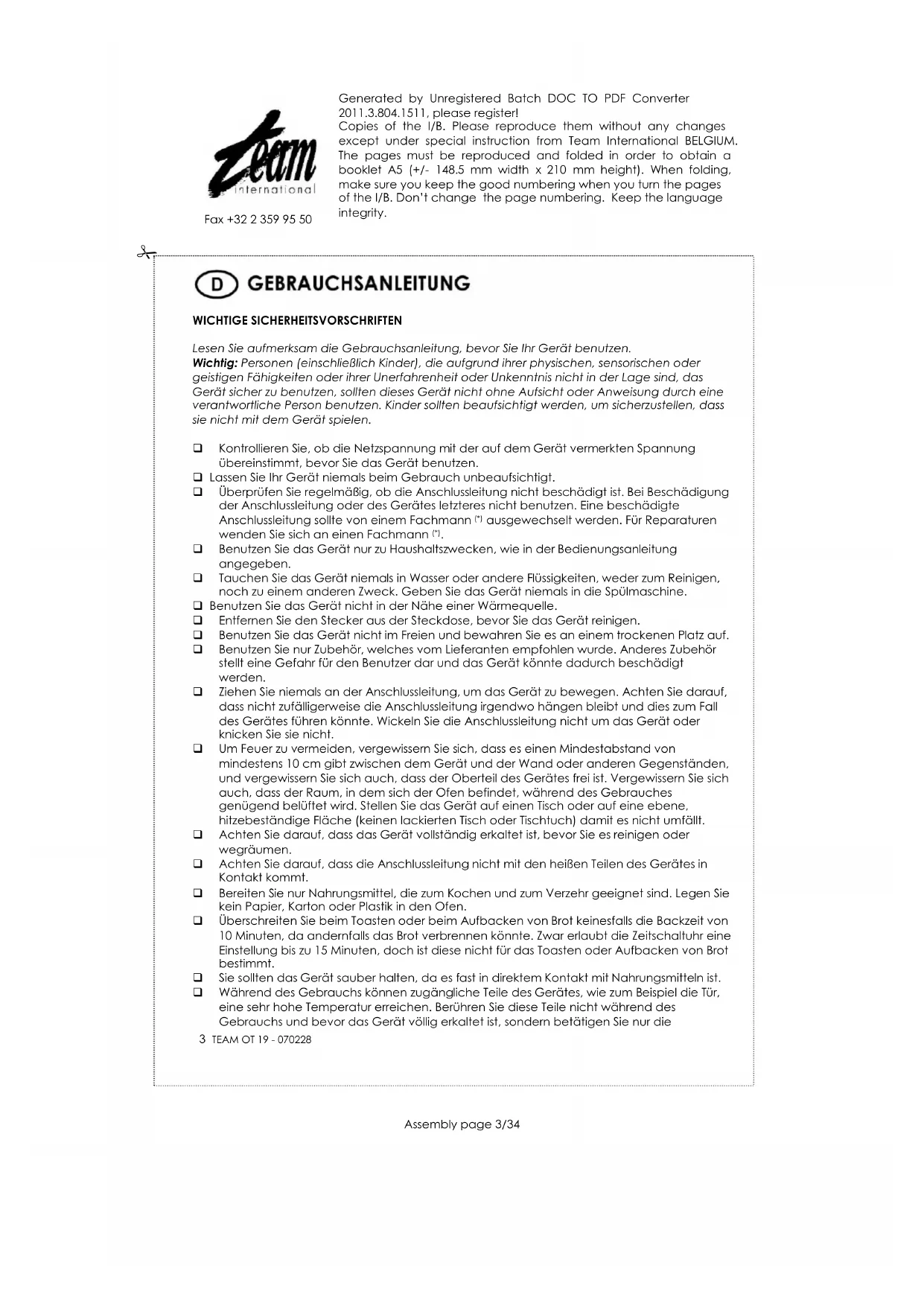 Zum Schutz unserer Umwelt und unserer Gesundheit sind Elektro- und Elektronik-Altgeräte nach bestimmten Regeln zu entsorgen. Dies fordert den Einsatz sowohl des Herstellers bzw. Lieferanten als auch des Verbrauchers. Aus diesem Grund darf dieses Gerät, wie das Symbol auf dem Typenschild bzw. auf der Verpackung zeigt, nicht in den unsortierten Restmüll gegeben werden. Der Verbraucher hat das Recht, dieses Gerät über kommunale Sammelstellen zu entsorgen; von dort aus wird die spezifische Behandlung, Verwertung bzw. das Recycling gem. den Erfordernissen der Richtlinie sichergestellt.Generated by Unregistered Batch DOC TO PDF Converter 2011.3.804.1511, please register! Copies of the I/B. Please reproduce them without any changes except under special instruction from Team International BELGIUM. The pages must be reproduced and folded in order to obtain a booklet A5 (+/- 148.5 mm width x 210 mm height). When folding, make sure you keep the good numbering when you turn the pages of the I/B. Don’t change the page numbering. Keep the language integrity.