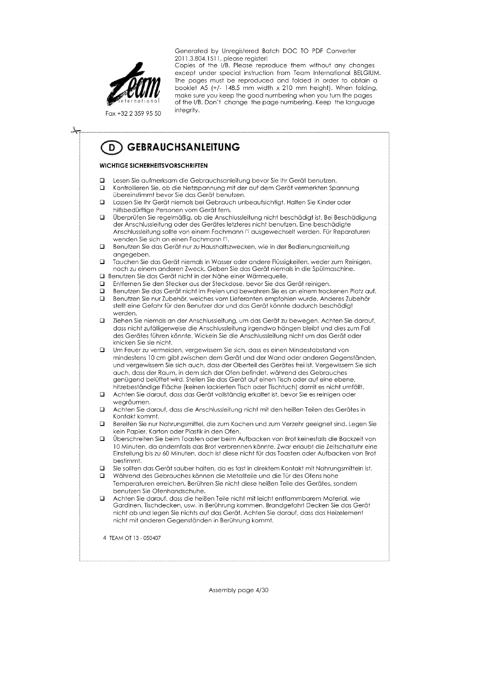 Packen Sie das Gerät sowie alle Zubehörteile aus, waschen Sie die Zubehörteile und trocknen Sie sie ab. Bei Erstgebrauch kann es vorkommen, dass ein wenig Rauch oder ein unangenehmer Geruch entstehen, dies ist bei der ersten Benutzung normal. Benutzen Sie Ihr Gerät daher erst einmal einige Minuten ohne Inhalt. BENUTZUNG Beim ersten Gebrauch das Gerät mit einem feuchten Tuch säubern und trocknen. Das Blech mit Margarine, Butter oder anderem Fett einfetten. Schieben Sie die Krümelauffangschale unter die unteren Heizelemente. Stellen Sie den Funktionswähler auf (OFF). Schließen Sie den Netzstecker an eine entsprechende Steckdose an. Stellen Sie die Art der Heizung am Funktionswahlschalter ein. - : nur Unterhitze um die Vorbereitung aufzuheizen ohne Grill. - : nur Oberhitze um die Vorbereitung zu grillen. - : Unter- und Oberhitze um die Vorbereitung gleichzeitig aufzuheizen und zu grillen. Wählen Sie am die Temperatur am Thermostat. Stellen Sie den Timer auf die gewünschte Backzeit ein. Die Backzeit läuft erst dann, wenn Sie eine Backzeit eingestellt haben. Die Kontrollleuchte leuchtet auf. Ein akustisches Signal ertönt nach Ablauf der Backzeit. Das Gerät schaltet automatisch ab. Sie können den Backvorgang auch jederzeit vorzeitig beenden, indem Sie den Timer auf Position “0” stellen.Generated by Unregistered Batch DOC TO PDF Converter 2011.3.804.1511, please register! Copies of the I/B. Please reproduce them without any changes except under special instruction from Team International BELGIUM. The pages must be reproduced and folded in order to obtain a booklet A5 (+/- 148.5 mm width x 210 mm height). When folding, make sure you keep the good numbering when you turn the pages of the I/B. Don’t change the page numbering. Keep the language integrity.