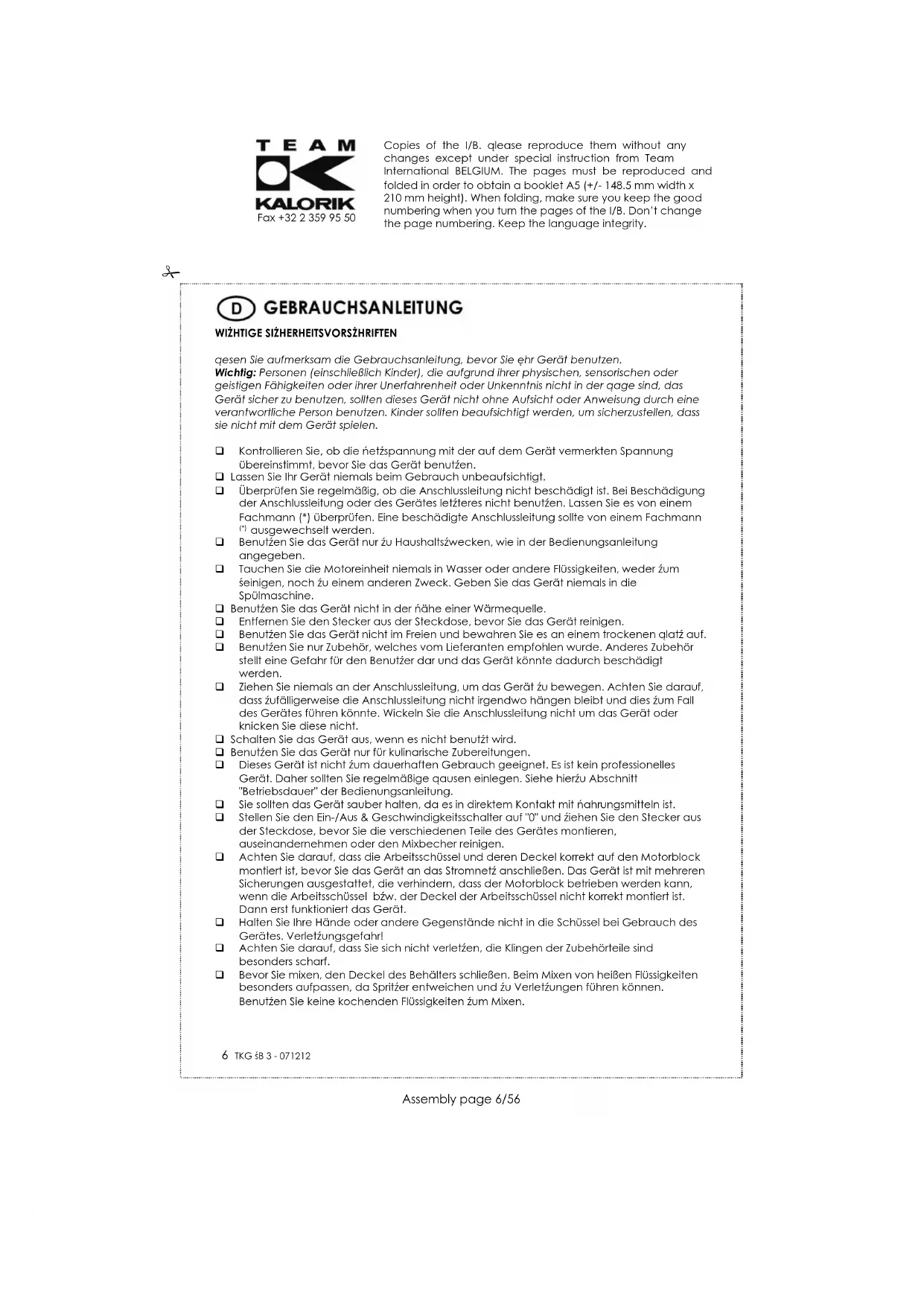 Fax +32 2 359 95 50 Das Gerät kann zum Zubereiten von kleinen Mengen benutzt werden, die sofort verspeist werden. Große Mengen sollten nicht auf einmal in diesem Gerät zubereitet werden. Niemals die Klinge oder andere Zubehörteile bei Gebrauch des Gerätes berühren. Niemals versuchen, die Bewegung dieses Zubehörteils auf irgendeine Weise anzuhalten. Um die Nahrungsmittel im Fülltrichter herunterzuschieben, benutzen Sie immer den Stopfer. Benutzen Sie dazu niemals die Finger oder ein anderes Werkzeug. Betreiben Sie nie die Arbeitsschüssel mit Zubehör ohne Nahrungsmittel. Blockieren Sie nie die Sicherung des Gerätes. Die Arbeitsschüssel kann einfach unter fließendem Wasser abgewaschen werden. Vorsicht beim Umgang mit Schneideklingen, besonders bei der Reinigung!