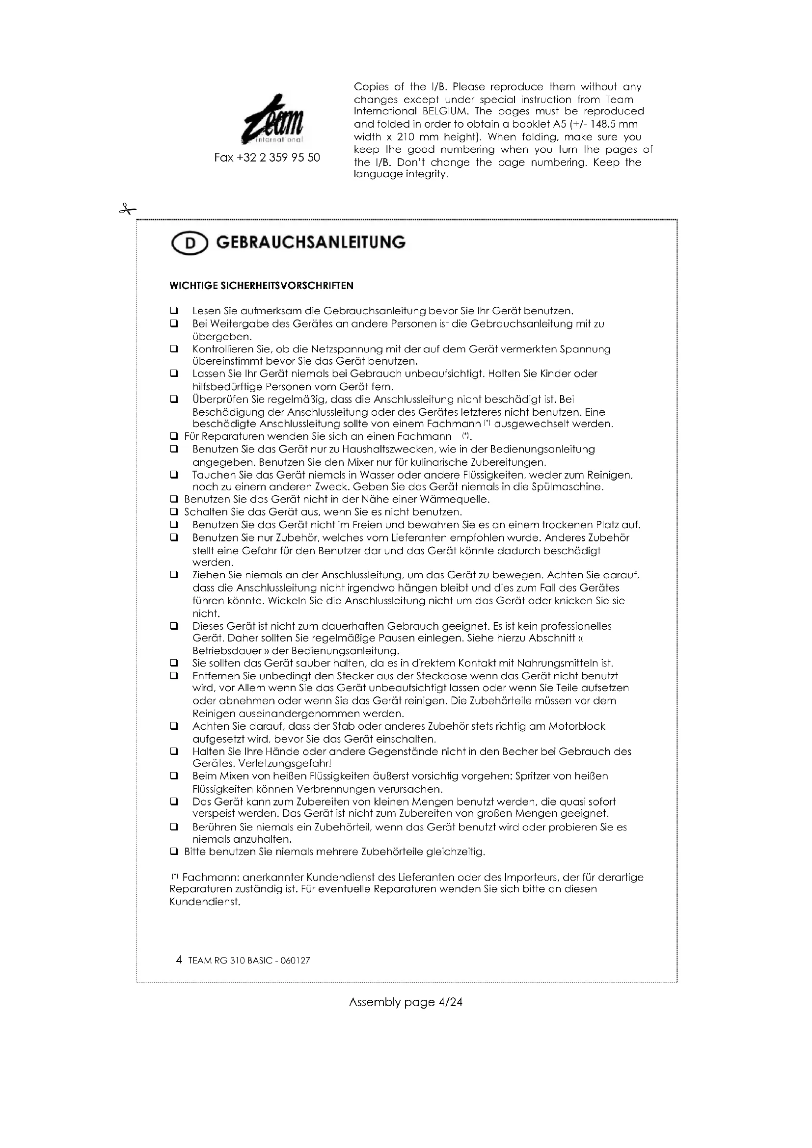 Laden Sie die Anleitung für Ihr Küchenmaschine kostenlos im PDF-Format! Finden Sie Ihr Handbuch RG 310 Basic - TEAM und nehmen Sie Ihr elektronisches Gerät wieder in die Hand. Auf dieser Seite sind alle Dokumente veröffentlicht, die für die Verwendung Ihres Geräts notwendig sind. RG 310 Basic von der Marke TEAM.