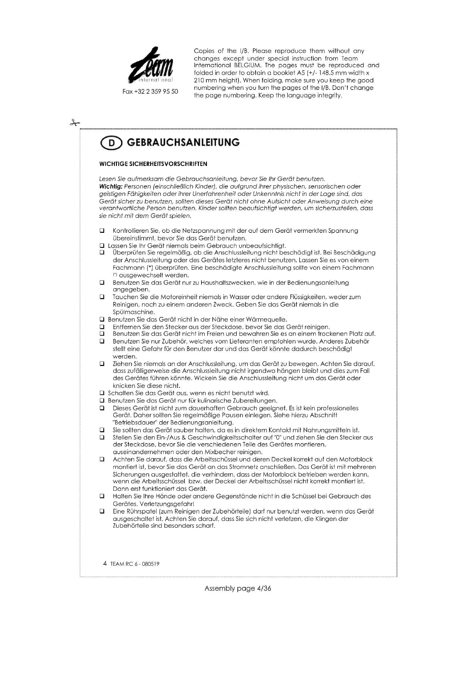 ausgewechselt werden. Benutzen Sie das Gerät nur zu Haushaltszwecken, wie in der Bedienungsanleitung angegeben. Tauchen Sie die Motoreinheit niemals in Wasser oder andere Flüssigkeiten, weder zum Reinigen, noch zu einem anderen Zweck. Geben Sie das Gerät niemals in die Spülmaschine. Benutzen Sie das Gerät nicht in der Nähe einer Wärmequelle. Entfernen Sie den Stecker aus der Steckdose, bevor Sie das Gerät reinigen. Benutzen Sie das Gerät nicht im Freien und bewahren Sie es an einem trockenen Platz auf. Benutzen Sie nur Zubehör, welches vom Lieferanten empfohlen wurde. Anderes Zubehör stellt eine Gefahr für den Benutzer dar und das Gerät könnte dadurch beschädigt werden. Ziehen Sie niemals an der Anschlussleitung, um das Gerät zu bewegen. Achten Sie darauf, dass zufälligerweise die Anschlussleitung nicht irgendwo hängen bleibt und dies zum Fall des Gerätes führen könnte. Wickeln Sie die Anschlussleitung nicht um das Gerät oder knicken Sie diese nicht. Schalten Sie das Gerät aus, wenn es nicht benutzt wird. Benutzen Sie das Gerät nur für kulinarische Zubereitungen. Dieses Gerät ist nicht zum dauerhaften Gebrauch geeignet. Es ist kein professionelles Gerät. Daher sollten Sie regelmäßige Pausen einlegen. Siehe hierzu Abschnitt "Betriebsdauer" der Bedienungsanleitung. Sie sollten das Gerät sauber halten, da es in direktem Kontakt mit Nahrungsmitteln ist. Stellen Sie den Ein-/Aus & Geschwindigkeitsschalter auf "0" und ziehen Sie den Stecker aus der Steckdose, bevor Sie die verschiedenen Teile des Gerätes montieren, auseinandernehmen oder den Mixbecher reinigen. Achten Sie darauf, dass die Arbeitsschüssel und deren Deckel korrekt auf den Motorblock montiert ist, bevor Sie das Gerät an das Stromnetz anschließen. Das Gerät ist mit mehreren Sicherungen ausgestattet, die verhindern, dass der Motorblock betrieben werden kann, wenn die Arbeitsschüssel bzw. der Deckel der Arbeitsschüssel nicht korrekt montiert ist. Dann erst funktioniert das Gerät. Halten Sie Ihre Hände oder andere Gegenstände nicht in die Schüssel bei Gebrauch des Gerätes. Verletzungsgefahr! Eine Rührspatel (zum Reinigen der Zubehörteile) darf nur benutzt werden, wenn das Gerät ausgeschaltet ist. Achten Sie darauf, dass Sie sich nicht verletzen, die Klingen der Zubehörteile sind besonders scharf. Copies of the I/B. Please reproduce them without any changes except under special instruction from Team International BELGIUM. The pages must be reproduced and folded in order to obtain a booklet A5 (+/- 148.5 mm width x 210 mm height). When folding, make sure you keep the good numbering when you turn the pages of the I/B. Don’t change the page numbering. Keep the language integrity.