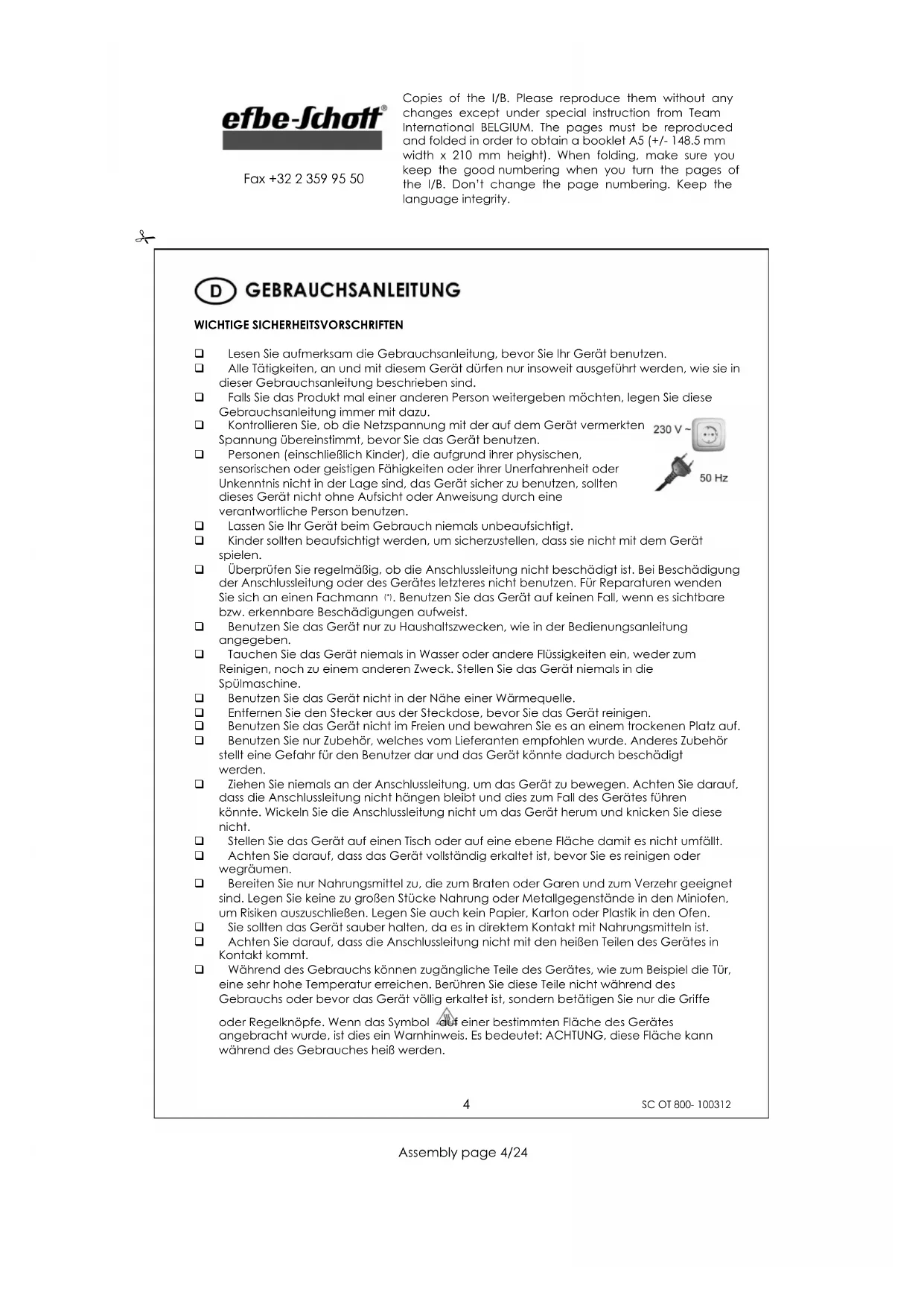 Fax +32 2 359 95 50 Achten Sie darauf, dass die heißen Teile nicht mit leicht entflammbarem Material, wie Gardinen, Tischdecken, usw. in Berührung kommen. Brandgefahr! Decken Sie das Gerät nicht ab und legen Sie nichts auf das Gerät. Achten Sie darauf, dass das Heizelement nicht mit anderen Gegenständen in Berührung kommt. Wir empfehlen Ihnen, eine wärmedämmende Unterlage zu benutzen (damit keine Flecken auf dem Untergrund entstehen können). Öl- und Fettzubereitungen können bei Überhitzung brennen. Seien Sie äußerst vorsichtig. Überschreiten Sie beim Toasten oder beim Aufbacken von Brot keinesfalls die Backzeit von 10 Minuten, da andernfalls das Brot verbrennen könnte. Zwar erlaubt die Zeitschaltuhr eine Einstellung von 60 Minuten, doch ist diese nicht für das Toasten oder Aufbacken von Brot bestimmt. Achtung: Halten Sie einen seitlichen Abstand von mindestens 10 cm, oberhalb des Gerätes einen Abstand von mindestens 25 cm ein. Bedecken Sie niemals die Lüftungsschlitze und sorgen Sie für ausreichende Luftzirkulation. Ihr Gerät darf niemals über eine externe Zeitschaltuhr oder irgendein anderes, separates Fernbedienungssystem eingeschaltet werden.