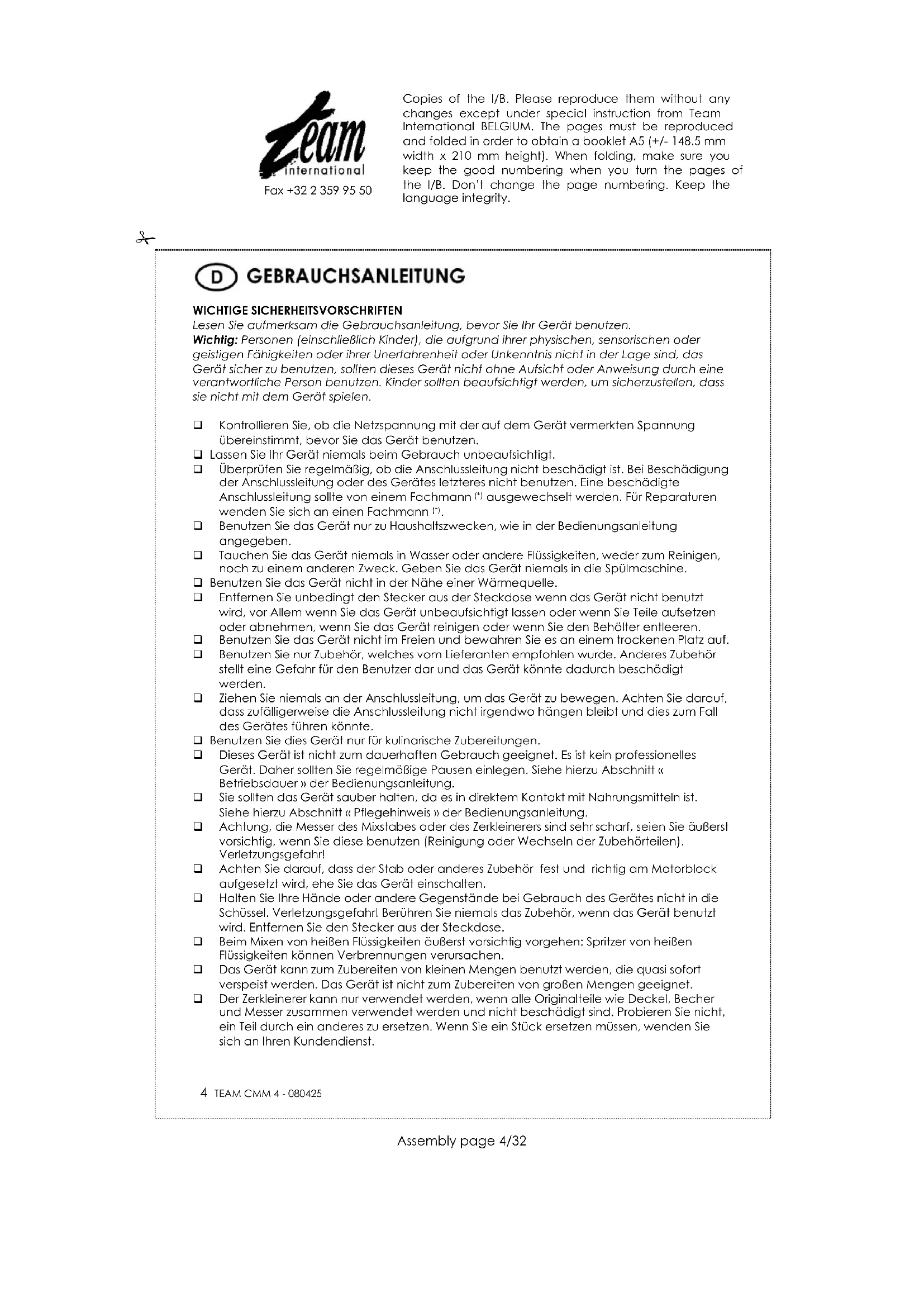 Benutzen Sie das Gerät nur zu Haushaltszwecken, wie in der Bedienungsanleitung angegeben. Tauchen Sie das Gerät niemals in Wasser oder andere Flüssigkeiten, weder zum Reinigen, noch zu einem anderen Zweck. Geben Sie das Gerät niemals in die Spülmaschine. Benutzen Sie das Gerät nicht in der Nähe einer Wärmequelle. Entfernen Sie unbedingt den Stecker aus der Steckdose wenn das Gerät nicht benutzt wird, vor Allem wenn Sie das Gerät unbeaufsichtigt lassen oder wenn Sie Teile aufsetzen oder abnehmen, wenn Sie das Gerät reinigen oder wenn Sie den Behälter entleeren. Benutzen Sie das Gerät nicht im Freien und bewahren Sie es an einem trockenen Platz auf. Benutzen Sie nur Zubehör, welches vom Lieferanten empfohlen wurde. Anderes Zubehör stellt eine Gefahr für den Benutzer dar und das Gerät könnte dadurch beschädigt werden. Ziehen Sie niemals an der Anschlussleitung, um das Gerät zu bewegen. Achten Sie darauf, dass zufälligerweise die Anschlussleitung nicht irgendwo hängen bleibt und dies zum Fall des Gerätes führen könnte. Benutzen Sie dies Gerät nur für kulinarische Zubereitungen. Dieses Gerät ist nicht zum dauerhaften Gebrauch geeignet. Es ist kein professionelles Gerät. Daher sollten Sie regelmäßige Pausen einlegen. Siehe hierzu Abschnitt « Betriebsdauer » der Bedienungsanleitung. Sie sollten das Gerät sauber halten, da es in direktem Kontakt mit Nahrungsmitteln ist. Siehe hierzu Abschnitt « Pflegehinweis » der Bedienungsanleitung. Achtung, die Messer des Mixstabes oder des Zerkleinerers sind sehr scharf, seien Sie äußerst vorsichtig, wenn Sie diese benutzen (Reinigung oder Wechseln der Zubehörteilen). Verletzungsgefahr! Achten Sie darauf, dass der Stab oder anderes Zubehör fest und richtig am Motorblock aufgesetzt wird, ehe Sie das Gerät einschalten. Halten Sie Ihre Hände oder andere Gegenstände bei Gebrauch des Gerätes nicht in die Schüssel. Verletzungsgefahr! Berühren Sie niemals das Zubehör, wenn das Gerät benutzt wird. Entfernen Sie den Stecker aus der Steckdose. Beim Mixen von heißen Flüssigkeiten äußerst vorsichtig vorgehen: Spritzer von heißen Flüssigkeiten können Verbrennungen verursachen. Das Gerät kann zum Zubereiten von kleinen Mengen benutzt werden, die quasi sofort verspeist werden. Das Gerät ist nicht zum Zubereiten von großen Mengen geeignet. Der Zerkleinerer kann nur verwendet werden, wenn alle Originalteile wie Deckel, Becher und Messer zusammen verwendet werden und nicht beschädigt sind. Probieren Sie nicht, ein Teil durch ein anderes zu ersetzen. Wenn Sie ein Stück ersetzen müssen, wenden Sie sich an Ihren Kundendienst. Copies of the I/B. Please reproduce them without any changes except under special instruction from Team International BELGIUM. The pages must be reproduced and folded in order to obtain a booklet A5 (+/- 148.5 mm width x 210 mm height). When folding, make sure you keep the good numbering when you turn the pages of the I/B. Don’t change the page numbering. Keep the language integrity.