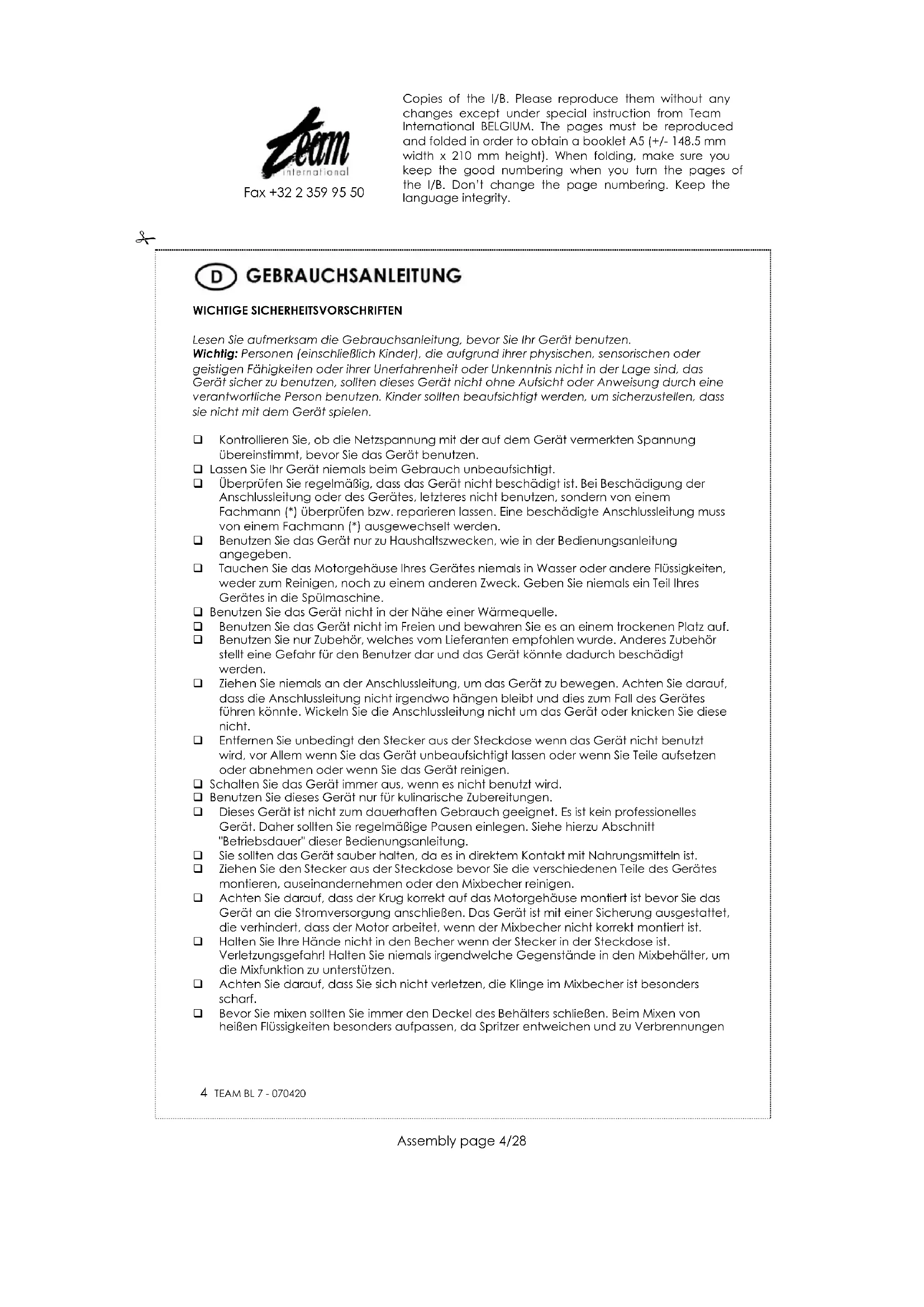 WICHTIGE SICHERHEITSVORSCHRIFTEN Lesen Sie aufmerksam die Gebrauchsanleitung, bevor Sie Ihr Gerät benutzen. Wichtig: Personen (einschließlich Kinder), die aufgrund ihrer physischen, sensorischen oder geistigen Fähigkeiten oder ihrer Unerfahrenheit oder Unkenntnis nicht in der Lage sind, das Gerät sicher zu benutzen, sollten dieses Gerät nicht ohne Aufsicht oder Anweisung durch eine verantwortliche Person benutzen. Kinder sollten beaufsichtigt werden, um sicherzustellen, dass sie nicht mit dem Gerät spielen. Kontrollieren Sie, ob die Netzspannung mit der auf dem Gerät vermerkten Spannung übereinstimmt, bevor Sie das Gerät benutzen. Lassen Sie Ihr Gerät niemals beim Gebrauch unbeaufsichtigt. Überprüfen Sie regelmäßig, dass das Gerät nicht beschädigt ist. Bei Beschädigung der Anschlussleitung oder des Gerätes, letzteres nicht benutzen, sondern von einem Fachmann (*) überprüfen bzw. reparieren lassen. Eine beschädigte Anschlussleitung muss von einem Fachmann (*) ausgewechselt werden. Benutzen Sie das Gerät nur zu Haushaltszwecken, wie in der Bedienungsanleitung angegeben. Tauchen Sie das Motorgehäuse Ihres Gerätes niemals in Wasser oder andere Flüssigkeiten, weder zum Reinigen, noch zu einem anderen Zweck. Geben Sie niemals ein Teil Ihres Gerätes in die Spülmaschine. Benutzen Sie das Gerät nicht in der Nähe einer Wärmequelle. Benutzen Sie das Gerät nicht im Freien und bewahren Sie es an einem trockenen Platz auf. Benutzen Sie nur Zubehör, welches vom Lieferanten empfohlen wurde. Anderes Zubehör stellt eine Gefahr für den Benutzer dar und das Gerät könnte dadurch beschädigt werden. Ziehen Sie niemals an der Anschlussleitung, um das Gerät zu bewegen. Achten Sie darauf, dass die Anschlussleitung nicht irgendwo hängen bleibt und dies zum Fall des Gerätes führen könnte. Wickeln Sie die Anschlussleitung nicht um das Gerät oder knicken Sie diese nicht. Entfernen Sie unbedingt den Stecker aus der Steckdose wenn das Gerät nicht benutzt wird, vor Allem wenn Sie das Gerät unbeaufsichtigt lassen oder wenn Sie Teile aufsetzen oder abnehmen oder wenn Sie das Gerät reinigen. Schalten Sie das Gerät immer aus, wenn es nicht benutzt wird. Benutzen Sie dieses Gerät nur für kulinarische Zubereitungen. Dieses Gerät ist nicht zum dauerhaften Gebrauch geeignet. Es ist kein professionelles Gerät. Daher sollten Sie regelmäßige Pausen einlegen. Siehe hierzu Abschnitt "Betriebsdauer" dieser Bedienungsanleitung. Sie sollten das Gerät sauber halten, da es in direktem Kontakt mit Nahrungsmitteln ist. Ziehen Sie den Stecker aus der Steckdose bevor Sie die verschiedenen Teile des Gerätes montieren, auseinandernehmen oder den Mixbecher reinigen. Achten Sie darauf, dass der Krug korrekt auf das Motorgehäuse montiert ist bevor Sie das Gerät an die Stromversorgung anschließen. Das Gerät ist mit einer Sicherung ausgestattet, die verhindert, dass der Motor arbeitet, wenn der Mixbecher nicht korrekt montiert ist. Halten Sie Ihre Hände nicht in den Becher wenn der Stecker in der Steckdose ist. Verletzungsgefahr! Halten Sie niemals irgendwelche Gegenstände in den Mixbehälter, um die Mixfunktion zu unterstützen. Achten Sie darauf, dass Sie sich nicht verletzen, die Klinge im Mixbecher ist besonders scharf. Bevor Sie mixen sollten Sie immer den Deckel des Behälters schließen. Beim Mixen von heißen Flüssigkeiten besonders aufpassen, da Spritzer entweichen und zu Verbrennungen Copies of the I/B. Please reproduce them without any changes except under special instruction from Team International BELGIUM. The pages must be reproduced and folded in order to obtain a booklet A5 (+/- 148.5 mm width x 210 mm height). When folding, make sure you keep the good numbering when you turn the pages of the I/B. Don’t change the page numbering. Keep the language integrity.
