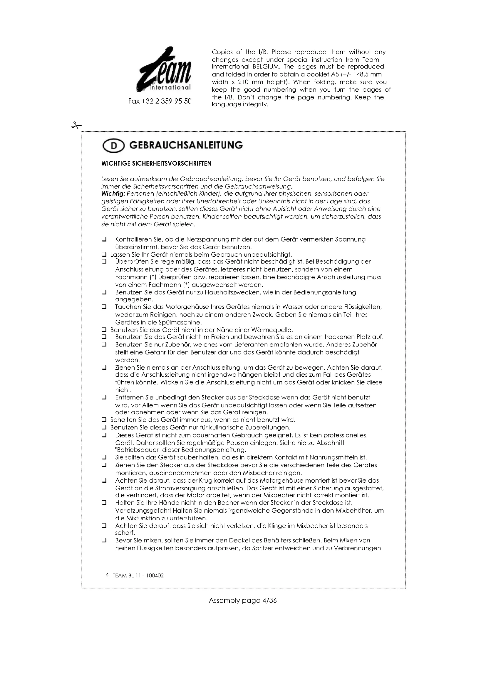 Zum Schutz unserer Umwelt und unserer Gesundheit sind Elektro- und Elektronik-Altgeräte nach bestimmten Regeln zu entsorgen. Dies fordert den Einsatz sowohl des Herstellers bzw. Lieferanten als auch des Verbrauchers. Aus diesem Grund darf dieses Gerät, wie das Symbol auf dem Typenschild bzw. auf der Verpackung zeigt, nicht in den unsortierten Restmüll gegeben werden. Der Verbraucher hat das Recht, dieses Gerät über kommunale Sammelstellen zu entsorgen; von dort aus wird die spezifische Behandlung, Verwertung bzw. das Recycling gem. den Erfordernissen der Richtlinie sichergestellt. Copies of the I/B. Please reproduce them without any changes except under special instruction from Team International BELGIUM. The pages must be reproduced and folded in order to obtain a booklet A5 (+/- 148.5 mm width x 210 mm height). When folding, make sure you keep the good numbering when you turn the pages of the I/B. Don’t change the page numbering. Keep the language integrity.