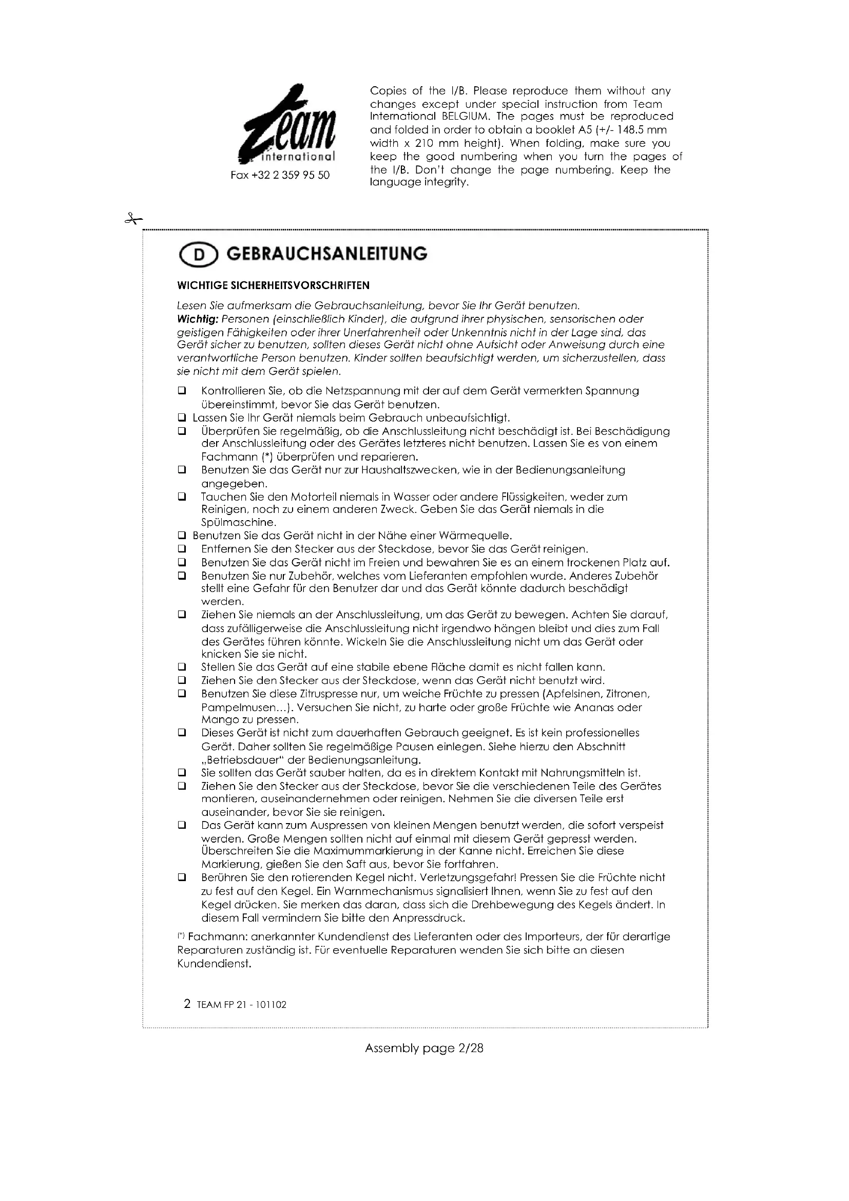 Setzen Sie bitte den transparenten Behälter auf die Achse, die aus dem Motorblock herausragt. Dazu drehen Sie ihn ca. 90° in Uhrzeigerrichtung, bis er zum Anschlag kommt. Achtung: Ihr Gerät hat zwei Presskegel von unterschiedlicher Größe (einen kleinen und einen großen) die ineinander passen und die Sie benutzen können je nach der Größe der Zitrusfrüchte. Falls Sie den kleinen Presskegel benutzen wollen, entfernen Sie den großen Presskegel. Falls Sie den großen Presskegel benutzen wollen, brauchen Sie zuerst den kleinen Presskegel zu setzen. Setzen Sie dann bitte das Sieb und den Presskegel von oben auf die Achse in den Behälter. Falls gewünscht können Sie die Größe der Ablauflöcher im Sieb anpassen. Je kleiner die Ablauflöcher sind, desto weniger Fruchtfleisch gibt es im Saft. Schneiden Sie die Zitrusfrucht in der Hälfte durch und drücken Sie die Frucht mit dem Fruchtfleisch auf den Kegel. Wenn Sie die Früchte auf den Presskegel drücken, beginnt er sich zu drehen. Wenn sich die Drehrichtung ändert, bedeutet das, dass der Druck auf den Kegel zu stark ist oder dass die Frucht zu hart ist. (Vermindern Sie leicht den Druck um zu kontrollieren, ob die ursprüngliche Drehrichtung wieder aufgenommen wird. Falls das nicht der Fall ist, hören Sie bitte auf. Wenn Sie aufhören auf den Kegel zu drücken, hört die Rotation automatisch auf.) Um den Fruchtsaft zu servieren, fassen Sie den Behälter am Griff und drehen Sie ihn ca. 90° entgegen der Uhrzeigerrichtung. Nun nehmen Sie den Presskegel und das Sieb von dem transparenten Behälter. In dem Behälter befindet sich der reine Saft, weil Fruchtfleisch und Kerne auf dem Sieb zurückbleiben. Die Zitruspresse hat einen Deckel, den Sie aus hygienischen Gründen nach der Reinigung auf das Sieb setzen müssen. Während des Aufräumens können Sie auch die Anschlussleitung um den Sockel aufrollen und in das dafür vorgesehene Gehäuse stecken. REINIGUNG Nehmen Sie das Zubehör des Gerätes (transparenten Behälter, Sieb und Kegel) auseinander, wie früher erklärt. Reinigen Sie das Zubehör des Gerätes in Seifenwasser und spülen Sie es in klarem Wasser ab. Stellen Sie die Zubehörteile nicht in die Spülmaschine. Bitte den Motorblock nie in die Spülmaschine stellen, sondern nur mit einem feuchten Tuch reinigen wenn nötig. Copies of the I/B. Please reproduce them without any changes except under special instruction from Team International BELGIUM. The pages must be reproduced and folded in order to obtain a booklet A5 (+/- 148.5 mm width x 210 mm height). When folding, make sure you keep the good numbering when you turn the pages of the I/B. Don’t change the page numbering. Keep the language integrity.