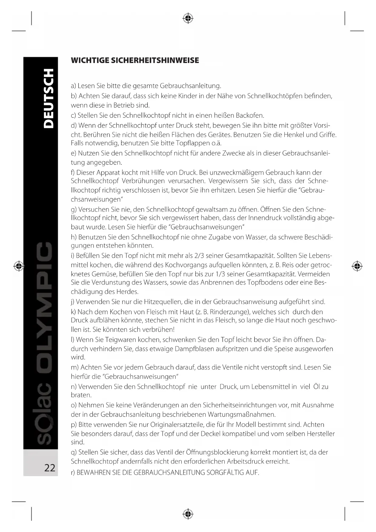 f) Dieser Apparat kocht mit Hilfe von Druck. Bei unzweckmäßigem Gebrauch kann der Schnellkochtopf Verbrühungen verursachen. Vergewisern Sie sich, dass der Schnellkochtopf richtig verschlossen ist, bevor Sieihn erhitzen. Lesen Sie hierfür die "Gebrauchsanweisungen"