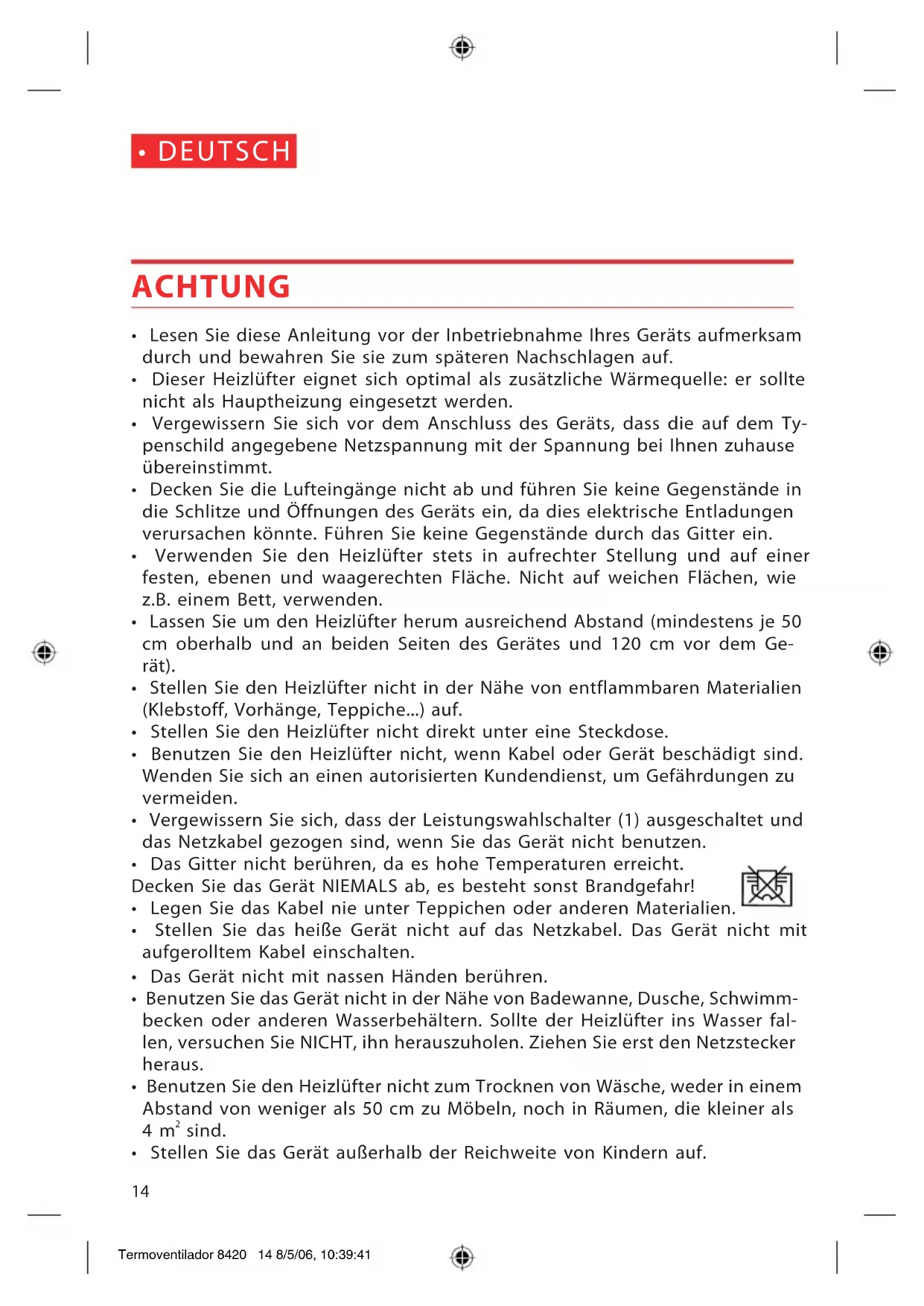 - Benutzen Sie den Heizlüfter nicht, wenn Kabel oder Gerät beschädigt sind. Wenden Sie sich an einen autorisierten Kundendienst, um Gefährdungen zu vermeiden.