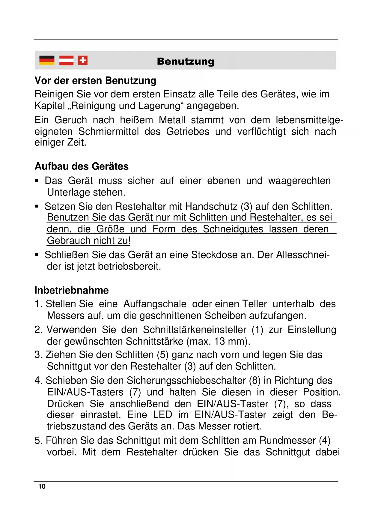 Vor der ersten Benutzung Reinigen Sie vor dem ersten Einsatz alle Teile des Gerätes, wie im Kapitel „Reinigung und Lagerung“ angegeben. Ein Geruch nach heißem Metall stammt von dem lebensmittelge- eigneten Schmiermittel des Getriebes und verflüchtigt sich nach einiger Zeit. Aufbau des Gerätes Das Gerät muss sicher auf einer ebenen und waagerechten Unterlage stehen. Setzen Sie den Restehalter mit Handschutz (3) auf den Schlitten. Benutzen Sie das Gerät nur mit Schlitten und Restehalter, es sei denn, die Größe und Form des Schneidgutes lassen deren Gebrauch nicht zu! Schließen Sie das Gerät an eine Steckdose an. Der Allesschnei- der ist jetzt betriebsbereit. Inbetriebnahme