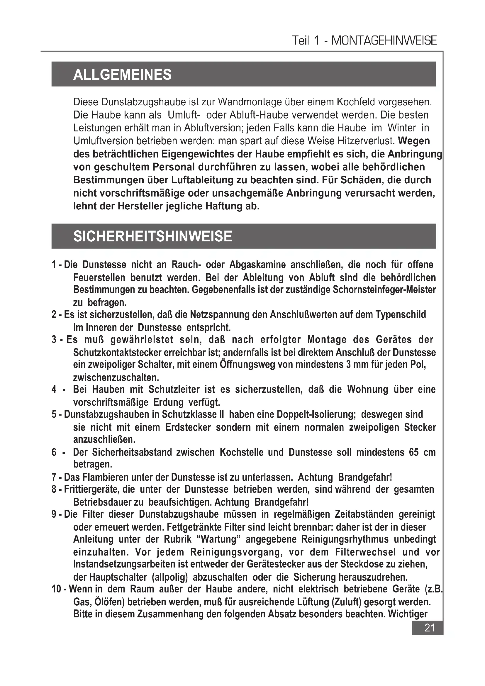 Teil 1 - MONTAGEHINWEISE ALLGEMEINES Diese Dunstabzugshaube ist zur Wandmontage über einem Kochfeld vorgesehen. Die Haube kann als Umluft- oder Abluft-Haube verwendet werden. Die besten Leistungen erhält man in Abluftversion; jeden Falls kann die Haube im Winter in Umluftversion betrieben werden: man spart auf diese Weise Hitzerverlust. Wegen des beträchtlichen Eigengewichtes der Haube empfiehlt es sich, die Anbringung von geschultem Personal durchführen zu lassen, wobei alle behördlichen Bestimmungen über Luftableitung zu beachten sind. Für Schäden, die durch nicht vorschriftsmäßige oder unsachgemäße Anbringung verursacht werden, lehnt der Hersteller jegliche Haftung ab. SICHERHEITSHINWEISE