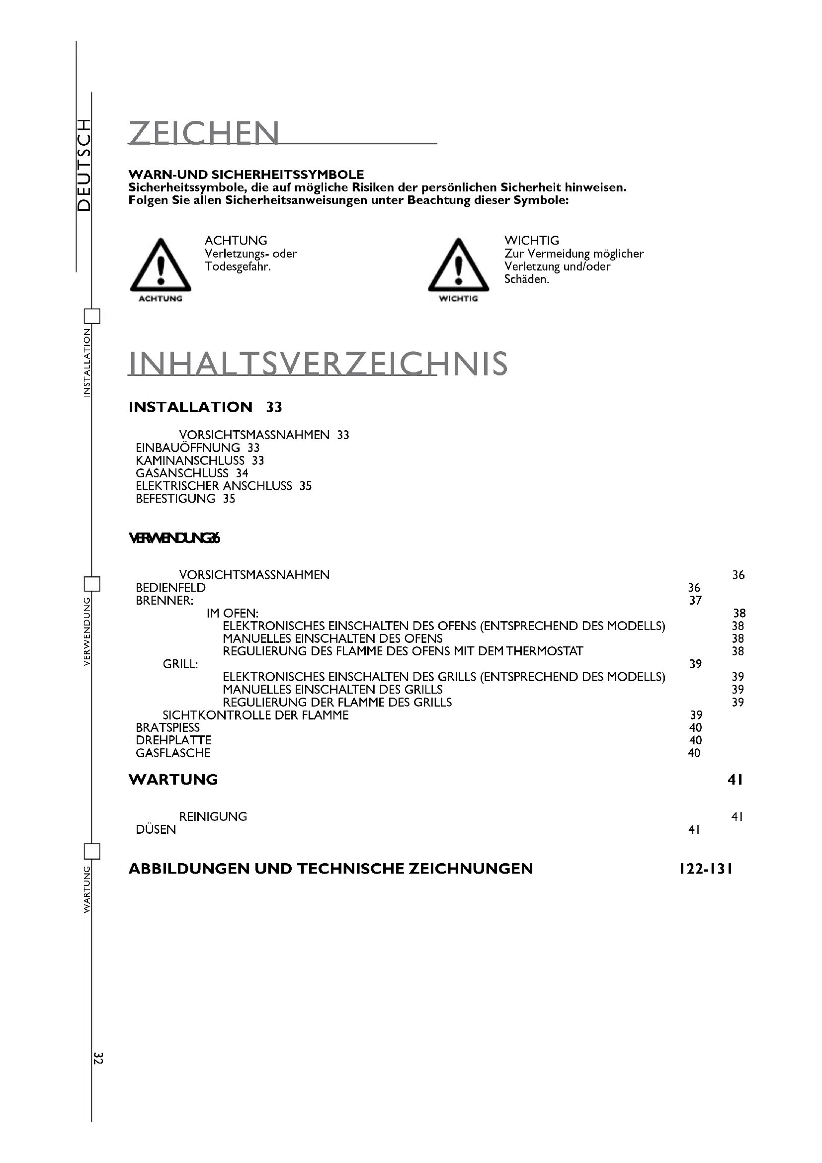 ACHTUNG Verletzungs- oder Todesgefahr. WICHTIG Zur Vermeidung möglicher Verletzung und/oder Schäden. 32INSTALLATIONVERWENDUNG WARTUNG