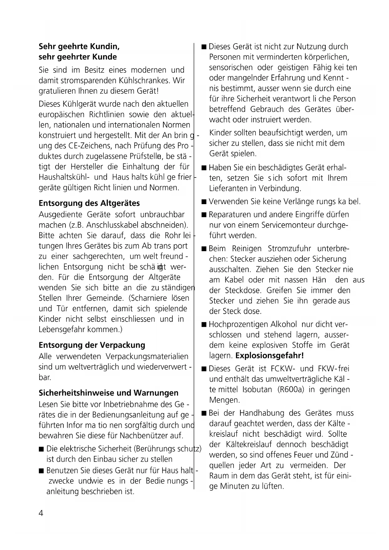das Kühlsystem. Dabei entstehen Betriebs - geräusche. Auch nach dem Ausschalten des Kom pres sors sind Geräusche durch Druck- und Tem peraturunterschiede unvermeidbar. Dieses Gerät ist nach dem neuesten Stand der Entwicklung, mit einem leisen Kom - pressor u nd einem geräuschoptimierten Kältekreis ausgestattet. Dennoch lassen sich bestimmte Geräusche nicht ganz vermeiden und sind in ihrer Laut - stärke abhängig von der Geräte grösse und Einbausituation. Unmittelbar nach dem Einschalten des Kom - pressors sind die Betriebsgeräusche am besten hörbar. Sie werden mit fortschreitender Betriebs - dauer leiser. Nicht normale Geräusche Meist entstehen ungewöhnliche Geräu sche durch einen ungeeigneten Einbau. Das Gerät muss waagerecht und stabil auf- gestellt bzw. eingebaut sein. Rohrleitungen dürfen auf keinen Fall an einer Wand oder anderen Möbeln anste- hen. Auch dürfen die Rohrleitungen sich nicht gegenseitig berühren. In offenen Küchen oder bei in Raumteiler eingebauten Geräten werden die norma- len Betriebsgeräusche intensiver wahrge- nommen. Dies ist jedoch kein Mangel son- dern bedingt durch die Architektur. Stichwort Ursache Bemerkung Brummen Kälteaggregat normales Arbeitsgeräusch des Kälteaggregates, Lautstärke abhängig von der Gerätegrösse und von der lastabhängigen Drehzahl des Kompressormotors Surren Ventilator normales Betriebsgeräusch, durch Belüftung Gurgeln Kältekreislauf normales Betriebgeräusch, durch Strömung des Blubbern Kältemittels im Kältekreis Rauschen Zischen Kältekreislauf normales Betriebsgeräusch durch Einspritzen des Kältemittels in den Verdampfer Klappern Tablare, Körbe, Innenteile so anordnen, dass sie sich nicht berühren Einhängeschalen bzw. dass sie fixiert sind. Beladung etc. Knacken Gehäuse Normale, temperaturbedingte Spannungsdehnungen der Materialien z.B. Kunststoffe, Isolation Klicken Ventil Normales Schaltgeräusch des Ventils1415 Chère Cliente, Cher Client, Vous possédez un réfrigérateur moderne, consommant donc peu de courant. Nous vous félicitons de votre achat! Ce réfrigérateur a été conçu et fabriqué conformément aux directives européennes, aux normes nationales et internationales en vigueur. Avec l'apposition du marquage CE, après contrôle du produit par des organismes de contrôle agréés, le fabricant certifie le respect des n ormes et directives en vigueur relatives aux réfrigérateurs et aux congélateurs. Elimination de l’ancien appareil Rendre immédiatement inutilisables les appa