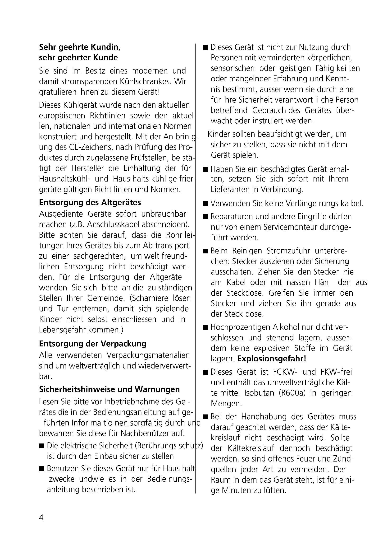 Instructions de sécurité et avertissements 17 Elément de commande et de contrôlé 19 Congélation 20 Contre-porte variable 21 Dégivrage 22 Compartiment réfrigérant 22 Nettoyage 23 Informations pour une utilisation économe en énergie 23 Conseils 24 Remplacement DEL 25 Pannes 25 Garantie 26 Bruits de fonctionnement 27 Encastrement / cotes3 Sommario Istruzioni per l’uso 28 Introduzione 28 Norme di sicurezza e avvertenze 29 Elementi di comando e di controllo 31 Congelamento 32 Retroporta variabile 33 Sbranimento 34 Vano frigorifero 34 Pulizia 35 Informazioni per un utilizzo attento al consumo 35 Consigli 36 Sostituzione della lampadina 37 Guasti 37 Garanzia 38 Rumori di funzionamento 39 Installazione / dimensioni Contents Operating instructions 40 Introduction 40 Safety information and warnings 41 Operating and Control Panel 43 Freezing 43 Variable inner doors 45 Defrosting 46 Refrigerator 46 Cleaning 46 Informations for energy-saving use 47 Tips 48 Replacing LED 49 Malfunctions 49 Guarantee 50 Operating noises 51 Installation / dimensions4 Sehr geehrte Kundin, sehr geehrter Kunde Sie sind im Besitz eines modernen und damit stromsparenden Kühlschrankes. Wir gratulieren Ihnen zu diesem Gerät! Dieses Kühlgerät wurde nach den aktuellen europäischen Richtlinien sowie den aktuel- len, nationalen und internationalen Normen konstruiert und hergestellt. Mit der An brin g- ung des CE-Zeichens, nach Prüfung des Pro- duktes durch zugelassene Prüfstellen, be stä- tigt der Hersteller die Einhaltung der für Haushaltskühl- und Haus halts kühl ge frier- geräte gültigen Richt linien und Normen. Entsorgung des Altgerätes Ausgediente Geräte sofort unbrauchbar machen (z.B. Anschlusskabel abschneiden). Bitte achten Sie darauf, dass die Rohr lei- tungen Ihres Gerätes bis zum Ab trans port zu einer sachgerechten, um welt freund- lichen Entsorgung nicht be schä digt wer- den. Für die Entsorgung der Altgeräte wenden Sie sich bitte an die zu ständigen Stellen Ihrer Gemeinde. (Scharniere lösen und Tür entfernen, damit sich spielende Kinder nicht selbst einschliessen und in Lebensgefahr kommen.) Entsorgung der Verpackung Alle verwendeten Verpackungsmaterialien sind um weltverträglich und wiederverwert- bar. Sicherheitshinweise und Warnungen Lesen Sie bitte vor Inbetriebnahme des Ge - rätes die in der Bedienungsanleitung auf ge- führten Infor ma tio nen sorgfältig durch und bewahren Sie diese für Nachbenützer auf.