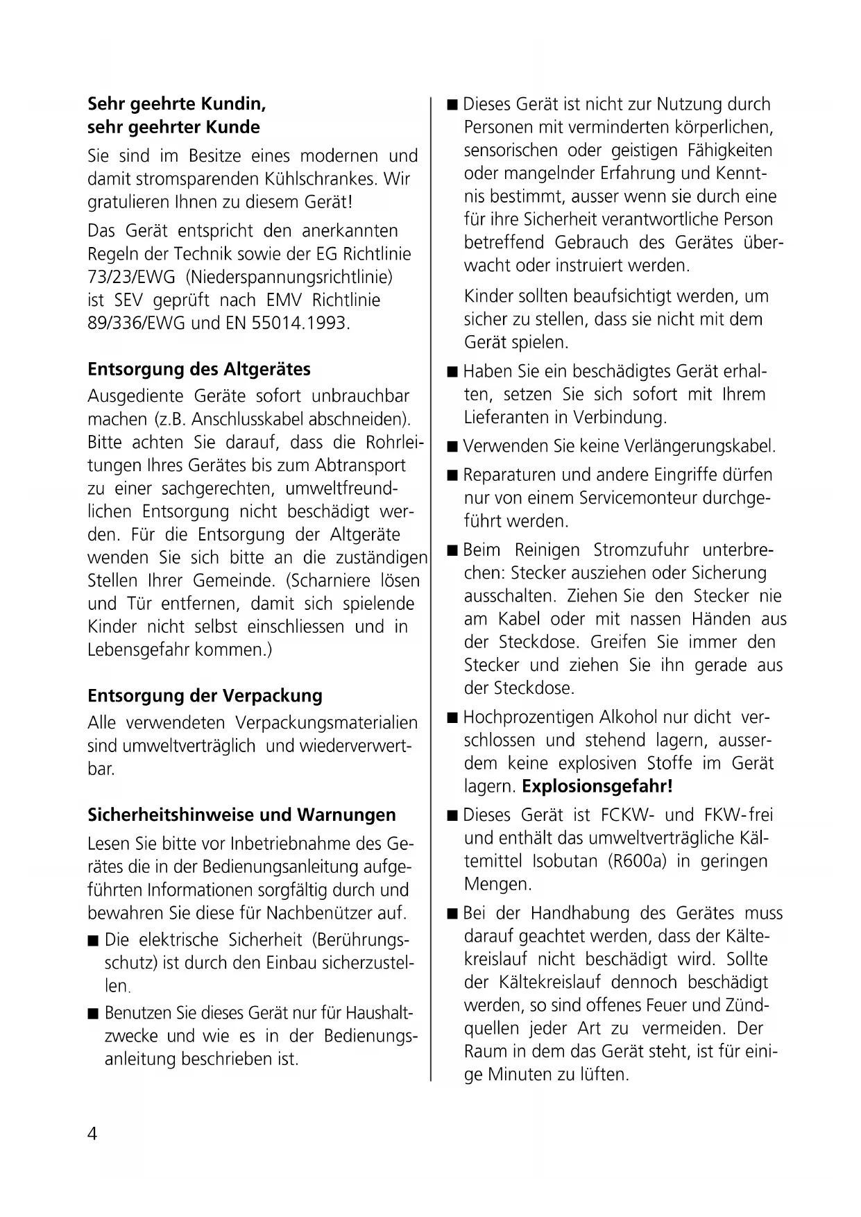 Instructions de sécurité et avertissements 14 Elément de commande et de contrôlé 15 Congélation 15 Contre-porte variable 16 Dégivrage 17 Compartiment réfrigérant 17 Nettoyage 17 Conseils 19 Remplacement DEL 19 Pannes 19 Garantie 20 Bruits de fonctionnement 21 Encastrement / cotes3 Sommario Istruzioni per l’uso 22 Introduzione 22 Norme di sicurezza e avvertenze 23 Elementi di comando e di controllo 24 Congelamento 24 Retroporta variabile 25 Scongelamento 26 Vano frigorifero 26 Pulizia 26 Consigli 27 Sostituzione della lampadina 28 Guasti 28 Garanzia 29 Rumori di funzionamento 30 Installazione / dimensioni Contents Operating instructions 31 Introduction 31 Safety information and warnings 32 Operating and Control Panel 33 Freezing 33 Variable inner doors 34 Defrosting 35 Refrigerator 35 Cleaning 35 Tips 36 Replacing LED 37 Malfunctions 37 Guarantee 38 Operating noises 39 Installation / dimensions4 Sehr geehrte Kundin, sehr geehrter Kunde Sie sind im Besitze eines modernen und damit stromsparenden Kühlschrankes. Wir gratulieren Ihnen zu diesem Gerät! Das Gerät entspricht den anerkannten Regeln der Technik sowie der EG Richtlinie 73/23/EWG (Niederspannungsrichtlinie) ist SEV geprüft nach EMV Richtlinie 89/336/EWG und EN 55014.1993. Entsorgung des Altgerätes Ausgediente Geräte sofort unbrauchbar machen (z.B. Anschlusskabel abschneiden). Bitte achten Sie darauf, dass die Rohrlei- tungen Ihres Gerätes bis zum Abtransport zu einer sachgerechten, umweltfreund- lichen Entsorgung nicht beschädigt wer- den. Für die Entsorgung der Altgeräte wenden Sie sich bitte an die zuständigen Stellen Ihrer Gemeinde. (Scharniere lösen und Tür entfernen, damit sich spielende Kinder nicht selbst einschliessen und in Lebensgefahr kommen.) Entsorgung der Verpackung Alle verwendeten Verpackungsmaterialien sind umweltverträglich und wiederverwert- bar. Sicherheitshinweise und Warnungen Lesen Sie bitte vor Inbetriebnahme des Ge- rätes die in der Bedienungsanleitung aufge- führten Informationen sorgfältig durch und bewahren Sie diese für Nachbenützer auf.