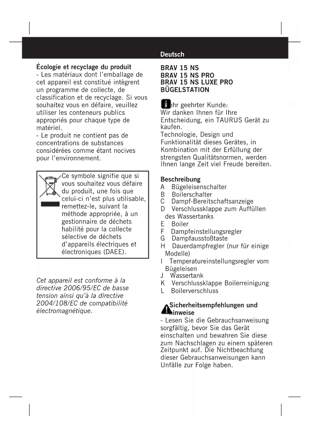 BÜGELSTATION Sehr geehrter Kunde: Wir danken Ihnen für Ihre Entscheidung, ein TAURUS Gerät zu kaufen. Technologie, Design und Funktionalität dieses Gerätes, in Kombination mit der Erfüllung der strengsten Qualitätsnormen, werden Ihnen lange Zeit viel Freude bereiten. Beschreibung A Bügeleisenschalter B Boilerschalter C Dampf-Bereitschaftsanzeige D Verschlussklappe zum Auffüllen des Wassertanks E Boiler F Dampfeinstellungsregler G Dampfausstoßtaste H Dauerdampfregler (nur für einige Modelle) I Temperatureinstellungsregler vom Bügeleisen J Wassertank K Verschlussklappe Boilerreinigung L Boilerverschluss Sicherheitsempfehlungen und –hinweise - Lesen Sie die Gebrauchsanweisung sorgfältig, bevor Sie das Gerät einschalten und bewahren Sie diese zum Nachschlagen zu einem späteren Zeitpunkt auf. Die Nichtbeachtung dieser Gebrauchsanweisungen kann Unfälle zur Folge haben. Anwendungs- oder Arbeitsumgebung: - Das Gerät muss zu seinem Gebrauch auf einer ebenen und stabilen Fläche abgestellt werden. - WARNUNG: Um Überhitzung zu vermeiden, decken Sie das Gerät nicht ab. Elektrische Sicherheit: - Das Gerät darf nicht mit beschädigtem elektrischen Kabel oder Stecker verwendet werden. - Vergewissern Sie sich, dass die Spannung auf dem Typenschild mit der Netzspannung übereinstimmt, bevor Sie den Apparat an das Stromnetz anschließen. - Das Gerät an einen Stromanschluss anschlieβen, der mindestens 10 Ampere liefert. - Der Stecker des Geräts muss mit dem Steckdosentyp des Stromanschlusses übereinstimmen. Der Stecker darf nicht verändert werden. Verwenden Sie keine Steckeradapter. - Das Gerät nicht benutzen, wenn es heruntergefallen ist, sichtbare Schäden aufweist oder undicht ist. - Elektrische Kabel nicht überbeanspruchen. Elektrische Kabel dürfen nicht zum Anheben, Transportieren oder Ausstecken des Geräts benützt werden. - Nachten Sie darauf, dass das elektrische Verbindungskabel nicht mit heißen Teilen des Geräts in Kontakt kommt. - Berühren Sie den Stecker nicht mit feuchten Händen. Gebrauch und Pflege: - Vor jedem Gebrauch des Geräts das Écologie et recyclage du produit - Les matériaux dont l’emballage de cet appareil est constitué intègrent un programme de collecte, de classification et de recyclage. Si vous souhaitez vous en défaire, veuillez utiliser les conteneurs publics appropriés pour chaque type de matériel. - Le produit ne contient pas de concentrations de substances considérées comme étant nocives pour l’environnement. Cet appareil est conforme à la directive 2006/95/EC de basse tension ainsi qu’à la directive 2004/108/EC de compatibilité électromagnétique. Ce symbole signifie que si vous souhaitez vous défaire du produit, une fois que celui-ci n’est plus utilisable, remettez-le, suivant la méthode appropriée, à un gestionnaire de déchets habilité pour la collecte sélective de déchets d’appareils électriques et électroniques (DAEE).BRAV 15 NS