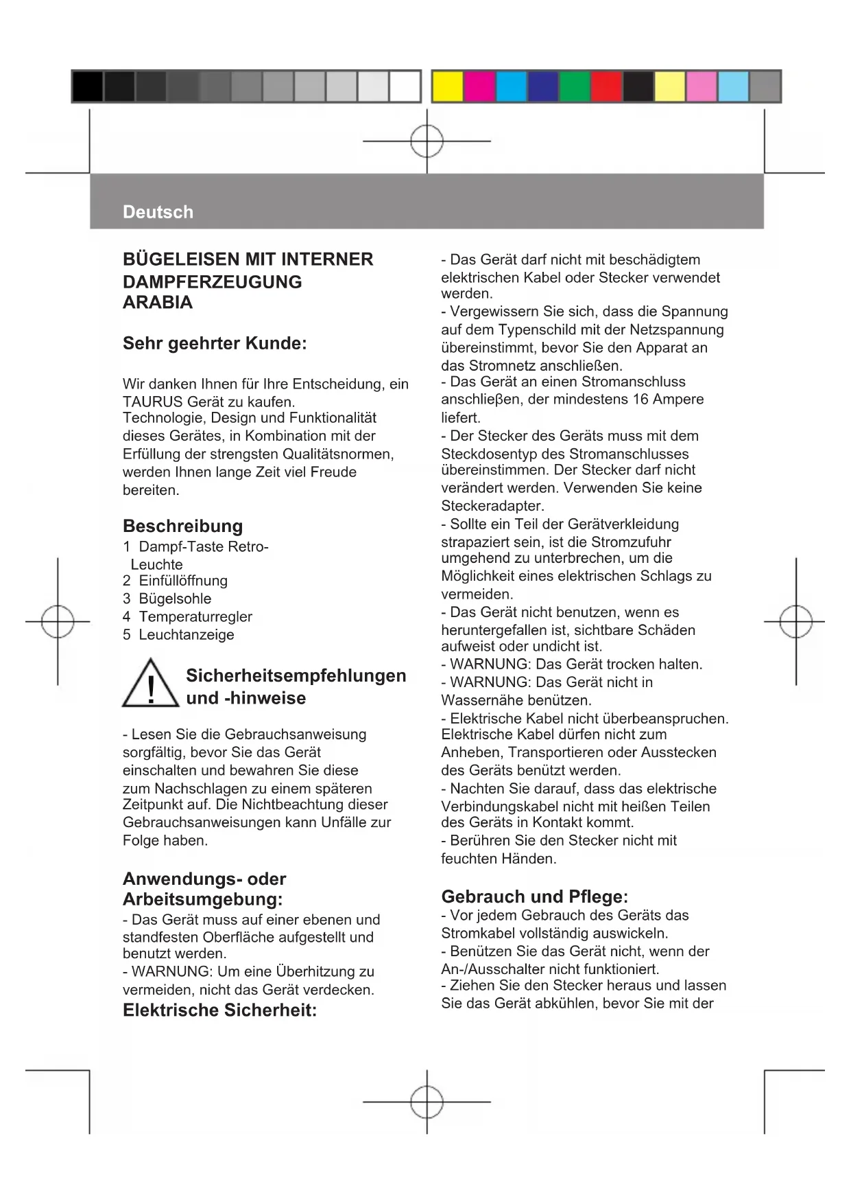 DAMPFERZEUGUNG ARABIA Sehr geehrter Kunde: Wir danken Ihnen für Ihre Entscheidung, ein TAURUS Gerät zu kaufen. Technologie, Design und Funktionalität dieses Gerätes, in Kombination mit der Erfüllung der strengsten Qualitätsnormen, werden Ihnen lange Zeit viel Freude bereiten. Beschreibung 1 Dampf-Taste Retro- Leuchte 2 Einfüllöffnung 3 Bügelsohle 4 Temperaturregler 5 Leuchtanzeige Sicherheitsempfehlungen und -hinweise - Lesen Sie die Gebrauchsanweisung sorgfältig, bevor Sie das Gerät einschalten und bewahren Sie diese zum Nachschlagen zu einem späteren Zeitpunkt auf. Die Nichtbeachtung dieser Gebrauchsanweisungen kann Unfälle zur Folge haben. Anwendungs- oder Arbeitsumgebung: - Das Gerät muss auf einer ebenen und standfesten Oberäche aufgestellt und benutzt werden. - WARNUNG: Um eine Überhitzung zu vermeiden, nicht das Gerät verdecken. Elektrische Sicherheit: Deutsch !Reinigung beginnen. - Zum Auffüllen des Wassertanks das Gerät vom Stromnetz nehmen. - Dieser Apparat dient ausschließlich für Haushaltszwecke und ist für professionellen oder gewerblichen Gebrauch nicht geeignet. - Dieses Gerät ist kein Spielzeug. Kinder sollten überwacht werden, um sicher zu stellen, dass sie nicht mit dem Gerät spielen. - Dieses Gerät ist für den Gebrauch von Erwachsenen konzipiert. Vermeiden Sie die Benutzung desselben durch Kinder, Behinderte oder Personen, die mit dem Gerät nicht vertraut sind. - Bewahren Sie das Gerät außerhalb der Reichweite von Kindern und/oder Behinderten auf. - Nicht das Gerät wegräumen, wenn es noch heiß ist. - Für einen korrekten Betrieb die Bügelsohle nicht beschädigen. Fahren Sie mit dem Bügeleisen nicht über Metallgegenständen (zum Beispiel Metall am Bügelbrett, Knöpfe, Reißverschlüsse usw.) - Das Gerät nur mit Wasser verwenden. - Das Benutzen von destilliertem Wasser wird empfohlen, besonders wenn es sich beim verfügbaren Leitungswasser um jodhaltiges oder hartes Wasser (das Kalk oder Magnesium enthält) handelt. - Das Gerät darf nicht unbeaufsichtigt gelassen werden, während es am Netz angeschlossen ist. - Das Gerät nie am Stromnetz angeschlossen und ohne Aufsicht lassen. Sie sparen dadurch Energie und verlängern die Gebrauchsdauer des Gerätes. - Das Gerät nicht auf einem Köperteil einer Person oder einem Tier verwenden. - Die vollständige Abschaltung des Geräts wird nicht dadurch garantiert, dass der Temperaturregler auf der niedrigsten Position (MIN) steht. - Unfachgemäßer Gebrauch oder die Nichteinhaltung der vorliegenden Gebrauchsanweisungen können gefährlich sein und führen zu einer vollständigen Ungültigkeit der Herstellergarantie. Gebrauchsanweisung Hinweise vor dem Einsatz: - Entfernen Sie am Gerät den Schutzlm. - Manche Teile des Bügeleisens wurden leicht eingefettet, weshalb das Bügeleisen bei der Erstanwendung ein bisschen dampfen kann. Nach kurzer Zeit wird dies aufhören. Mit Wasser füllen: - Für den Gebrauch der Dampffunktion muss der Wassertank mit Wasser gefüllt sein. - Die Verschlussklappe der Einfüllöffnung öffnen. - Den Tank mit kaltem Wasser füllen. - Den Wassertank bis zur Markierung MAX füllen (Abb. 1). - Die Verschlussklappe der Einfüllöffnung schließen. Gebrauch: - Vor Anschluss das Kabel völlig ausrollen. - Schließen Sie das Gerät an das Stromnetz an. - Die Leuchtanzeige (5) leuchtet auf - Den Temperaturregler drehen, bis er sich an der Position bendet, die der richtigen Temperatur entspricht. - Keine höheren Temperaturen anwenden, als die, die bei dem(n) zu behandelnden Kleidungsstück(en) angegeben werden. ● Temperatur für synthetische Fasern (Polyester, Nylon…). ●● Temperatur für Seide, Wolle. ●●● Temperatur für Baumwolle. (MindNach dem Gebrauch des Gerätes: - Die Position Minimum (MIN) mittels des Temperaturreglers auswählen. - Ziehen Sie den Netzstecker. - Das Wasser aus dem Wassertank gießen. Wärmeschutzschalter: - Das Gerät ist mit einem Wärmeschutzschalter ausgestattet, wodurch es gegen Überhitzung geschützt ist. Reinigung - Ziehen Sie den Stecker heraus und lassen Sie das Gerät abkühlen, bevor Sie mit der Reinigung beginnen. - Reinigen Sie das Gerät mit einem feuchten Tuch, auf das Sie einige Tropfen Reinigungsmittel geben und trocknen Sie es danach ab. - Verwenden Sie zur Reinigung des Apparates weder Lösungsmittel noch Scheuermittel oder Produkte mit einem sauren oder basischen pH-Wert wie Lauge. - Das Gerät nicht in Wasser oder andere Flüssigkeiten tauchen und nicht unter den Wasserhahn halten. Funktion automatische Reinigung: - Es ist wichtig, diese automatische Reinigung mindestens ein Mal pro Monat durchzuführen, um Kalkreste und andere Mineralien, die sich im Gerät ansammeln, zu entfernen. - Den Wassertank bis zur maximalen Füllmenge auffüllen, wie im Abschnitt “Mit Wasser füllen“ beschrieben ist. - Das Bügeleisen senkrecht aufstellen, den Netzstecker anschließen und die höchste Temperatur einstellen. esttemperatur, um mit Dampf zu bügeln) Max Temperatur für Flachs. - Wenn die Zusammensetzung des Stoffes mehrere Sorten an Fasern beinhaltet, muss die entsprechende Temperatur der Faser ausgewählt, bei der die niedrigste Temperatur notwendig ist. (Wenn zum Beispiel ein Stoff zu 60% aus Polyester und 40% aus Baumwolle besteht, muss man die entsprechende Temperatur des Polyesters auswählen). - Warten, bis die Kontrolllampe (5) erlischt, was darauf hinweist, dass das Gerät die geeignete Temperatur erreicht hat. Bügeln mit Dampf: - Das Bügeln mit Dampf ist stets möglich, soweit der Wassertank Wasser enthält und die richtige Temperatur eingestellt ist. - Das Gerät ist mit einem Schalter (1) ausgestattet, der die Dampf-Taste verriegelt, um so Dauerdampf zu erhalten, ohne dass die Dampf-Taste durchlaufend gedrückt gehalten werden muss. Senkrechtes Bügeln Es ist möglich, aufgehängte Vorhänge, Kleidungsstücke am eigenen Kleiderbügel usw. zu bügeln. Gehen Sie dabei folgendermaßen vor: - Stellen Sie die höch