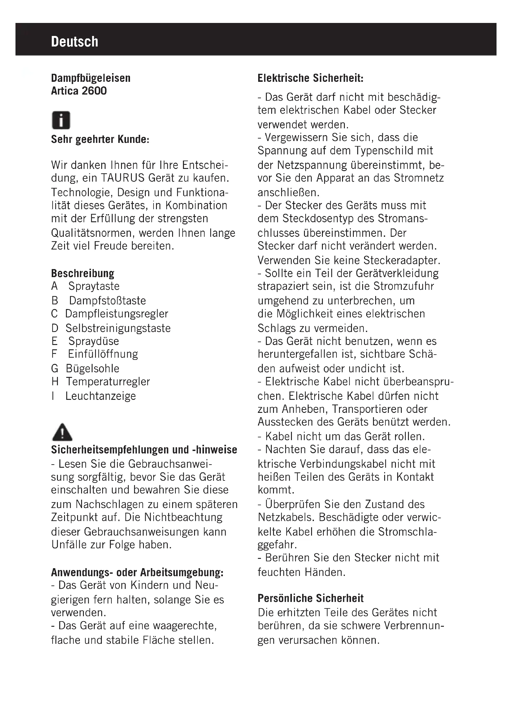 - • • Température pour le coton. (Température minimum pour repasser à vapeur) Max Température pour le lin. - Si la composition du tissu contient différents types de fibres, veui- llez sélectionner la température correspondante à la fibre qui requiert une température moins élevée. (Par exemple pour un tissu qui contient 60 % de polyester et 40 % de coton, la température à choisir est celle qui correspond au polyester). - Attendre que le témoin lumineux (I) s’éteigne, ce qui signifiera que l’appareil a atteint la température adéquate. - Lorsque l’appareil sera en marche, le voyant lumineux (I) s’allumera et s’éteindra automatiquement, en indiquant ainsi le bon fonctionne- ment des parties chauffantes pour maintenir la température désirée. Repassage à sec: - L’appareil dispose d’un régulateur de flux de vapeur, lorsqu’il se trouve sur la position 0, il permet le repassa- ge à sec (sans vapeur). Repassage à vapeur: - Pour repasser avec vapeur, veuillez vérifier que le réservoir soit plein et que la température sélectionnée soit l’adéquate. Contrôle du flux de vapeur: - L’appareil dispose de la commande (C) qui permet de contrôler le flux de vapeur. Spray: - Le spray peut s’utiliser tant pour le repassage à sec comme à vapeur. - Pour réaliser cette opération, appu- yer sur le bouton spray (A).- La première fois, enfoncer à plu- sieurs reprises le bouton spray. Coup de vapeur: - Cette fonction proportionne une vapeur extra pour éliminer les plis rebelles. - Appuyer sur le bouton coup de va- peur (B). Attendre quelques secondes que la vapeur pénètre dans les fibres du tissu, avant d’appuyer de nouveau sur le bouton. Pour obtenir une quali- té optimum de vapeur, n’appuyer pas plus de trois fois successives. - La première fois, enfoncer à plu- sieurs reprises le bouton spray. Repassage vertical: - Vous pouvez repasser vos rideaux suspendus, vos vêtements sur cintres, etc. Pour ce faire, veuillez suivre les conseils suivants: - Sélectionner la température maxi- male du fer à repasser, en tournant en sens horaire le régulateur de tem- pérature du fer à repasser. (Fig. 2). - Passer le fer à repasser de haut en bas en appuyant sur le bouton vapeur ( B ). Important : pour le coton et le lin, nous vous conseillons de mettre en contact la base du fer à repasser avec le tissu. Pour les tissus plus délicats, nous vous conseillons de l’éloigner quelques centimètres. Lorsque vous avez fini de vous servir de l’appareil: - Choisir la position minimum (MIN) grâce au sélecteur de température. - Débrancher l’appareil du secteur. - Retirer l’eau du réservoir. - Nettoyer l’appareil. Nettoyage - Débrancher l’appareil du secteur et attendre son complet refroidissement avant de la nettoyer. - Nettoyer le dispositif électrique avec un chiffon humide et le laisser sécher. - Ne pas utiliser de solvants ni de produits à pH acide ou basique tels que l’eau de javel, ni de produits abrasifs pour nettoyer l’appareil. - Ne pas immerger l’appareil dans l’eau ou tout autre liquide, ni le passer sous un robinet. Fonction Autonettoyante: - Il est important d’effectuer la fonc- tion autonettoyante au moins une fois par mois, pour éliminer les résidus de calcaire et d’autres minéraux accumulés dans l’appareil. - Remplir le réservoir jusqu’au niveau maximum, comme il est indiqué dans le paragraphe “remplissage d’eau”. - Placer le fer en position verticale, le brancher au réseau et sélectionner la température maximale. - Laisser l’appareil se réchauffer jusqu’à ce que le voyant indique qu’il est arrivé à la température prévue. - Débrancher l’appareil et le placer dans l’évier. - Appuyer sur le bouton d’auto-netto- yage et le maintenir appuyé. - Permettre que l’eau puisse couler à travers les sorties de vapeur de la semelle, tout en agitant légèrement l’appareil. - Lâcher le bouton d’auto-nettoyage après une minute ou lorsque le réser-voir sera vide. - Laisser le fer en position verticale jusqu’à ce qu’il se refroidisse. Anomalies et réparation - En cas de panne, remettre l’appareil à un service d’assistance technique autorisé. Ne pas tenter de procéder aux réparations ou de démonter l’appareil; cela implique des risques. - Si le branchement au secteur est endommagé, il doit être remplacé. Procéder alors comme en cas de panne. Pour les produits de l’Union Euro- péenne et (ou) conformément à la réglementation en vigueur de votre pays d’origine: Écologie et recyclage du produit Ce symbole signifie que si vous souhaitez vous défaire du produit, une fois que celui-ci n’est plus utilisable, remettez-le, suivant la méthode appropriée, à un gestionnaire de déchets d’équipements électriques et électroniques (DEEE). Cet appareil est conforme à la direc- tive 2006/95/EC de basse tension ainsi qu’à la directive 2004/108/EC de compatibilité électromagnétique.Deutsch Dampfbügeleisen Artica 2600 Sehr geehrter Kunde: Wir danken Ihnen für Ihre Entschei- dung, ein TAURUS Gerät zu kaufen. Technologie, Design und Funktiona- lität dieses Gerätes, in Kombination mit der Erfüllung der strengsten Qualitätsnormen, werden Ihnen lange Zeit viel Freude bereiten. Beschreibung A Spraytaste B Dampfstoßtaste C Dampfleistungsregler D Selbstreinigungstaste E Spraydüse F Einfüllöffnung G Bügelsohle H Temperaturregler I Leuchtanzeige Sicherheitsempfehlungen und -hinweise - Lesen Sie die Gebrauchsanwei- sung sorgfältig, bevor Sie das Gerät einschalten und bewahren Sie diese zum Nachschlagen zu einem späteren Zeitpunkt auf. Die Nichtbeachtung dieser Gebrauchsanweisungen kann Unfälle zur Folge haben. Anwendungs- oder Arbeitsumgebung: - Das Gerät von Kindern und Neu- gierigen fern halten, solange Sie es verwenden. - Das Gerät auf eine waagerechte, flache und stabile Fläche stellen. Elektrische Sicherheit: - Das Gerät darf nicht mit besc