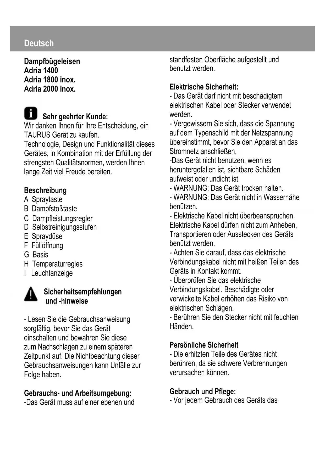 Adria 1800 inox - Bügeleisen TAURUS - Kostenlose Bedienungsanleitung