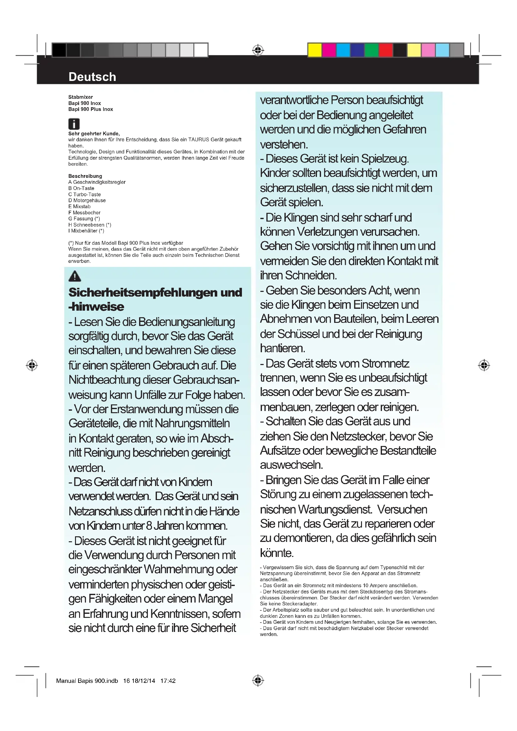Purée de pom- mes de terre 20e 400 g Écraser en agissant directement sur l’aliment qui se trouve dans la casserole 30 s Bouillie 20e 300 g Couper en morceaux et verser dans le récipient : 100 g de pomme, 100 g de banane, 50 g de biscuits et le jus d’une orange 25 s Chapelure 20e 50 g Couper en morceaux le pain sec avant de le mettre dans le bol et hacher jusqu’à obtenir la texture voulue 50 s Fromage râpé 20e 200 g Couper en dés de 1 cm et hacher jusqu’à obtenir la texture voulue 30 – 40 s Carottes pilées 20e 300 g Éplucher, couper en dés de 1 cm et hacher jusqu’à obtenir la texture voulue 20 s Fruits secs hachés 20e 300 g Monder et hacher jusqu’à obtenir la texture voulue 20 s Œufs durs hachés 20e 5 œufs Couper en Quatre et hacher jusqu’à obtenir la texture voulue 10 s Viande hachée (crue ou cuite) 20e 300 g Couper préalablement la viande en dés de 1 cm. Hacher jusqu'à obtenir la texture voulue 30 s Hacher de la viande 20e 40 g Couper préalablement la viande en dés de 1 cm. Hacher jusqu'à obtenir la texture voulue 3 s Jus de tomate 20e 400 g Couper les tomates en quartiers puis les introduire dans le verre tamiseur, actionner l'appareil, le jus restera dans la carafe 20 s Jambon du pays haché 20e 60 g Couper préalablement le jambon en dés de 1 cm. Hacher jusqu'à obtenir la texture voulue 3 s Hacher des abricots secs TURBO 60 g Couper préalablement les abricots en dés de 1 cm. Hacher jusqu'à obtenir la texture voulue 3 s Manual Bapis 900.indb 15 18/12/14 17:42Deutsch Stabmixer Bapi 900 Inox Bapi 900 Plus Inox Sehr geehrter Kunde, wir danken Ihnen für Ihre Entscheidung, dass Sie ein TAURUS Gerät gekauft haben. Technologie, Design und Funktionalität dieses Gerätes, in Kombination mit der Erfüllung der strengsten Qualitätsnormen, werden Ihnen lange Zeit viel Freude bereiten. Beschreibung A Geschwindigkeitsregler B On-Taste C Turbo-Taste D Motorgehäuse E Mixstab F Messbecher G Fassung (*) H Schneebesen (*) I Mixbehälter (*) (*) Nur für das Modell Bapi 900 Plus Inox verfügbar Wenn Sie meinen, dass das Gerät nicht mit dem oben angeführten Zubehör ausgestattet ist, können Sie die Teile auch einzeln beim Technischen Dienst erwerben. Sicherheitsempfehlungen und -hinweise - Lesen Sie die Bedienungsanleitung sorgfältig durch, bevor Sie das Gerät einschalten, und bewahren Sie diese für einen späteren Gebrauch auf. Die Nichtbeachtung dieser Gebrauchsan- weisung kann Unfälle zur Folge haben. - Vor der Erstanwendung müssen die Geräteteile, die mit Nahrungsmitteln in Kontakt geraten, so wie im Absch- nitt Reinigung beschrieben gereinigt werden. - Das Gerät darf nicht von Kindern verwendet werden. Das Gerät und sein Netzanschluss dürfen nicht in die Hände von Kindern unter 8 Jahren kommen. - Dieses Gerät ist nicht geeignet für die Verwendung durch Personen mit eingeschränkter Wahrnehmung oder verminderten physischen oder geisti- gen Fähigkeiten oder einem Mangel an Erfahrung und Kenntnissen, sofern sie nicht durch eine für ihre Sicherheit verantwortliche Person beaufsichtigt oder bei der Bedienung angeleitet werden und die möglichen Gefahren verstehen. - Dieses Gerät ist kein Spielzeug. Kinder sollten beaufsichtigt werden, um sicherzustellen, dass sie nicht mit dem Gerät spielen. - Die Klingen sind sehr scharf und können Verletzungen verursachen. Gehen Sie vorsichtig mit ihnen um und vermeiden Sie den direkten Kontakt mit ihren Schneiden. - Geben Sie besonders Acht, wenn sie die Klingen beim Einsetzen und Abnehmen von Bauteilen, beim Leeren der Schüssel und bei der Reinigung hantieren. - Das Gerät stets vom Stromnetz trennen, wenn Sie es unbeaufsichtigt lassen oder bevor Sie es zusam- menbauen, zerlegen oder reinigen. - Schalten Sie das Gerät aus und ziehen Sie den Netzstecker, bevor Sie Aufsätze oder bewegliche Bestandteile auswechseln. - Bringen Sie das Gerät im Falle einer Störung zu einem zugelassenen tech- nischen Wartungsdienst. Versuchen Sie nicht, das Gerät zu reparieren oder zu demontieren, da dies gefährlich sein könnte. - Vergewissern Sie sich, dass die Spannung auf dem Typenschild mit der Netzspannung übereinstimmt, bevor Sie den Apparat an das Stromnetz anschließen. - Das Gerät an ein Stromnetz mit mindestens 10 Ampere anschließen. - Der Netzstecker des Geräts muss mit dem Steckdosentyp des Stromans- chlusses übereinstimmen. Der Stecker darf nicht verändert werden. Verwenden Sie keine Steckeradapter. - Der Arbeitsplatz sollte sauber und gut beleuchtet sein. In unordentlichen und dunklen Zonen kann es zu Unfällen kommen. - Das Gerät von Kindern und Neugierigen fernhalten, solange Sie es verwenden. - Das Gerät darf nicht mit beschädigtem Netzkabel oder Stecker verwendet werden. Manual Bapis 900.indb 16 18/12/14 17:42- Sollte ein Teil der Geräteverkleidung beschädigt sein, ist die Stromzufuhr umgehend zu unterbrechen, um die Möglichkeit eines elektrischen Schlags zu vermeiden. - Das Gerät nicht benutzen, wenn es heruntergefallen ist, sichtbare Schäden aufweist oder undicht ist. - Das Gerät darf nicht mit nassen Händen oder Füßen und auch nicht barfuß betätigt werden. - Elektrische Kabel nicht überbeanspruchen. Elektrische Kabel dürfen nicht zum Anheben, Transportieren oder Ausstecken des Geräts benützt werden. - Kabel nicht um das Gerät rollen. - Überprüfen Sie das elektrische Verbindungskabel. Beschädigte oder verwic- kelte Kabel erhöhen das Risiko von elektrischen Schlägen. - Das Gerät nicht im Freien benutzen oder aufbewahren. - Berühren Sie den Stecker nicht mit feuchten Händen. - Treffen Sie die erforderlichen Maßnahmen, um ein unbeabsichtigtes Inbetrieb- setzen des Geräts zu verhindern. - Bewegliche Teile des Geräts während dem Betrieb nicht berühren. Gebrauch und Pege: - Gerät nicht benützen, wenn Zubehör oder Ersatzteile nicht richtig befestigt sind. - Das Gerät sollte in leerem Zustand, also ohne Inhalt, nicht benützt werden. - Benützen Sie das Gerät