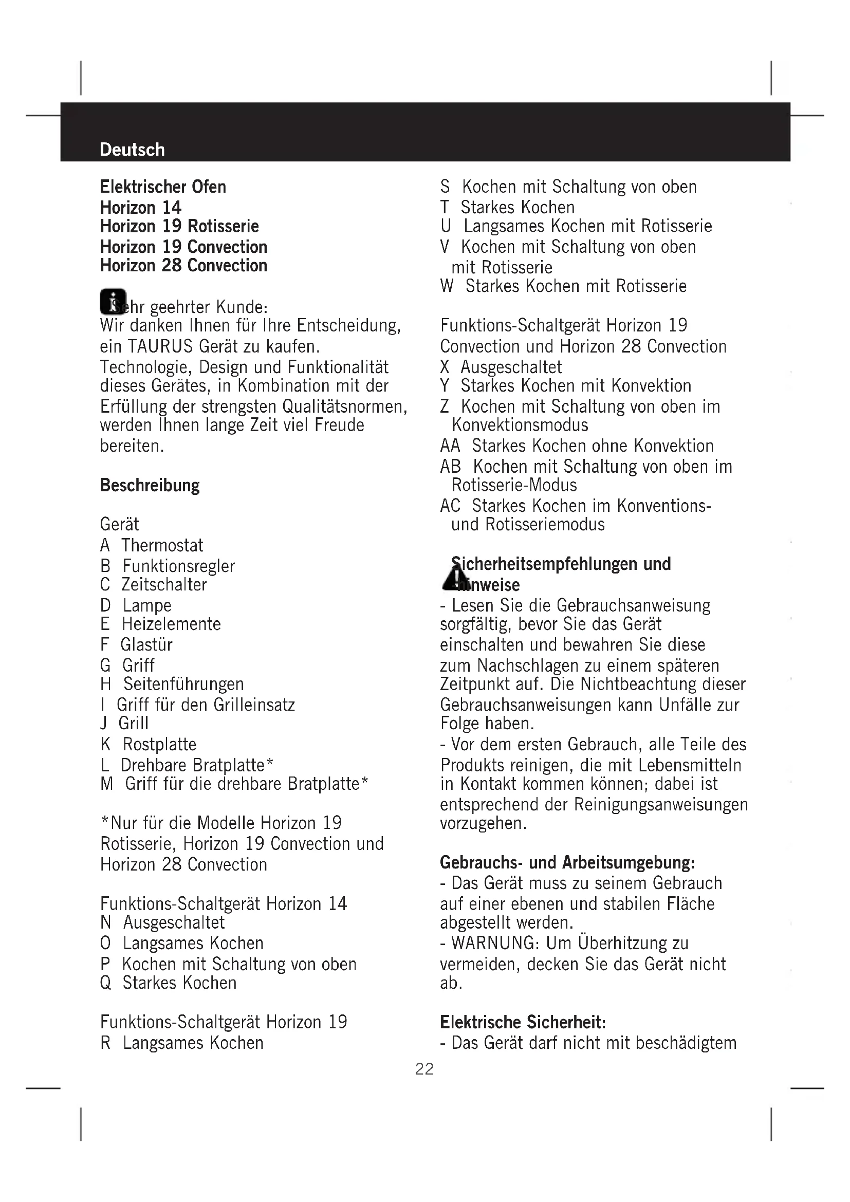 Horizon 19 Convection - Ofen TAURUS - Kostenlose Bedienungsanleitung