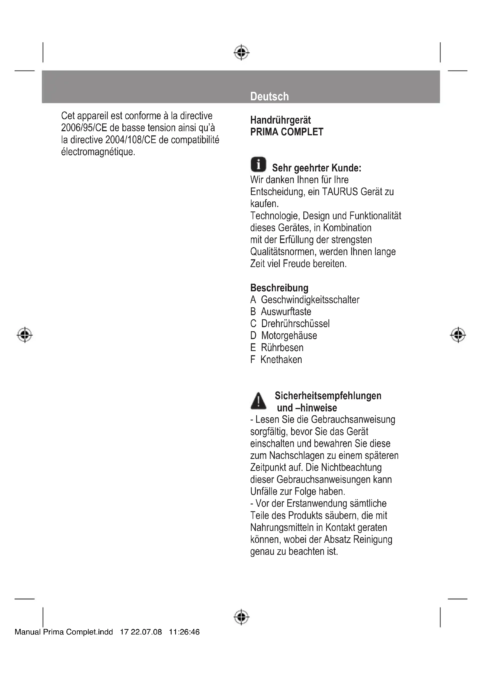 poignée (Fig 4). - Introduire le crochet de pétrissage dans la connexion de l’adaptateur. Assembler cette unité au moteur en appuyant jusqu’à entendre un click (Fig. 8). Veuillez introduire le crochet de pétrissage avec la plus Manual Prima Complet.indd 15 22.07.08 11:26:45grande bouche dans l’orifice de plus grande taille. - Retirer l’accessoire pétrissage et appuyer sur le bouton éjecteur d’accessoires pour libérer la connexion de l’adaptateur (Fig. 9). Nettoyage - Débrancher l’appareil du secteur et le laisser refroidir avant de procéder à toute opération de nettoyage. - Nettoyer l’appareil en le frottant avec un chiffon humidifié imprégné de quelques gouttes de détergent puis le sécher. - Ne pas utiliser de solvants ni de produits à pH acide ou basique tels que l’eau de javel, ni de produits abrasifs pour nettoyer l’appareil. - Ne pas laisser pénétrer de l’eau ni aucun autre liquide par les ouvertures de ventilation afin d’éviter d’endommager les parties intérieures de l’appareil. - Les pièces suivantes peuvent être lavées au lave-vaisselle : - Accessoire fouet - Crochets de pétrissage Anomalies et réparation - En cas de panne, remettre l’appareil à un service d’assistance technique autorisé. Ne pas tenter de procéder aux réparations ou de démonter l’appareil ; cela implique des risques. - Si le branchement au secteur est endommagé, il doit être remplacé. Procéder alors comme en cas de panne. Cet appareil a reçu le remplissage, avec une quantité et qualité d’huile déterminées, ainsi la substitution ou remplissage d’huile en cas de fuite, devra être réalisé par un Service d’Assistance Technique autorisé. Écologie et recyclage du produit - Les matériaux dont l’emballage de cet appareil est constitué intègrent un programme de collecte, de classification et de recyclage. Si vous souhaitez vous en défaire, veuillez utiliser les conteneurs publics appropriés pour chaque type de matériel. - Le produit ne contient pas de concentrations de substances considérées comme étant nocives pour l’environnement. - Lorsque ce produit n’est plus utilisable, si vous souhaitez vous en défaire, remettez- le, suivant la méthode appropriée, à un gestionnaire de déchets habilité pour la collecte sélective de déchets d’appareils électriques et électroniques. - Ce symbole signifie que si vous souhaitez vous défaire du produit, une fois que celui-ci n’est plus utilisable, remettez-le, suivant la méthode appropriée, à un gestionnaire de déchets habilité pour la collecte sélective de déchets d’appareils électriques et électroniques (DEEE). Manual Prima Complet.indd 16 22.07.08 11:26:45Cet appareil est conforme à la directive 2006/95/CE de basse tension ainsi qu’à la directive 2004/108/CE de compatibilité électromagnétique. Deutsch Handrührgerät PRIMA COMPLET Sehr geehrter Kunde: Wir danken Ihnen für Ihre Entscheidung, ein TAURUS Gerät zu kaufen. Technologie, Design und Funktionalität dieses Gerätes, in Kombination mit der Erfüllung der strengsten Qualitätsnormen, werden Ihnen lange Zeit viel Freude bereiten. Beschreibung A Geschwindigkeitsschalter B Auswurftaste C Drehrührschüssel D Motorgehäuse E Rührbesen F Knethaken Sicherheitsempfehlungen und –hinweise - Lesen Sie die Gebrauchsanweisung sorgfältig, bevor Sie das Gerät einschalten und bewahren Sie diese zum Nachschlagen zu einem späteren Zeitpunkt auf. Die Nichtbeachtung dieser Gebrauchsanweisungen kann Unfälle zur Folge haben. - Vor der Erstanwendung sämtliche Teile des Produkts säubern, die mit Nahrungsmitteln in Kontakt geraten können, wobei der Absatz Reinigung genau zu beachten ist. Manual Prima Complet.indd 17 22.07.08 11:26:46Gebrauchs- und Arbeitsumgebung: - Das Gerät muss zu seinem Gebrauch auf einer ebenen und stabilen Fläche abgestellt werden. Elektrische Sicherheit: - Das Gerät darf nicht mit beschädigtem elektrischen Kabel oder Stecker verwendet werden. - Vergewissern Sie sich, dass die Spannung auf dem Typenschild mit der Netzspannung übereinstimmt, bevor Sie den Apparat an das Stromnetz anschließen. - Das Gerät nicht benutzen, wenn es heruntergefallen ist, sichtbare Schäden aufweist oder undicht ist. - Elektrische Kabel nicht überbeanspruchen. Elektrische Kabel dürfen nicht zum Anheben, Transportieren oder Ausstecken des Geräts benützt werden. - Berühren Sie den Stecker nicht mit feuchten Händen. Persönliche Sicherheit: - Bewegliche Teile des Geräts während dem Betrieb nicht berühren. Gebrauch und Pflege: - Vor jedem Gebrauch des Geräts das Stromkabel vollständig auswickeln. - Das Gerät darf nicht mit beschädigtem elektrischen Kabel oder Stecker verwendet werden. - Benützen Sie das Gerät nicht, wenn der An-/Ausschalter nicht funktioniert. - Ziehen Sie bitte den Stecker aus der Steckdose, wenn Sie das Gerät nicht benutzen und bevor Sie eine Reinigung vornehmen. - Dieses Gerät ist kein Spielzeug. Kinder sollten überwacht werden, um sicher zu stellen, dass sie nicht mit dem Gerät spielen. - Dieser Apparat dient ausschließlich für Haushaltszwecke und ist für professionellen oder gewerblichen Gebrauch nicht geeignet. - Dieses Gerät ist für den Gebrauch von Erwachsenen konzipiert. Vermeiden Sie die Benutzung desselben durch Kinder, Behinderte oder Personen, die mit dem Gerät nicht vertraut sind. - Bewahren Sie das Gerät außerhalb der Reichweite von Kindern und/oder Behinderten auf. - Unfachgemäßer Gebrauch oder die Nichteinhaltung der vorliegenden Gebrauchsanweisungen können gefährlich sein und führen zu einer vollständigen Ungültigkeit der Herstellergarantie. Gebrauchsanweisung Anwendung: - Das Gerät an das Stromnetz anschließen. - Die Rührschüssel auf die Bodenplatte stellen. - Gegebenenfalls auf die Entriegelungstaste drücken (Abb. 1), bis die Rührschüssel einen festen Sitz hat. - Die Mixereinheit an der Halterung Manual Prima Complet.indd 18 22.07