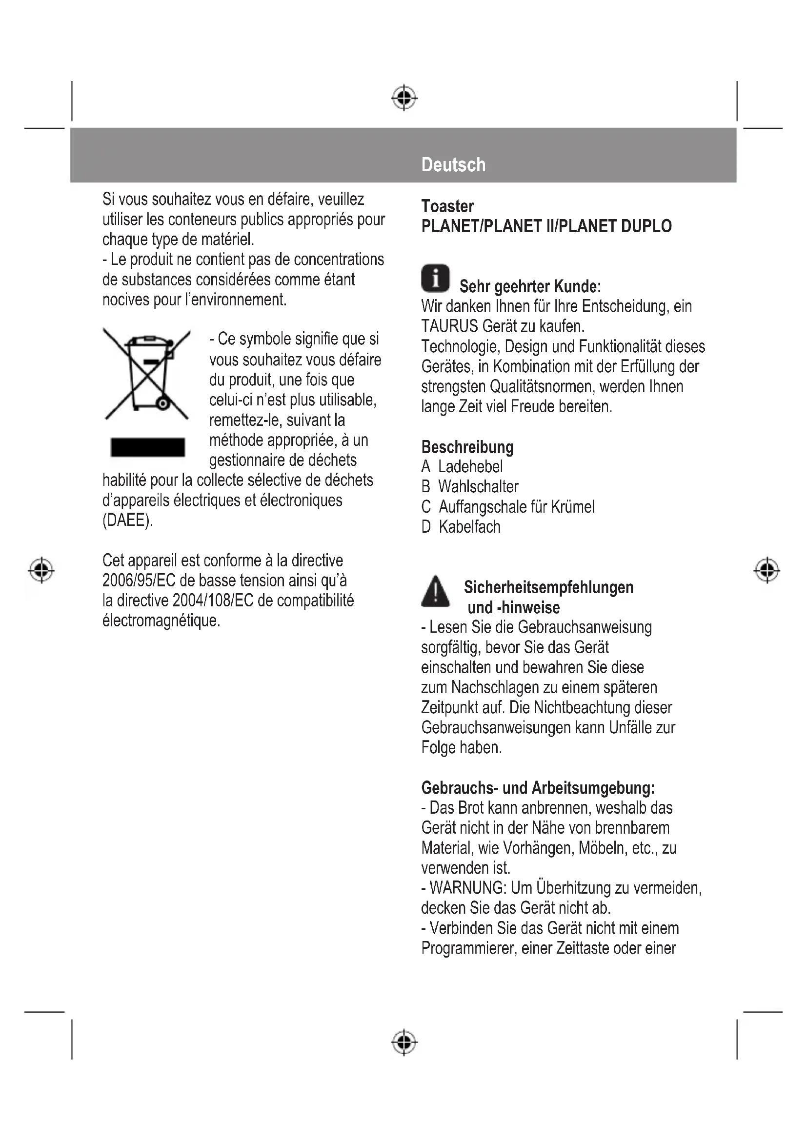 Sehr geehrter Kunde: Wir danken Ihnen für Ihre Entscheidung, ein TAURUS Gerät zu kaufen. Technologie, Design und Funktionalität dieses Gerätes, in Kombination mit der Erfüllung der strengsten Qualitätsnormen, werden Ihnen lange Zeit viel Freude bereiten. Beschreibung A Ladehebel B Wahlschalter C Auffangschale für Krümel D Kabelfach Sicherheitsempfehlungen und -hinweise - Lesen Sie die Gebrauchsanweisung sorgfältig, bevor Sie das Gerät einschalten und bewahren Sie diese zum Nachschlagen zu einem späteren Zeitpunkt auf. Die Nichtbeachtung dieser Gebrauchsanweisungen kann Unfälle zur Folge haben. Gebrauchs- und Arbeitsumgebung: - Das Brot kann anbrennen, weshalb das Gerät nicht in der Nähe von brennbarem Material, wie Vorhängen, Möbeln, etc., zu verwenden ist. - WARNUNG: Um Überhitzung zu vermeiden, decken Sie das Gerät nicht ab. - Verbinden Sie das Gerät nicht mit einem Programmierer, einer Zeittaste oder eineranderen Vorrichtung, die den Apparat automatisch anstellt, da Brandgefahr besteht, falls das Gerät abgedeckt oder falsch aufgestellt ist. Elektrische Sicherheit: - Das Gerät darf nicht mit beschädigtem elektrischen Kabel oder Stecker verwendet werden. - Vergewissern Sie sich, dass die Spannung auf dem Typenschild mit der Netzspannung übereinstimmt, bevor Sie den Apparat an das Stromnetz anschließen. - Schließen Sie das Gerät an ein Netz an,das für mindestens 10 Ampere ausgerichtet ist. - Der Stecker des Geräts muss mit dem Steckdosentyp des Stromanschlusses übereinstimmen. Der Stecker darf nicht verändert werden. Verwenden Sie keine Steckeradapter. - Das Gerät nicht im Freien benutzen oder aufbewahren. - Das Gerät nicht benutzen, wenn es heruntergefallen ist, sichtbare Schäden aufweist oder undicht ist. - Das elektrische Kabel nicht überlasten. Elektrische Kabel dürfen nicht zum Anheben, Transportieren oder Ausstecken des Geräts benützt werden. - Kabel nicht um das Gerät rollen. - Vermeiden Sie, dass das Verbindungskabel mit den heißen Flächen des Geräts in Berührung kommt. - Berühren Sie den Stecker nicht mit feuchten Händen. Persönliche Sicherheit: - Die Temperatur der erreichbaren Oberächen kann erhöht sein, wenn das Gerät in Betrieb ist. Gebrauch und Pege: - Vor jedem Gebrauch des Geräts das Stromkabel vollständig abwickeln. - Benützen Sie das Gerät nicht, wenn der An-/ Ausschalter nicht funktioniert. - Bewegen oder verschieben Sie das Gerät nicht, während es in Betrieb ist. - Drehen Sie das Gerät nicht um während es in Betrieb oder an das Stromnetz angeschlossen ist. - Stromzufuhr unterbrechen, wenn das Gerät nicht benützt oder wenn Reinigungsarbeiten vorgenommen werden. - Dieser Apparat dient ausschließlich für Haushaltszwecke und ist für professionellen oder gewerblichen Gebrauch nicht geeignet. - Dieses Gerät ist für den Gebrauch von Erwachsenen konzipiert. Vermeiden Sie die Benutzung desselben durch Kinder, Behinderte oder Personen, die mit dem Gerät nicht vertraut sind. - Bewahren Sie das Gerät außerhalb der Reichweite von Kindern und/oder Behinderten auf. - Dieses Gerät ist kein Spielzeug. Kinder sollten überwacht werden, um sicher zu stellen, dass sie nicht mit dem Gerät spielen. - Das noch heiße Gerät darf nicht verpackt werden. - Unfachgemäßer Gebrauch oder die Nichteinhaltung der vorliegenden Gebrauchsanweisungen können gefährlich sein und führen zu einer vollständigen Ungültigkeit der Herstellergarantie.- Das Gerät reinigen. Kabelfach - Das Gerät ist mit einem Kabelfach für das Stromnetzkabel ausgestattet, das sich an der unteren Seite des Gerätes bendet. Reinigung - Ziehen Sie den Stecker heraus und lassen Sie das Gerät abkühlen, bevor Sie mit der Reinigung beginnen. - Reinigen Sie das Gerät mit einem feuchten Tuch, auf das Sie einige Tropfen Reinigungsmittel geben und trocknen Sie es danach ab. - Verwenden Sie zur Reinigung des Apparates weder Lösungsmittel noch Scheuermittel oder Produkte mit einem sauren oder basischen pH-Wert wie Lauge. - Das Gerät nicht in Wasser oder andere Flüssigkeiten tauchen und nicht unter den Wasserhahn halten. - Es wird empfohlen, Speisereste regelmäßig vom Gerät zu entfernen. Auffangschale für Krümel: - Das Gerät verfügt über eine Auffangschale für Brotkrümel, die sich im Inneren des Geräts absetzen. - Nehmen Sie die Auffangschale heraus (Abb. C) - Schütten Sie den Inhalt der Schale aus. - Bewegen Sie das Gerät hin und her, um eventuelle Brotreste zu entfernen. - Legen Sie die Auffangschale wieder in das Gerät. Gebrauchsanweisung Vor dem Gebrauch zu beachten: - Vor dem ersten Gebrauch sollte das Gerät ohne Brot in Betrieb genommen werden. Gebrauch: - Schließen Sie das Gerät an das Stromnetz an. - Stecken Sie die Brotscheibe/n in das Gerät. - Stellen Sie die gewünschte Stärke mit dem Wahlschalter ein. - Stellen Sie das Gerät ein, indem Sie den Schalter nach unten schieben bis Sie das einrastende „Klick“ hören. - Die Brotscheiben werden automatisch zentriert um ein gleichmäßiges Toasten zu gewährleisten. - Um die Entstehung von Acrylamid während des Toastvorgangs zu vermeiden, sollten Sie darauf achten, dass das Brot nicht dunkelbraun oder schwarz wird. - Nach der eingestellten Toastzeit stellt sich das Gerät automatisch ab. Funktion Abbrechen: - Stellt man der Rötgrad-Wähler auf die position stop (Aus), wird der Rötzyklus automatisch unbrochen und das brot ausgeworfen. Der Toastvorgang kann jederzeit unterbrochen werden, indem man den Schalter auf dieser position sellt. Nach dem Gebrauch des Geräts: - Unterbrechen Sie die Stromzufuhr zum Gerät. - Das Kabel aufwickeln und im Kabelfach unterbringen.Italiano Tostapane
