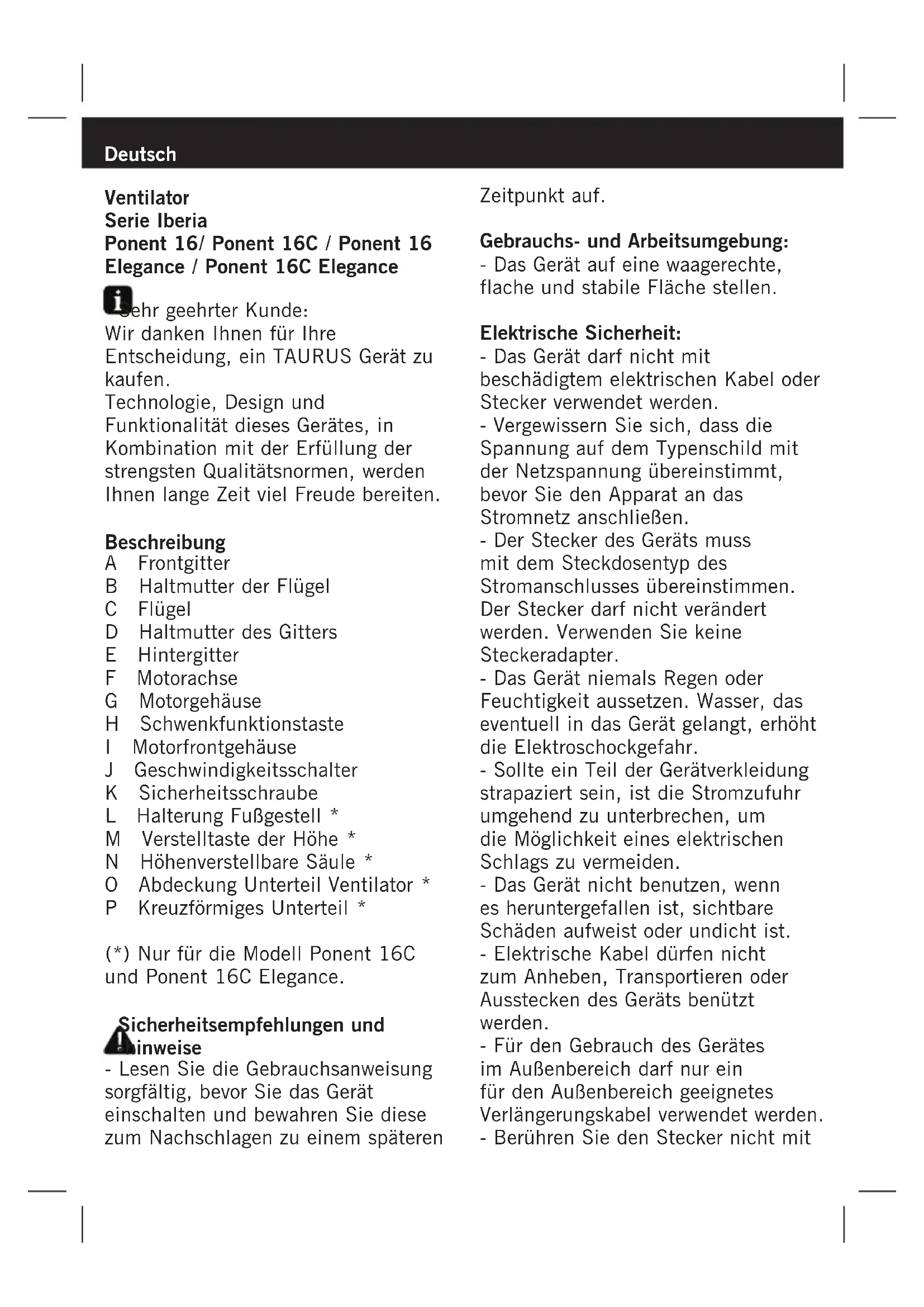 - Débrancher l’appareil du secteur. - Nettoyer l’appareil. Poignée de Transport : - Cet appareil dispose d’une poignée sur sa partie supérieure pour faciliter son transport en toute commodité (Fig. 3). Nettoyage - Débrancher l’appareil du secteur et attendre son complet refroidissement avant de la nettoyer. - Nettoyer le dispositif électrique avec un chiffon humide et le laisser sécher. - Ne pas utiliser de solvants ni de produits à pH acide ou basique tels que l’eau de javel, ni de produits abrasifs pour nettoyer l’appareil. - Ne pas immerger l’appareil dans l’eau ou tout autre liquide, ni le passer sous un robinet. Anomalies et réparation - En cas de panne, remettre l’appareil à un service d’assistance technique autorisé. Ne pas tenter de procéder aux réparations ou de démonter l’appareil; cela implique des risques. - Si le branchement au secteur est endommagé, il doit être remplacé. Procéder alors comme en cas de panne. Pour les produits de l’Union Européenne et (ou) conformément à la réglementation en vigueur de votre pays d’origine : Cet appareil est conforme à la directive 2006/95/EC de basse tension ainsi qu’à la directive 2004/108/EC de compatibilité électromagnétique. Ce symbole signifie que si vous souhaitez vous défaire du produit, une fois que celui-ci n’est plus utilisable, remettez-le, suivant la méthode appropriée, à un gestionnaire de déchets d’équipements électriques et électroniques (DEEE).Deutsch Ventilator Serie Iberia Ponent 16/ Ponent 16C / Ponent 16 Elegance / Ponent 16C Elegance Sehr geehrter Kunde: Wir danken Ihnen für Ihre Entscheidung, ein TAURUS Gerät zu kaufen. Technologie, Design und Funktionalität dieses Gerätes, in Kombination mit der Erfüllung der strengsten Qualitätsnormen, werden Ihnen lange Zeit viel Freude bereiten. Beschreibung A Frontgitter B Haltmutter der Flügel C Flügel D Haltmutter des Gitters E Hintergitter F Motorachse G Motorgehäuse H Schwenkfunktionstaste I Motorfrontgehäuse J Geschwindigkeitsschalter K Sicherheitsschraube L Halterung Fußgestell * M Verstelltaste der Höhe * N Höhenverstellbare Säule * O Abdeckung Unterteil Ventilator * P Kreuzförmiges Unterteil * (*) Nur für die Modell Ponent 16C und Ponent 16C Elegance. Sicherheitsempfehlungen und -hinweise - Lesen Sie die Gebrauchsanweisung sorgfältig, bevor Sie das Gerät einschalten und bewahren Sie diese zum Nachschlagen zu einem späteren Zeitpunkt auf. Gebrauchs- und Arbeitsumgebung: - Das Gerät auf eine waagerechte, flache und stabile Fläche stellen. Elektrische Sicherheit: - Das Gerät darf nicht mit beschädigtem elektrischen Kabel oder Stecker verwendet werden. - Vergewissern Sie sich, dass die Spannung auf dem Typenschild mit der Netzspannung übereinstimmt, bevor Sie den Apparat an das Stromnetz anschließen. - Der Stecker des Geräts muss mit dem Steckdosentyp des Stromanschlusses übereinstimmen. Der Stecker darf nicht verändert werden. Verwenden Sie keine Steckeradapter. - Das Gerät niemals Regen oder Feuchtigkeit aussetzen. Wasser, das eventuell in das Gerät gelangt, erhöht die Elektroschockgefahr. - Sollte ein Teil der Gerätverkleidung strapaziert sein, ist die Stromzufuhr umgehend zu unterbrechen, um die Möglichkeit eines elektrischen Schlags zu vermeiden. - Das Gerät nicht benutzen, wenn es heruntergefallen ist, sichtbare Schäden aufweist oder undicht ist. - Elektrische Kabel dürfen nicht zum Anheben, Transportieren oder Ausstecken des Geräts benützt werden. - Für den Gebrauch des Gerätes im Außenbereich darf nur ein für den Außenbereich geeignetes Verlängerungskabel verwendet werden. - Berühren Sie den Stecker nicht mitfeuchten Händen. Persönliche Sicherheit - Bewegliche Teile des Geräts während dem Betrieb nicht berühren. Gebrauch und Pflege: - Vor jedem Gebrauch des Geräts das Stromkabel vollständig auswickeln. - Benützen Sie das Gerät nicht, wenn der An-/Ausschalter nicht funktioniert. - Das Gerät nicht bewegen, während es in Betrieb ist. - Das Gerät mittels der Handgriffe handhaben oder transportieren. - Wird das Gerät in einem Badezimmer oder ähnlichem Raum benützt, unterbrechen Sie die Stromzufuhr, wenn Sie den Fön nicht verwenden, selbst wenn es nur kurze Zeit ist; die Nähe von Wasser stellt immer eine Gefahr dar, auch wenn das Gerät abgeschaltet ist. - Ziehen Sie den Stecker heraus und lassen Sie das Gerät abkühlen, bevor Sie mit der Reinigung beginnen. - Dieser Apparat dient ausschließlich für Haushaltszwecke und ist für professionellen oder gewerblichen Gebrauch nicht geeignet. - Kinder sollten überwacht werden, um sicher zu stellen, dass sie nicht mit dem Gerät spielen. - Vermeiden Sie die Benutzung desselben durch Kinder, Behinderte oder Personen, die mit dem Gerät nicht vertraut sind. - Bewahren Sie das Gerät außerhalb der Reichweite von Kindern und/oder Behinderten auf. - Benützen Sie das Gerät nicht für Plüschtiere oder Haustiere. - Unfachgemäßer Gebrauch oder die Nichteinhaltung der vorliegenden Gebrauchsanweisungen können gefährlich sein und führen zu einer vollständigen Ungültigkeit der Herstellergarantie. Installation - Der Netzstecker muss leicht zugänglich sein, damit er im Notfall schnell vom Stromnetz genommen werden kann. - Das Gerät nur mit dem mitgelieferten Gestell verwenden. Aufbau des Unterteils: - Das Unterteil mit den mitgelieferten Schrauben an der Säule befestigen (Abb. 1). (Nur für Modelle mit Säule) - Zum Aufbauen des Unterteils ist das Gerät auf den Kopf zu stellen. - Setzen Sie das Unterteil auf das Gerätegehäuse auf. - Befestigen Sie das Unterteil mit den mitgelieferten Flügelmuttern (Abb. 2) - Drehen Sie das Gerät wieder um und überprüfen Sie die Standfestigkeit des Unterteils. Aufbau des Gitters und der Flügel: - Das Hintergitter (E) in das Motorgehäuse (G) einsetzen, indem die Verbindungspunkte ineinander gefügt werden. - Zur Befestigung des Gitters die Haltmutter des Gitter