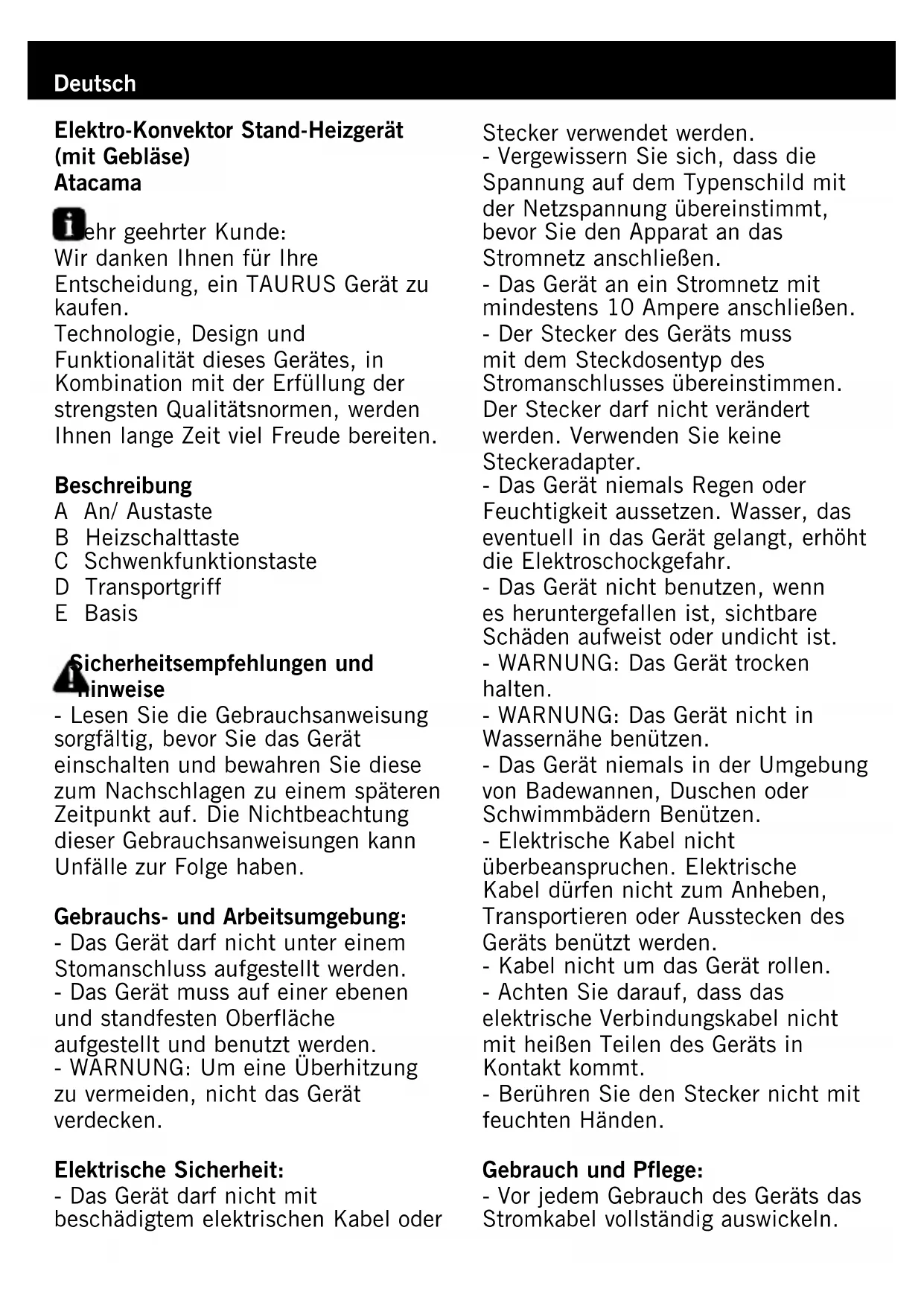 Finden Sie kostenlos die Bedienungsanleitung des Geräts Atacama TAURUS als PDF.