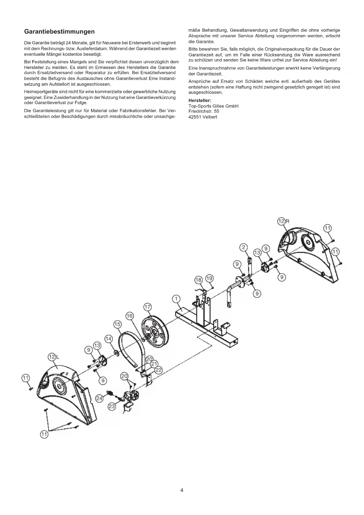 betrachten. Bei Verkauf oder der Weitergabe des Produktes ist diese Do- kumentation mitzugeben.34 Garantiebestimmungen Die Garantie beträgt 24 Monate, gilt für Neuware bei Ersterwerb und beginnt mit dem Rechnungs- bzw. Auslieferdatum. Während der Garantiezeit werden eventuelle Mängel kostenlos beseitigt. Bei Feststellung eines Mangels sind Sie verpichtet diesen unverzüglich dem Hersteller zu melden. Es steht im Ermessen des Herstellers die Garantie durch Ersatzteilversand oder Reparatur zu erfüllen. Bei Ersatzteilversand besteht die Befugnis des Austausches ohne Garantieverlust Eine Instand- setzung am Aufstellort ist ausgeschlossen. Heimsportgeräte sind nicht für eine kommerzielle oder gewerbliche Nutzung geeignet. Eine Zuwiderhandlung in der Nutzung hat eine Garantieverkürzung oder Garantieverlust zur Folge. Die Garantieleistung gilt nur für Material oder Fabrikationsfehler. Bei Ver- schleißteilen oder Beschädigungen durch missbräuchliche oder unsachge- mäße Behandlung, Gewaltanwendung und Eingriffen die ohne vorherige Absprache mit unserer Service Abteilung vorgenommen werden, erlischt die Garantie. Bitte bewahren Sie, falls möglich, die Originalverpackung für die Dauer der Garantiezeit auf, um im Falle einer Rücksendung die Ware ausreichend zu schützen und senden Sie keine Ware unfrei zur Service Abteilung ein! Eine Inanspruchnahme von Garantieleistungen erwirkt keine Verlängerung der Garantiezeit. Ansprüche auf Ersatz von Schäden welche evtl. außerhalb des Gerätes entstehen (sofern eine Haftung nicht zwingend gesetzlich geregelt ist) sind ausgeschlossen. Hersteller: Top-Sports Gilles GmbH Friedrichstr. 55 42551 Velbert5 Stückliste - Ersatzteilliste MB 3 Best.-Nr. 1340 Technische Daten: Stand: 20. 06. 2024
