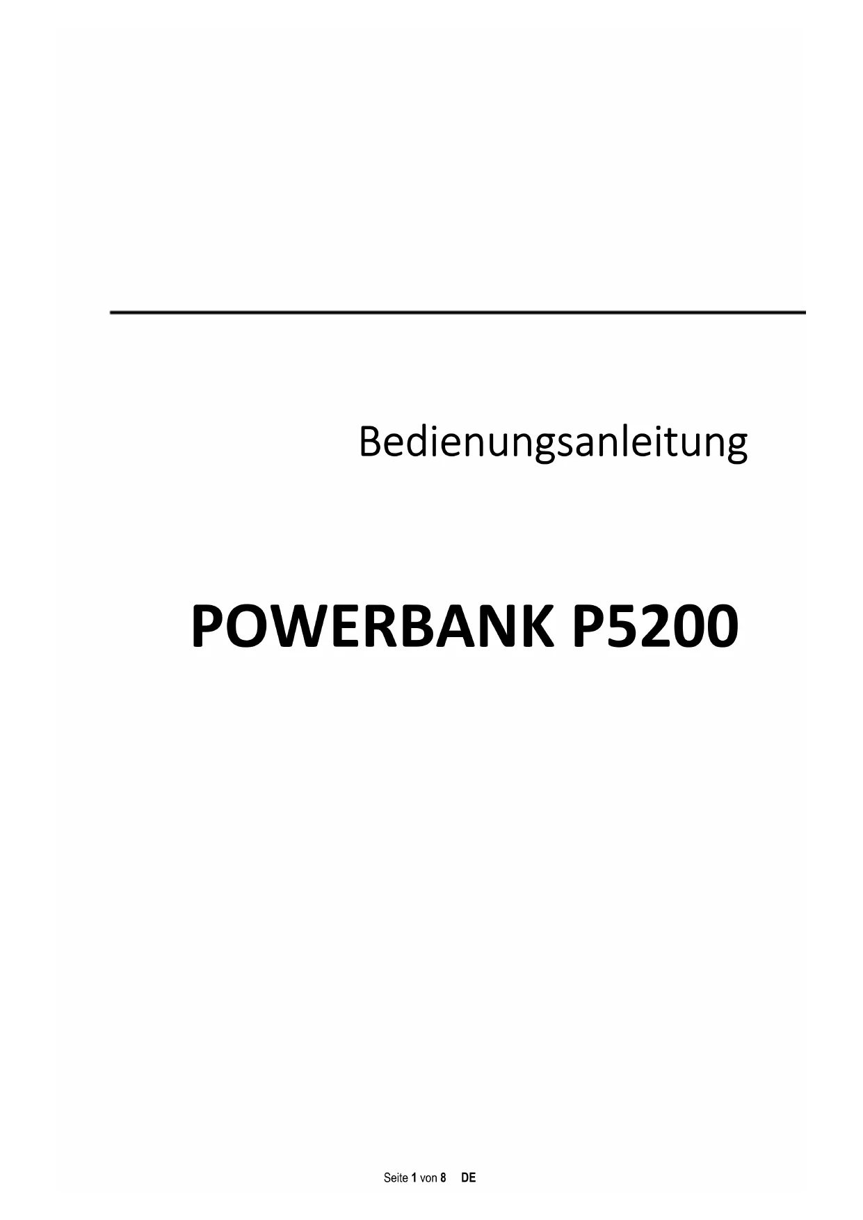 POWERBANK P5200Seite 2 von 8 DE Zu dieser Anleitung: Lesen Sie diese Anleitung sorgfältig durch und beachten und befolgen Sie bitte sämtliche in dieser Anleitung erwähnten Hinweise, um eine lange Lebensdauer und eine zuverlässige Nutzung des Gerätes zu gewährleisten. Heben Sie diese Anleitung griffbereit auf und geben Sie sie an andere Nutzer des Gerätes weiter. Bestimmungsgemäße Verwendung Diese Powerbank ist ausschließlich zur Stromversorgung von Geräten mit einer Betriebsspannung von 5V Gleichstrom (Mobiltelefone, MP3-Player, etc.) bestimmt. Eine andere oder darüber hinausgehende Benutzung gilt als nicht bestimmungsgemäß und kann zu Beschädigungen und Verletzungen führen. Ansprüche jeglicher Art wegen Schäden aus nicht bestimmungsgemäßer Verwendung sind ausgeschlossen. Um Fehlfunktionen zu vermeiden, verbinden Sie die USB- Ausgangsanschlüsse des Gerätes nicht mit USB Anschlüssen von Computern oder anderen Geräten. Sie sind nur zum Aufladen von Geräten bestimmt. Zerlegen Sie das Gerät nicht in seine Einzelteile, und versuchen Sie nicht, es selbst zu reparieren. Es enthält keine zu wartenden Teile und die Garantie erlischt in diesem Falle. Stecken Sie keine Gegenstände, die nicht für den Gebrauch vorgesehen sind, in die Öffnungen des Produkts. Es besteht die Gefahr eines Kurzschlusses. Bedienen Sie dieses Gerät nicht mit nassen Händen. Verwenden Sie bitte kein Wasser oder chemische Lösungen, um das Gerät zu säubern. Nutzen Sie dazu bitte nur ein trockenes Tuch. Das Gerät entwickelt bei der Nutzung Wärme, dies ist normal. Decken Sie das Produkt während der Nutzung nicht ab. Benutzen Sie das Gerät nicht, wenn es sichtbare Schäden aufweist oder feucht geworden ist. Sicherheitshinweise: Betriebsbedingungen: Betreiben Sie das Gerät bei 0 bis 40 Grad Celsius bei max. 90 % relativer Luftfeuchtigkeit. Falls Sie die Powerbank längere Zeit nicht benutzen, lagern Sie es zwischen -10 und 45 Grad Celsius bei max. 90 % relativer Luftfeuchtigkeit (für kurze Zeit) und laden Sie dieses alle drei Monate, um die volle Leistungsfähigkeit zu erhalten.Seite 3 von 8 DE Verwenden Sie das Gerät nicht in extrem kalten, heißen, feuchten oder staubigen Gebieten. Setzen Sie es ebenfalls keinen direkten Sonnenstrahlen aus. Schützen Sie das Produkt vor offenem Feuer. Es besteht Explosionsgefahr!
