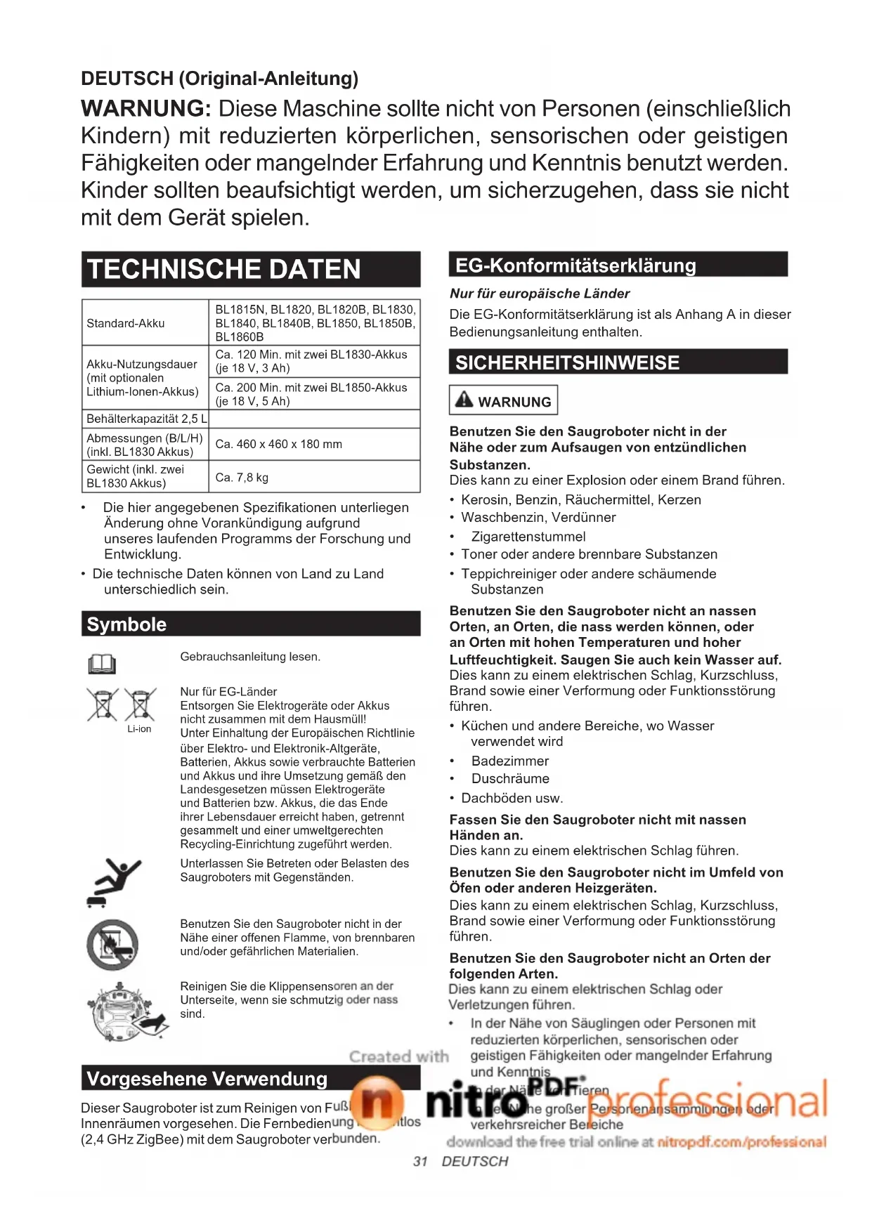 - Die technische Daten können von Land zu Land unterschiedlich sein. Symbole Gebrauchsanleitung lesen. Li-ion Nur für EG-Länder Entsorgen Sie Elektrogeräte oder Akkus nicht zusammen mit dem Hausmüll! Unter Einhaltung der Europäischen Richtlinie über Elektro- und Elektronik-Altgeräte, Batterien, Akkus sowie verbrauchte Batterien und Akkus und ihre Umsetzung gemäß den Landesgesetzen müssen Elektrogeräte und Batterien bzw. Akkus, die das Ende ihrer Lebensdauer erreicht haben, getrennt gesammelt und einer umweltgerechten Recycling-Einrichtung zugeführt werden. Unterlassen Sie Betreten oder Belasten des Saugroboters mit Gegenständen. Benutzen Sie den Saugroboter nicht in der Nähe einer offenen Flamme, von brennbaren und/oder gefährlichen Materialien. Reinigen Sie die Klippensensoren an der Unterseite, wenn sie schmutzig oder nass sind. Vorgesehene Verwendung Dieser Saugroboter ist zum Reinigen von Fußböden in Innenräumen vorgesehen. Die Fernbedienung ist drahtlos (2,4 GHz ZigBee) mit dem Saugroboter verbunden. EG-Konformitätserklärung Nur für europäische Länder Die EG-Konformitätserklärung ist als Anhang A in dieser Bedienungsanleitung enthalten. SICHERHEITSHINWEISE WARNUNG Benutzen Sie den Saugroboter nicht in der Nähe oder zum Aufsaugen von entzündlichen Substanzen. Dies kann zu einer Explosion oder einem Brand führen.