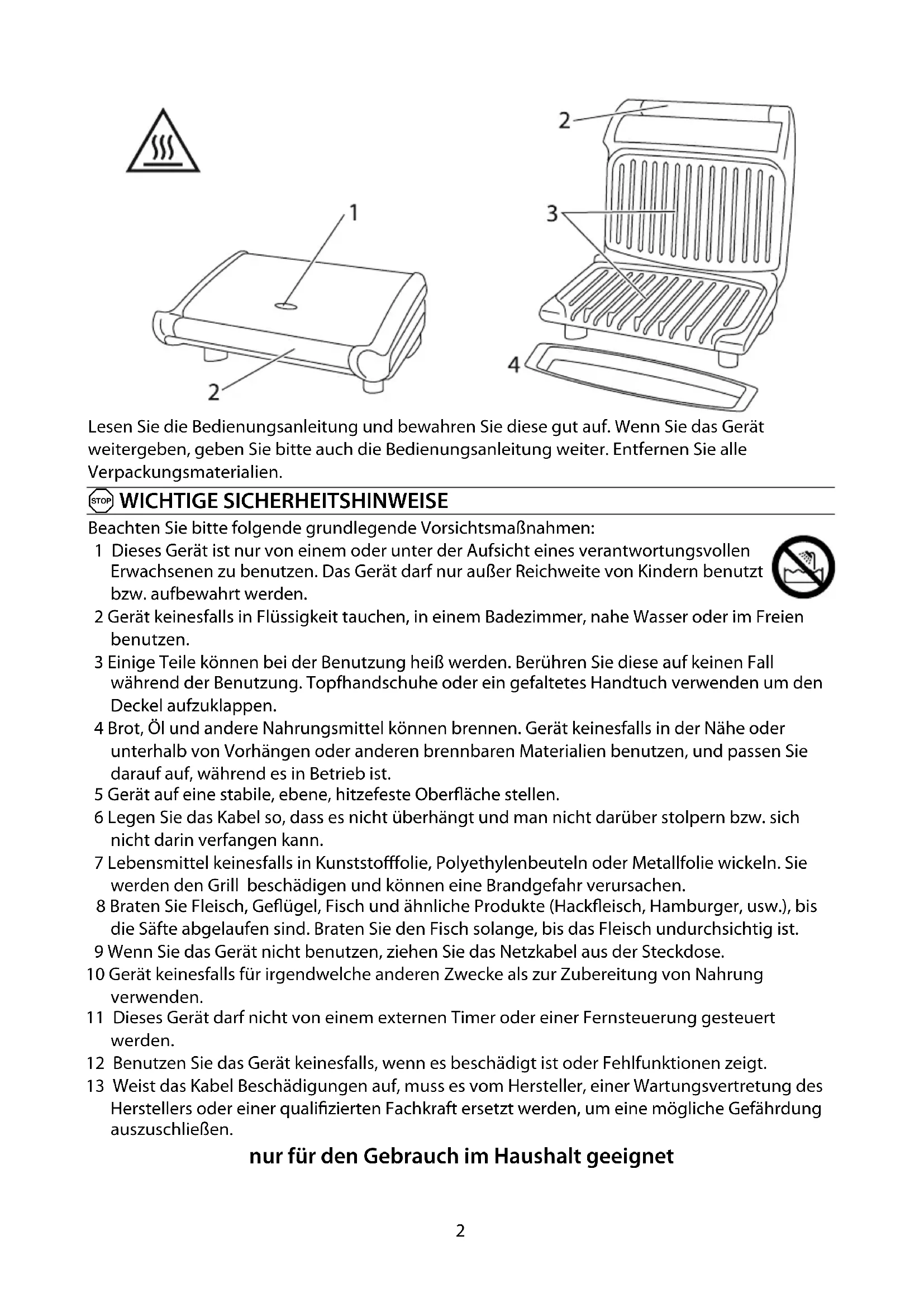 3 Einige Teile können bei der Benutzung heiß werden. Berühren Sie diese auf keinen Fall während der Benutzung. Topfhandschuhe oder ein gefaltetes Handtuch verwenden um den Deckel aufzuklappen.