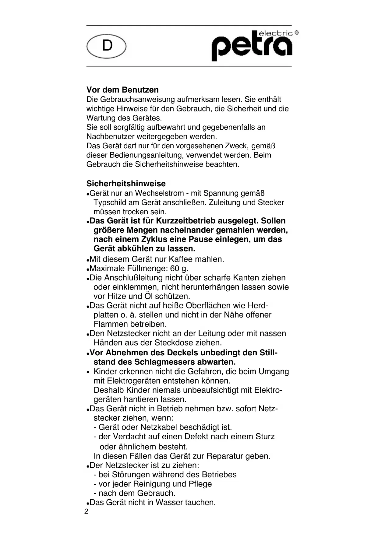 Kaffeemühle M85Vor dem Benutzen Die Gebrauchsanweisung aufmerksam lesen. Sie enthält wichtige Hinweise für den Gebrauch, die Sicherheit und die Wartung des Gerätes. Sie soll sorgfältig aufbewahrt und gegebenenfalls an Nachbenutzer weitergegeben werden. Das Gerät darf nur für den vorgesehenen Zweck, gemäß dieser Bedienungsanleitung, verwendet werden. Beim Gebrauch die Sicherheitshinweise beachten. Sicherheitshinweise Gerät nur an Wechselstrom - mit Spannung gemäß Typschild am Gerät anschließen. Zuleitung und Stecker müssen trocken sein. Das Gerät ist für Kurzzeitbetrieb ausgelegt. Sollen größere Mengen nacheinander gemahlen werden, nach einem Zyklus eine Pause einlegen, um das Gerät abkühlen zu lassen. Mit diesem Gerät nur Kaffee mahlen. Maximale Füllmenge: 60 g. Die Anschlußleitung nicht über scharfe Kanten ziehen oder einklemmen, nicht herunterhängen lassen sowie vor Hitze und Öl schützen. Das Gerät nicht auf heiße Oberflächen wie Herd- platten o. ä. stellen und nicht in der Nähe offener Flammen betreiben. Den Netzstecker nicht an der Leitung oder mit nassen Händen aus der Steckdose ziehen. Vor Abnehmen des Deckels unbedingt den Still- stand des Schlagmessers abwarten.