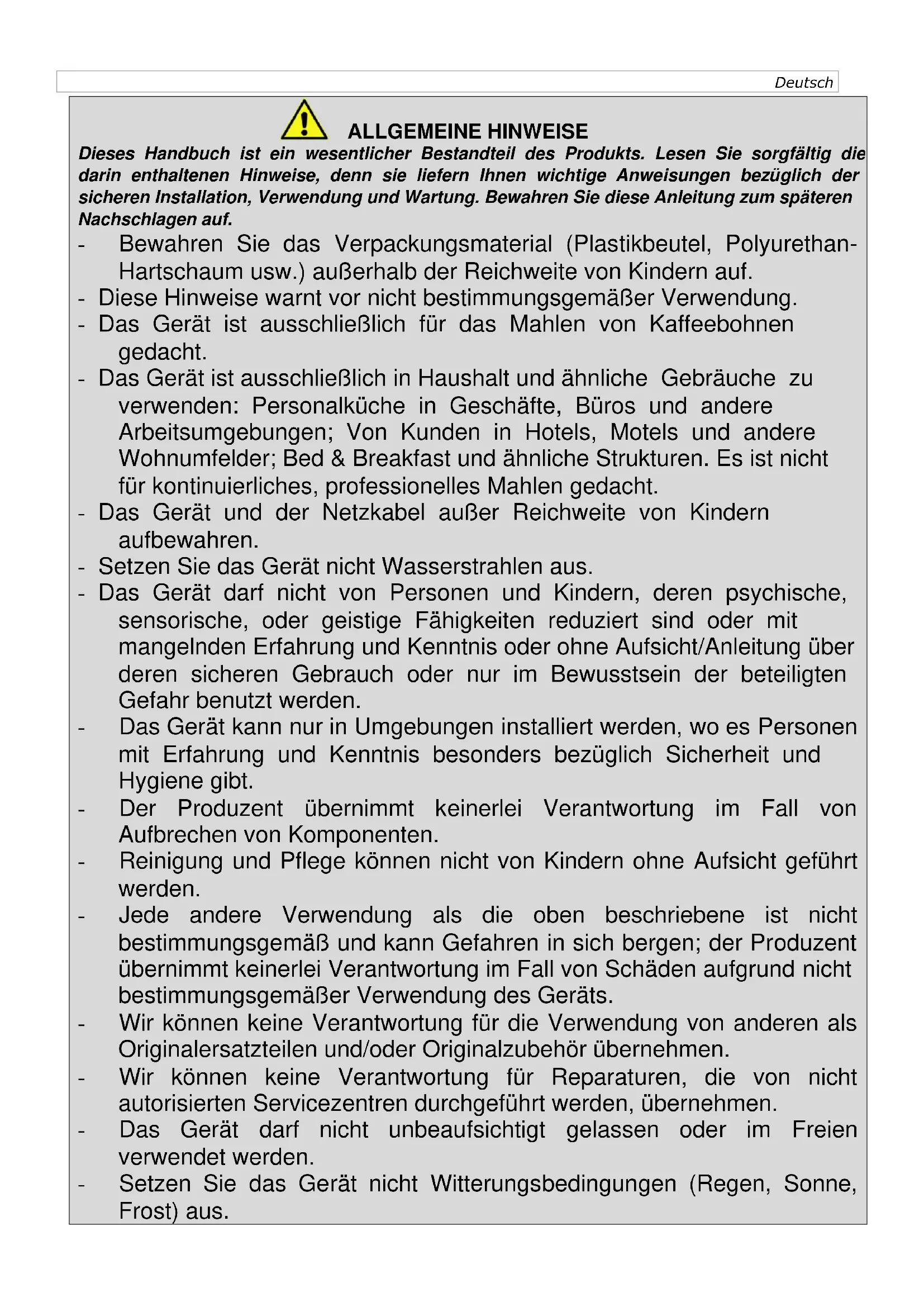 ALLGEMEINE HINWEISE Dieses Handbuch ist ein wesentlicher Bestandteil des Produkts. Lesen Sie sorgfältig die darin enthaltenen Hinweise, denn sie liefern Ihnen wichtige Anweisungen bezüglich der sicheren Installation, Verwendung und Wartung. Bewahren Sie diese Anleitung zum späteren Nachschlagen auf. - Bewahren Sie das Verpackungsmaterial (Plastikbeutel, Polyurethan- Hartschaum usw.) außerhalb der Reichweite von Kindern auf. - Diese Hinweise warnt vor nicht bestimmungsgemäßer Verwendung. - Das Gerät ist ausschließlich für das Mahlen von Kaffeebohnen gedacht. - Das Gerät ist ausschließlich in Haushalt und ähnliche Gebräuche zu verwenden: Personalküche in Geschäfte, Büros und andere Arbeitsumgebungen; Von Kunden in Hotels, Motels und andere Wohnumfelder; Bed & Breakfast und ähnliche Strukturen. Es ist nicht für kontinuierliches, professionelles Mahlen gedacht. - Das Gerät und der Netzkabel außer Reichweite von Kindern aufbewahren. - Setzen Sie das Gerät nicht Wasserstrahlen aus. - Das Gerät darf nicht von Personen und Kindern, deren psychische, sensorische, oder geistige Fähigkeiten reduziert sind oder mit mangelnden Erfahrung und Kenntnis oder ohne Aufsicht/Anleitung über deren sicheren Gebrauch oder nur im Bewusstsein der beteiligten Gefahr benutzt werden. - Das Gerät kann nur in Umgebungen installiert werden, wo es Personen mit Erfahrung und Kenntnis besonders bezüglich Sicherheit und Hygiene gibt. - Der Produzent übernimmt keinerlei Verantwortung im Fall von Aufbrechen von Komponenten. - Reinigung und Pflege können nicht von Kindern ohne Aufsicht geführt werden. - Jede andere Verwendung als die oben beschriebene ist nicht bestimmungsgemäß und kann Gefahren in sich bergen; der Produzent übernimmt keinerlei Verantwortung im Fall von Schäden aufgrund nicht bestimmungsgemäßer Verwendung des Geräts. - Wir können keine Verantwortung für die Verwendung von anderen als Originalersatzteilen und/oder Originalzubehör übernehmen. - Wir können keine Verantwortung für Reparaturen, die von nicht autorisierten Servicezentren durchgeführt werden, übernehmen. - Das Gerät darf nicht unbeaufsichtigt gelassen oder im Freien verwendet werden. - Setzen Sie das Gerät nicht Witterungsbedingungen (Regen, Sonne, Frost) aus.- Das Gerät nicht mit Wasserstrahl reinigen oder ins Wasser tauchen. In allen oben genannten Fällen erlischt die Garantie.