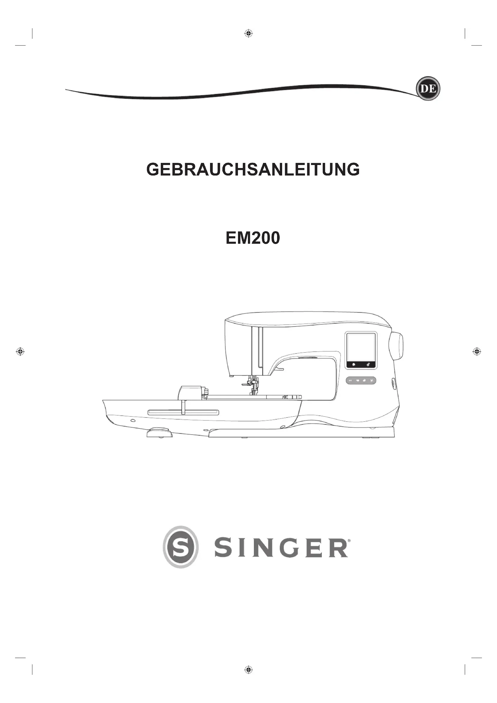 - Eine defekte oder zerbrochene LED-Lampe muss, zur Vermeidung von Gefahren, vom Hersteller, dessen Kundendienst oder einer gleichermaßen quali¿ zierten Person ausgetauscht werden.3 VORWORT Sie sind nun im Besitz einer modernen Stickmaschine. Diese Maschine ist für den Hausgebrauch bestimmt und unterstützt Sie mit exzellenter Leistung beim Sticken von Designs oder Schriften. Lesen Sie diese Gebrauchsanleitung aufmerksam und komplett durch, um die Maschine richtig zu verwenden und um eine optimale Leistung der SINGER® EM 200 zu erzielen. Machen Sie sich dann mit der Maschine vertaut und gehen Sie die Gebrauchsanleitung gerne auch thematisch durch. Damit Ihnen immer die aktuellsten Stickfunktionalitäten zur Verfügung stehen, behält sich der Hersteller das Recht auf Änderung von Design oder Zubehör dieser Stickmaschine vor, ohne vorherige Information. FÜR EUROPA UND LÄNDER AUßERHALB EUROPAS Dieses Gerät kann von Kindern ab einem Alter von 8 Jahren und Personen mit eingeschränkten physischen, sensorischen oder mentalen Fähigkeiten oder mangelnder Erfahrung und Kenntnisse verwendet werden, wenn diese unter Aufsicht stehen oder Anweisungen zum sicheren Gebrauch des Geräts erhalten haben und die damit verbundenen Gefahren verstehen. Kinder dürfen nicht mit dem Gerät spielen. Reinigungs- und Instandhaltungsarbeiten dürfen von Kindern nur unter Aufsicht durchgeführt werden. Der Geräuschpegel bei normalen Betriebsbedingungen liegt unter 70 dB.
