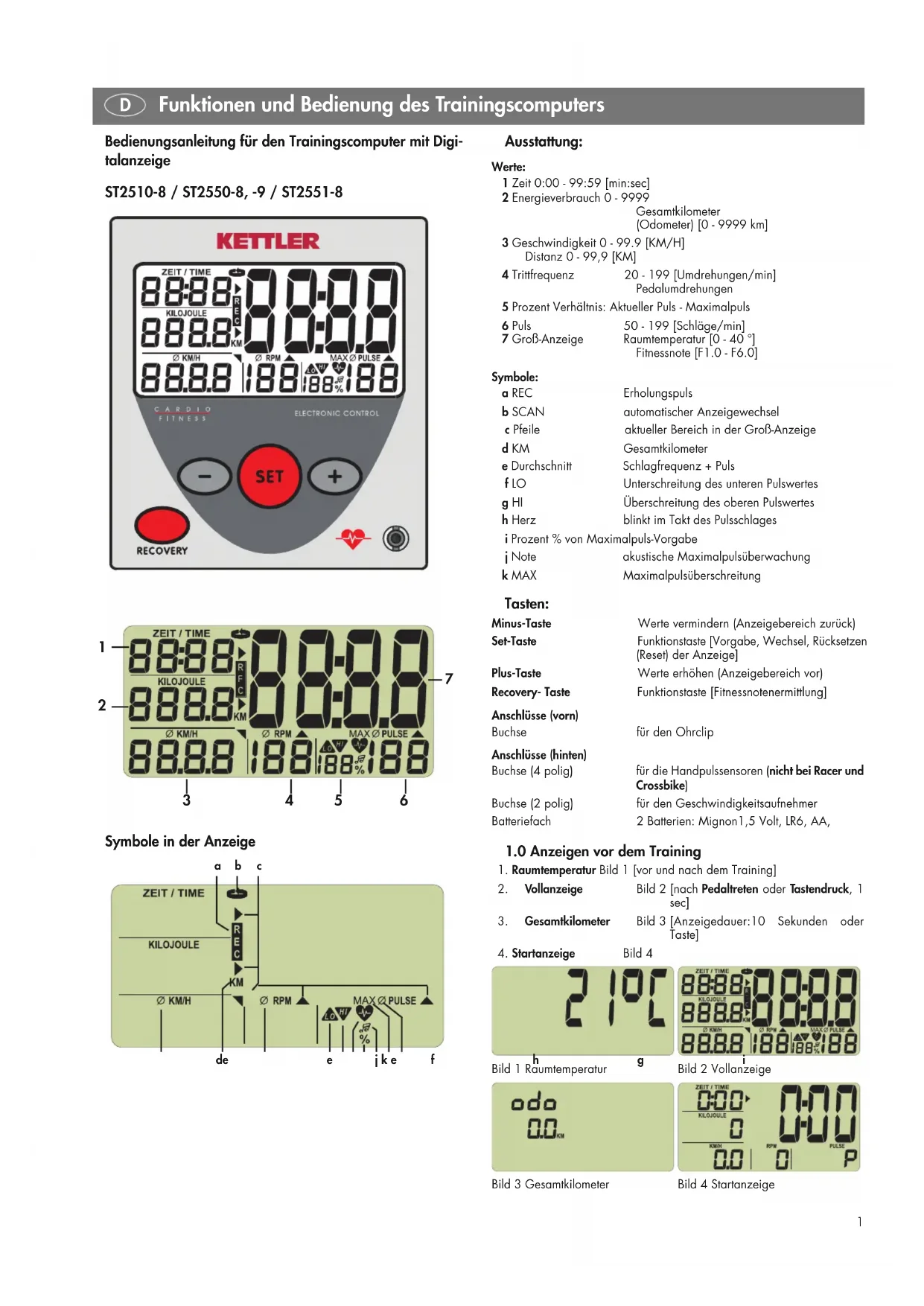 abc deefhgi j k e Ausstattung: Werte: 1 Zeit 0:00 - 99:59 [min:sec] 2 Energieverbrauch 0 - 9999 Gesamtkilometer (Odometer) [0 - 9999 km] 3 Geschwindigkeit 0 - 99.9 [KM/H] Distanz 0 - 99,9 [KM] 4 Trittfrequenz 20 - 199 [Umdrehungen/min] Pedalumdrehungen 5 Prozent Verhältnis: Aktueller Puls - Maximalpuls 6 Puls 50 - 199 [Schläge/min] 7 Groß-Anzeige Raumtemperatur [0 - 40 °] Fitnessnote [F1.0 - F6.0] Symbole: a REC Erholungspuls b SCAN automatischer Anzeigewechsel c Pfeile aktueller Bereich in der Groß-Anzeige d KM Gesamtkilometer e Durchschnitt Schlagfrequenz + Puls f LO Unterschreitung des unteren Pulswertes g HI Überschreitung des oberen Pulswertes h Herz blinkt im Takt des Pulsschlages i Prozent % von Maximalpuls-Vorgabe j Note akustische Maximalpulsüberwachung k MAX Maximalpulsüberschreitung Tasten: Minus-Taste Werte vermindern (Anzeigebereich zurück) Set-Taste Funktionstaste [Vorgabe, Wechsel, Rücksetzen (Reset) der Anzeige] Plus-Taste Werte erhöhen (Anzeigebereich vor) Recovery- Taste Funktionstaste [Fitnessnotenermittlung] Anschlüsse (vorn) Buchse für den Ohrclip Anschlüsse (hinten) Buchse (4 polig) für die Handpulssensoren (nicht bei Racer und Crossbike) Buchse (2 polig) für den Geschwindigkeitsaufnehmer Batteriefach 2 Batterien: Mignon1,5 Volt, LR6, AA,