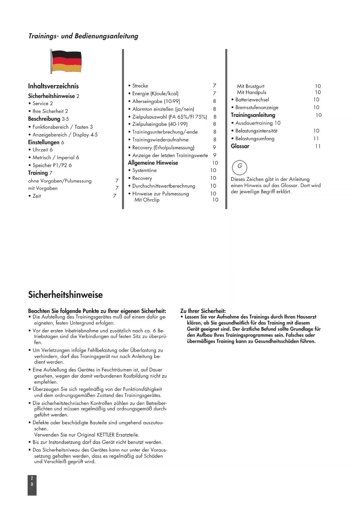 - Um Verletzungen infolge Fehlbelastung oder Überlastung zuverhindern, darf das Traningsgerät nur nach Anleitung be-dient werden.• Eine Aufstellung des Gerätes in Feuchträumen ist, auf Dauergesehen, wegen der damit verbundenen Rostbildung nicht zuempfehlen.• Überzeugen Sie sich regelmäßig von der Funktionsfähigkeitund dem ordnungsgemäßen Zustand des Trainingsgerätes.• Die sicherheitstechnischen Kontrollen zählen zu den Betreiber-pflichten und müssen regelmäßig und ordnungsgemäß durch-geführt werden.• Defekte oder beschädigte Bauteile sind umgehend auszutau-schen. Verwenden Sie nur Original KETTLER Ersatzteile.• Bis zur Instandsetzung darf das Gerät nicht benutzt werden.• Das Sicherheitsniveau des Gerätes kann nur unter der Voraus-setzung gehalten werden, dass es regelmäßig auf Schädenund Verschleiß geprüft wird. Inhaltsverzeichnis Sicherheitshinweise 2