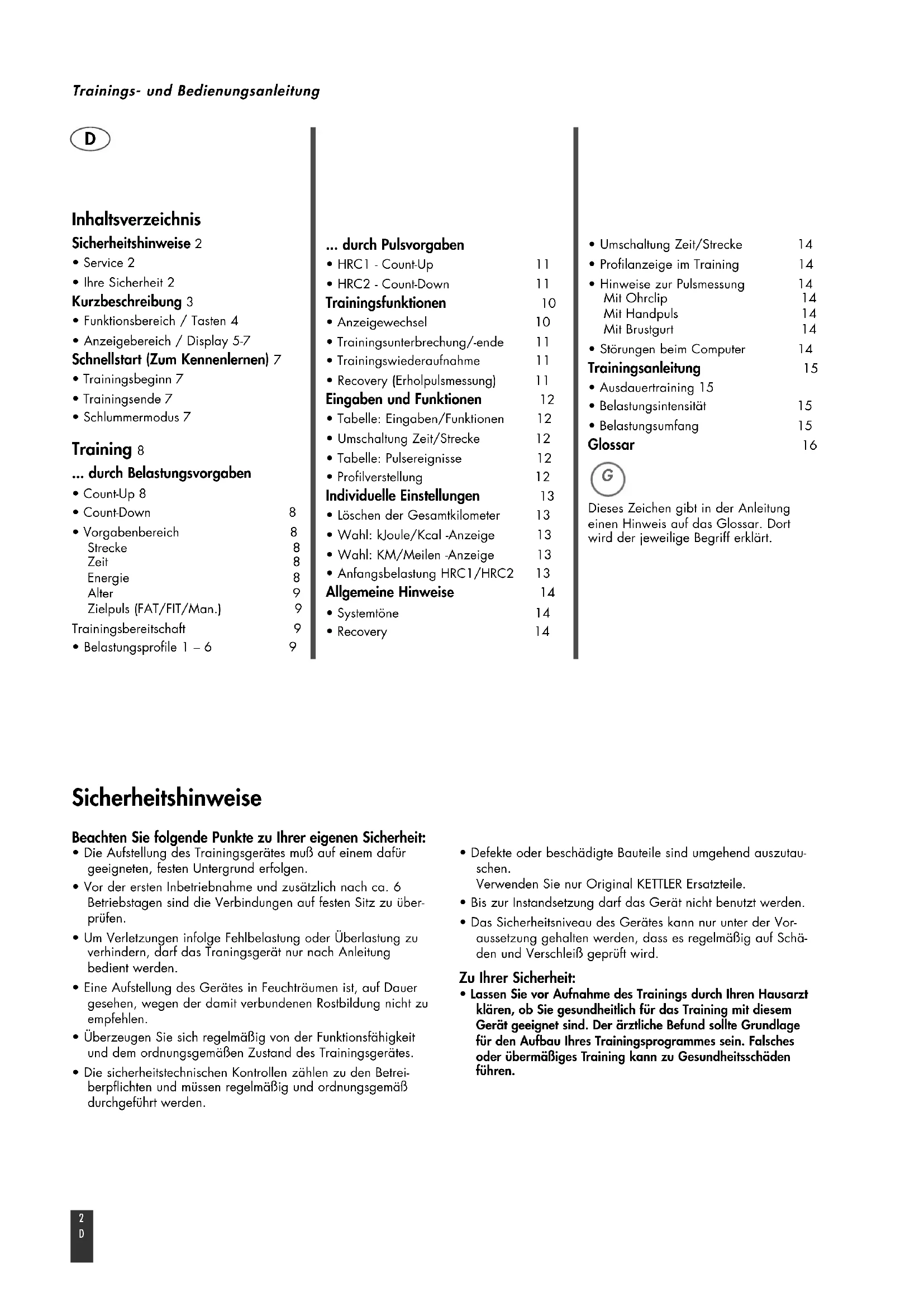 - Die Aufstellung des Trainingsgerätes muß auf einem dafürgeeigneten, festen Untergrund erfolgen. • Vor der ersten Inbetriebnahme und zusätzlich nach ca. 6Betriebstagen sind die Verbindungen auf festen Sitz zu über-prüfen.• Um Verletzungen infolge Fehlbelastung oder Überlastung zuverhindern, darf das Traningsgerät nur nach Anleitungbedient werden.• Eine Aufstellung des Gerätes in Feuchträumen ist, auf Dauergesehen, wegen der damit verbundenen Rostbildung nicht zuempfehlen.• Überzeugen Sie sich regelmäßig von der Funktionsfähigkeitund dem ordnungsgemäßen Zustand des Trainingsgerätes.• Die sicherheitstechnischen Kontrollen zählen zu den Betrei-berpflichten und müssen regelmäßig und ordnungsgemäßdurchgeführt werden.• Defekte oder beschädigte Bauteile sind umgehend auszutau-schen. Verwenden Sie nur Original KETTLER Ersatzteile.• Bis zur Instandsetzung darf das Gerät nicht benutzt werden.• Das Sicherheitsniveau des Gerätes kann nur unter der Vor-aussetzung gehalten werden, dass es regelmäßig auf Schä-den und Verschleiß geprüft wird. Zu Ihrer Sicherheit: