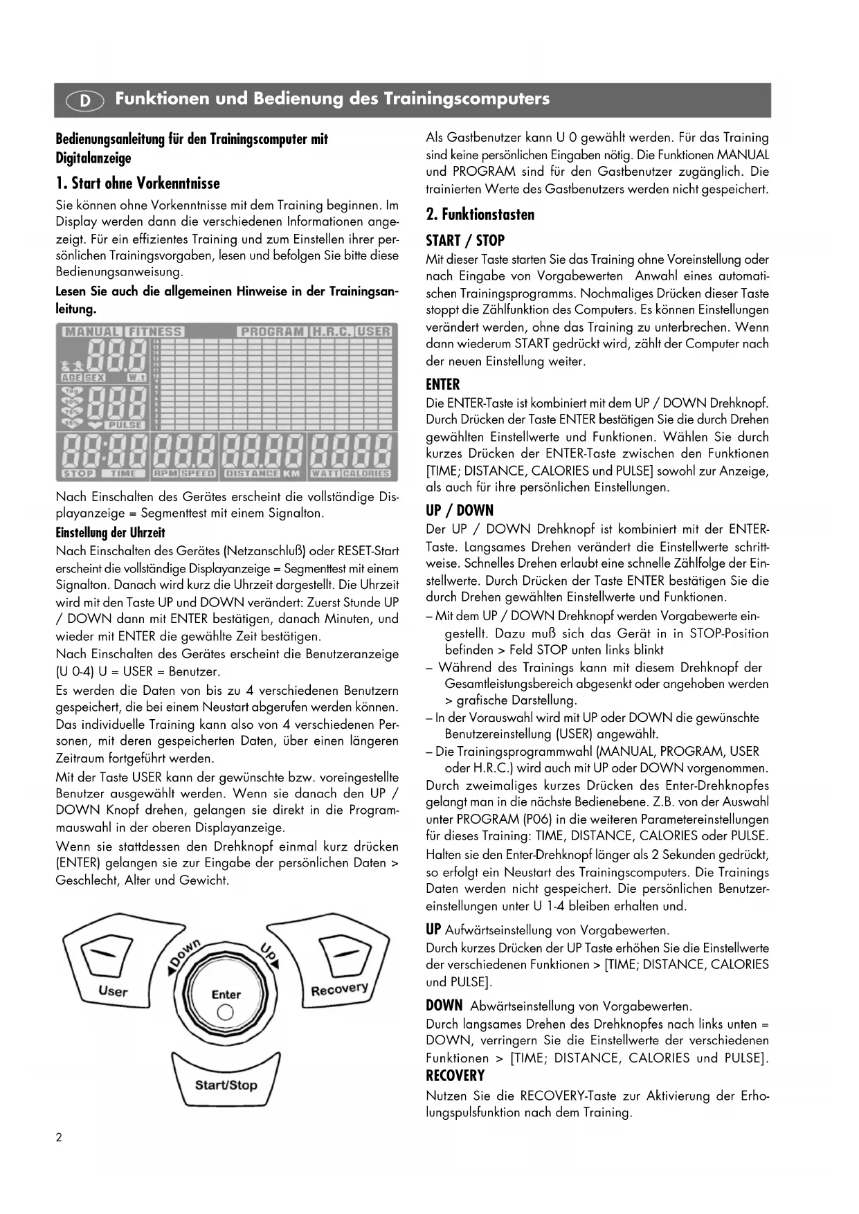 START / STOP Mit dieser Taste starten Sie das Training ohne Voreinstellung oder nach Eingabe von Vorgabewerten Anwahl eines automati- schen Trainingsprogramms. Nochmaliges Drücken dieser Taste stoppt die Zählfunktion des Computers. Es können Einstellungen verändert werden, ohne das Training zu unterbrechen. Wenn dann wiederum START gedrückt wird, zählt der Computer nach der neuen Einstellung weiter. ENTER Die ENTER-Taste ist kombiniert mit dem UP / DOWN Drehknopf. Durch Drücken der Taste ENTER bestätigen Sie die durch Drehen gewählten Einstellwerte und Funktionen. Wählen Sie durch kurzes Drücken der ENTER-Taste zwischen den Funktionen [TIME; DISTANCE, CALORIES und PULSE] sowohl zur Anzeige, als auch für ihre persönlichen Einstellungen. UP / DOWN Der UP / DOWN Drehknopf ist kombiniert mit der ENTER- Taste. Langsames Drehen verändert die Einstellwerte schritt- weise. Schnelles Drehen erlaubt eine schnelle Zählfolge der Ein- stellwerte. Durch Drücken der Taste ENTER bestätigen Sie die durch Drehen gewählten Einstellwerte und Funktionen. – Mit dem UP / DOWN Drehknopf werden Vorgabewerte ein- gestellt. Dazu muß sich das Gerät in in STOP-Position befinden > Feld STOP unten links blinkt – Während des Trainings kann mit diesem Drehknopf der Gesamtleistungsbereich abgesenkt oder angehoben werden > grafische Darstellung. – In der Vorauswahl wird mit UP oder DOWN die gewünschte Benutzereinstellung (USER) angewählt. – Die Trainingsprogrammwahl (MANUAL, PROGRAM, USER oder H.R.C.) wird auch mit UP oder DOWN vorgenommen. Durch zweimaliges kurzes Drücken des Enter-Drehknopfes gelangt man in die nächste Bedienebene. Z.B. von der Auswahl unter PROGRAM (P06) in die weiteren Parametereinstellungen für dieses Training: TIME, DISTANCE, CALORIES oder PULSE. Halten sie den Enter-Drehknopf länger als 2 Sekunden gedrückt, so erfolgt ein Neustart des Trainingscomputers. Die Trainings Daten werden nicht gespeichert. Die persönlichen Benutzer- einstellungen unter U 1-4 bleiben erhalten und. UP Aufwärtseinstellung von Vorgabewerten. Durch kurzes Drücken der UP Taste erhöhen Sie die Einstellwerte der verschiedenen Funktionen > [TIME; DISTANCE, CALORIES und PULSE]. DOWN Abwärtseinstellung von Vorgabewerten. Durch langsames Drehen des Drehknopfes nach links unten = DOWN, verringern Sie die Einstellwerte der verschiedenen Funktionen > [TIME; DISTANCE, CALORIES und PULSE]. RECOVERY Nutzen Sie die RECOVERY-Taste zur Aktivierung der Erho- lungspulsfunktion nach dem Training.