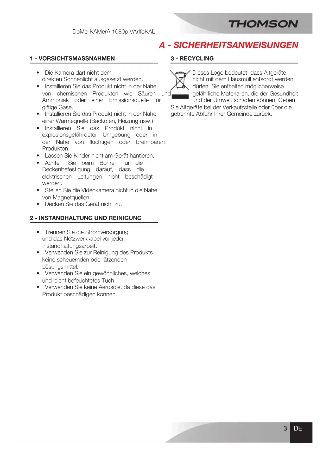 F - TecHNIScHe uNd geSeTzLIcHe INForMATIoNeN 2 - FUNKTIONELLE MERKMALE• VerwendungimAußenbereich:überdacht• Befestigung:Decke• Regenschutz:nein• IntegriertesMikrofon:nein• Nachtsicht:bis20m3 - GARANTIE• Für dieses Gerät gilt ab Kaufdatum eine2-jährige Garantie auf Teile und Reparaturen.Es ist zwingend notwendig, dass Sie denKaufnachweis während der gesamtenGarantiedaueraufbewahren.• DieGarantiegiltnichtfürSchäden,diedurchNachlässigkeit,Stöße oderUnfälle verursachtwurden.• Die Elemente dieses Geräts dürfen vonPersonen,dienichtzuAVIDSENgehören, wedergeöffnetnochrepariertwerden.•JeglicherEingriffamGerätführtzumErlöschenderGarantie.• Verbrauchselementewie Batterienfallen nichtunterdieGarantie.4 - HILFE UND SUPPORT• TrotzallerSorgfalt,diewirbeiderKonzeptionunserer Produkte und der Verfassung dieserBedienungsanleitung aufgewendet haben,kannessein,dassSiewährendderInstallationIhresGeräts aufSchwierigkeiten oder Fragenstoßen.IndiesemFallratenwirIhnendringend,unsere Spezialisten zu kontaktieren, die Siegerneberaten.• SolltenbeiderInstallationoderderVerwendungin den Tagen danach Funktionsstörungenauftreten, ist es zwingend erforderlich, dassSie unskontaktieren, während Siedas Gerätvor sich haben. So könnenunsere Technikerdie Ursache des Problems diagnostizieren,denndiesesistwahrscheinlichaufeinefalscheEinstellung oder eine nicht ordnungsgemäßeInstallationzurückzuführen.SolltedasProblemvom Gerät verursacht werden, erhalten Sie vom Techniker eine Bearbeitungsnummer für eine Rückgabe im Geschäft. Ohne dieseNummeristdasGeschäftdazuberechtigt,denUmtauschIhresGerätsabzulehnen.SieerreichenunsereKundendienst-Technikerunter: Tel : +324/264.86.68. Von Montag bis Freitag von 9:00 bis 12:00 Uhr und von 13:00 bis 17:00 Uhr5 - GERÄTEUMTAUSCH - KUNDENDIENSTTrotzallerSorgfalt,diewirbeiderKonzeptionundHerstellungIhresGerätsaufgewendethaben,kanneserforderlichsein,dassSieIhrGerätfüreineReparaturinunsererWerkstattandenKundendienstzurückschicken.SiekönnendenBearbeitungsstandaufunsererWebsiteunterderfolgendenAdresseabfragen:http://sav.avidsen. com Die komplette Produktpalette von Thomson finden Sie auf: