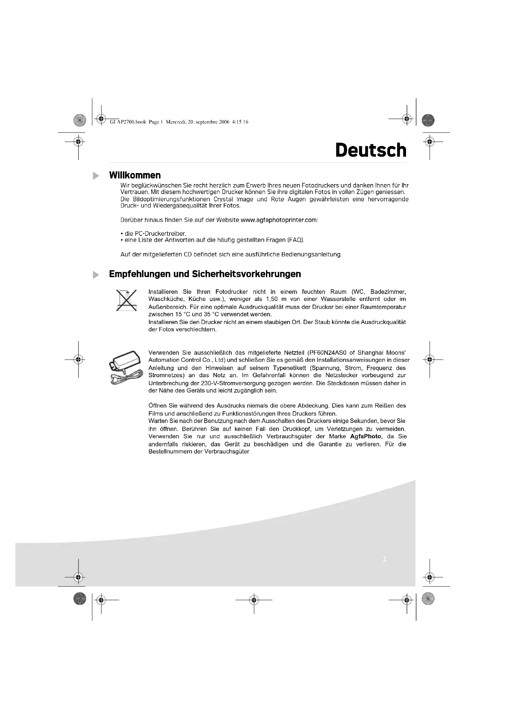 Wir beglückwänden Sie recht herzlich zum Erwerb Ihr's neuen Fotodruckers und danken Ihnen für Ihr Vertrauen. Mit diesen hochwertigen Drucker konnen Sie ihre digitalen Fotos in vollen Zügen genieessen. Die Bildoptimierungsfunktionen Crystal Image und Rote Augen gewährleisten eine hervorragende Druck- und Wiedergabequalität ihrer Fotos.