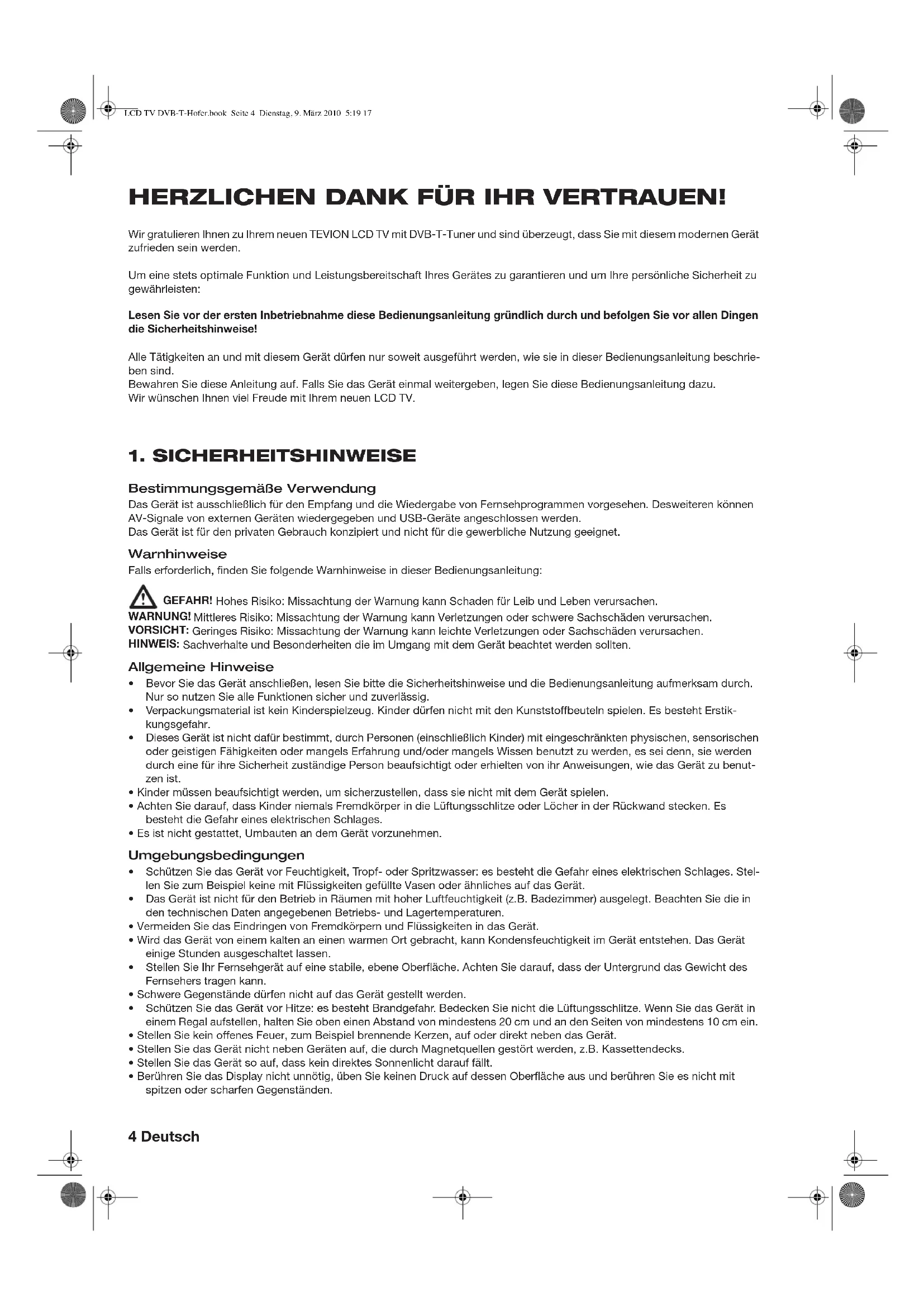 16. Problemlösungen ........................................................................................................ 22 17. Technische Daten ...................................................................................................... 23 LCD TV DVB-T-Hofer.book Seite 3 Dienstag, 9. März 2010 5:19 174 Deutsch HERZLICHEN DANK FÜR IHR VERTRAUEN! Wir gratulieren Ihnen zu Ihrem neuen TEVION LCD TV mit DVB-T-Tuner und sind überzeugt, dass Sie mit diesem modernen Gerät zufrieden sein werden. Um eine stets optimale Funktion und Leistungsbereitschaft Ihres Gerätes zu garantieren und um Ihre persönliche Sicherheit zu gewährleisten: Lesen Sie vor der ersten Inbetriebnahme diese Bedienungsanleitung gründlich durch und befolgen Sie vor allen Dingen die Sicherheitshinweise! Alle Tätigkeiten an und mit diesem Gerät dürfen nur soweit ausgeführt werden, wie sie in dieser Bedienungsanleitung beschrie- ben sind. Bewahren Sie diese Anleitung auf. Falls Sie das Gerät einmal weitergeben, legen Sie diese Bedienungsanleitung dazu. Wir wünschen Ihnen viel Freude mit Ihrem neuen LCD TV.