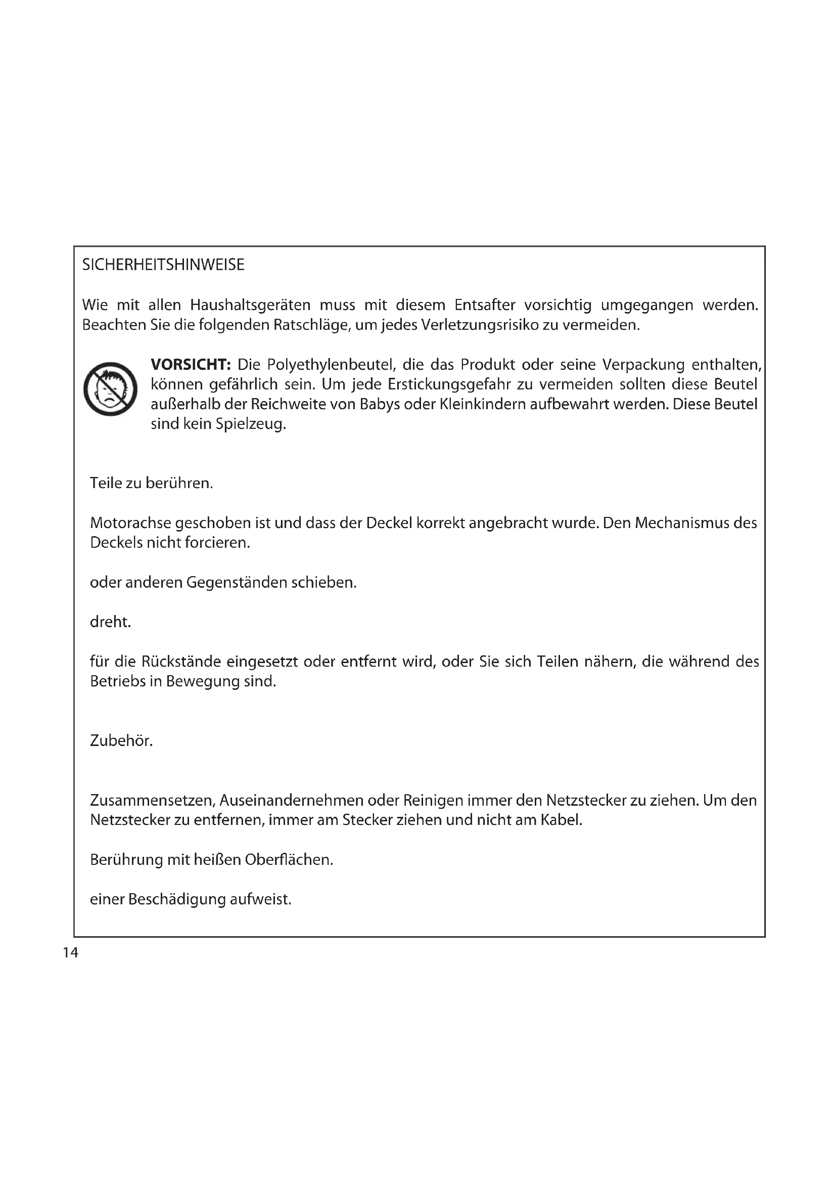 - Make sure the lter is properly positioned.14 SICHERHEITSHINWEISE Wie mit allen Haushaltsgeräten muss mit diesem Entsafter vorsichtig umgegangen werden. Beachten Sie die folgenden Ratschläge, um jedes Verletzungsrisiko zu vermeiden. VORSICHT: Die Polyethylenbeutel, die das Produkt oder seine Verpackung enthalten, können gefährlich sein. Um jede Erstickungsgefahr zu vermeiden sollten diese Beutel außerhalb der Reichweite von Babys oder Kleinkindern aufbewahrt werden. Diese Beutel sind kein Spielzeug.