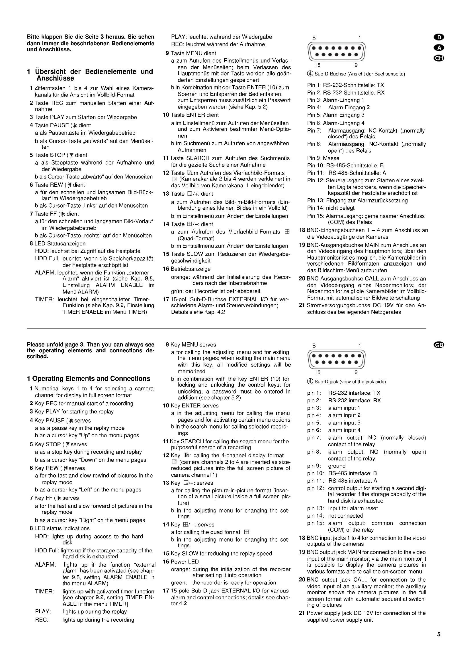 | Alarmeingänge: ....... ein Eingang pro Kamerakanal mit gemeinsamer Masse; einzeln wählbare Polarität: TTL-Low/NO oder TTL-High (5 V)/ NC |