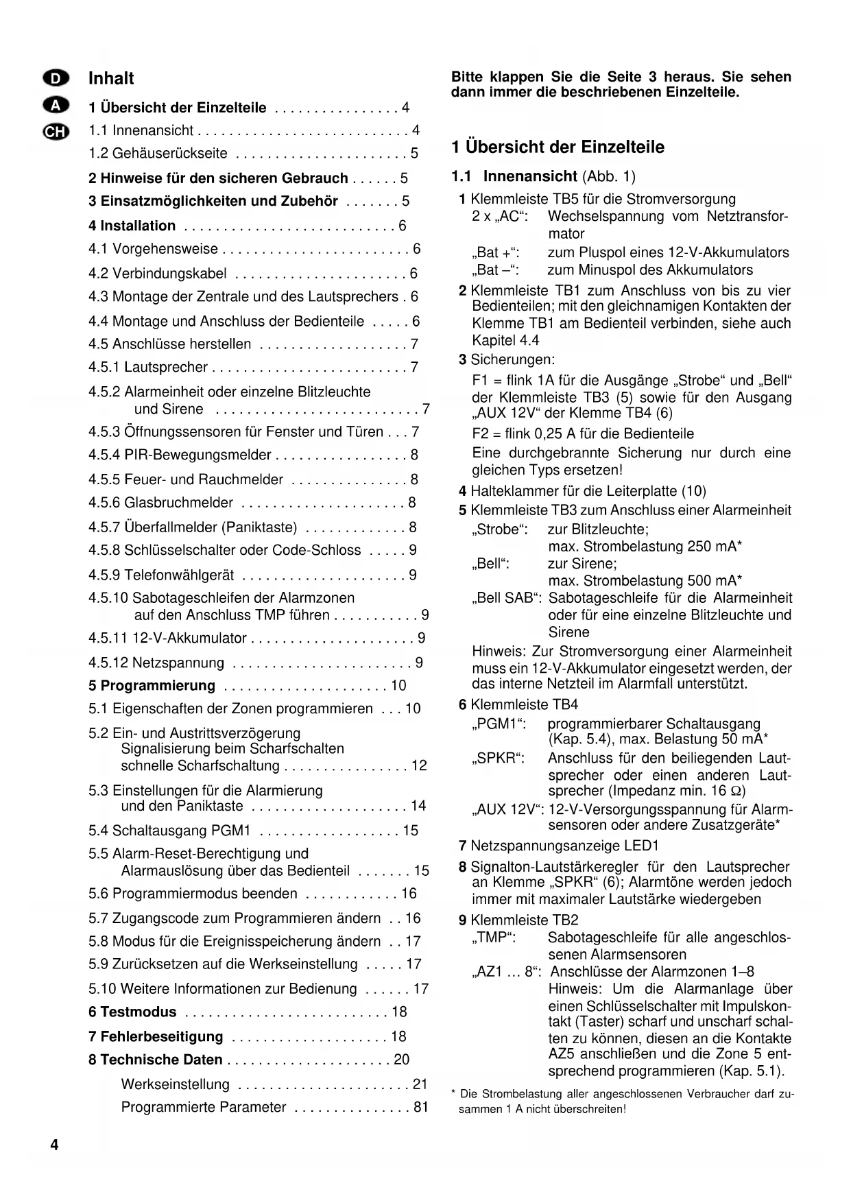 - Programmierte Parameter Bitte klappen Sie die Seite 3 heraus. Sie sehen dann immer die beschriebenen Einzelteile. 1 Übersicht der Einzelteile p. 81