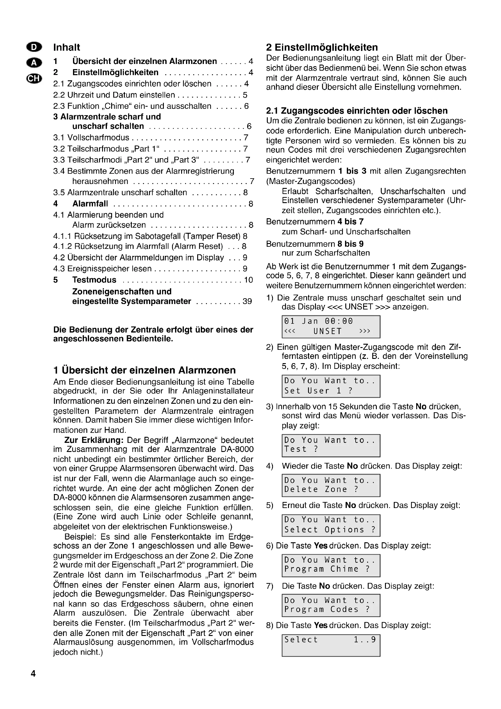 5Testmodus . . . . . . . . . . . . . . . . . . . . . . . . . . 10 Zoneneigenschaften und eingestellte Systemparameter . . . . . . . . . . 39 Die Bedienung der Zentrale erfolgt über eines der angeschlossenen Bedienteile. 1 Übersicht der einzelnen Alarmzonen Am Ende dieser Bedienungsanleitung ist eine Tabelle abgedruckt, in der Sie oder Ihr Anlageninstallateur Informationen zu den einzelnen Zonen und zu den ein- gestellten Parametern der Alarmzentrale eintragen können. Damit haben Sie immer diese wichtigen Infor- mationen zur Hand. Zur Erklärung: Der Begriff „Alarmzone“ bedeutet im Zusammenhang mit der Alarmzentrale DA-8000 nicht unbedingt ein bestimmter örtlicher Bereich, der von einer Gruppe Alarmsensoren überwacht wird. Das ist nur der Fall, wenn die Alarmanlage auch so einge- richtet wurde. An eine der acht möglichen Zonen der DA-8000 können die Alarmsensoren zusammen ange- schlossen sein, die eine gleiche Funktion erfüllen. (Eine Zone wird auch Linie oder Schleife genannt, abgeleitet von der elektrischen Funktionsweise.) Beispiel: Es sind alle Fensterkontakte im Erdge- schoss an der Zone 1 angeschlossen und alle Bewe- gungsmelder im Erdgeschoss an der Zone 2. Die Zone 2 wurde mit der Eigenschaft „Part 2“ programmiert. Die Zentrale löst dann im Teilscharfmodus „Part 2“ beim Öffnen eines der Fenster einen Alarm aus, ignoriert jedoch die Bewegungsmelder. Das Reinigungsperso- nal kann so das Erdgeschoss säubern, ohne einen Alarm auszulösen. Die Zentrale überwacht aber bereits die Fenster. (Im Teilscharfmodus „Part 2“ wer- den alle Zonen mit der Eigenschaft „Part 2“ von einer Alarmauslösung ausgenommen, im Vollscharfmodus jedoch nicht.) 2 Einstellmöglichkeiten Der Bedienungsanleitung liegt ein Blatt mit der Über- sicht über das Bedienmenü bei. Wenn Sie schon etwas mit der Alarmzentrale vertraut sind, können Sie auch anhand dieser Übersicht alle Einstellung vornehmen.