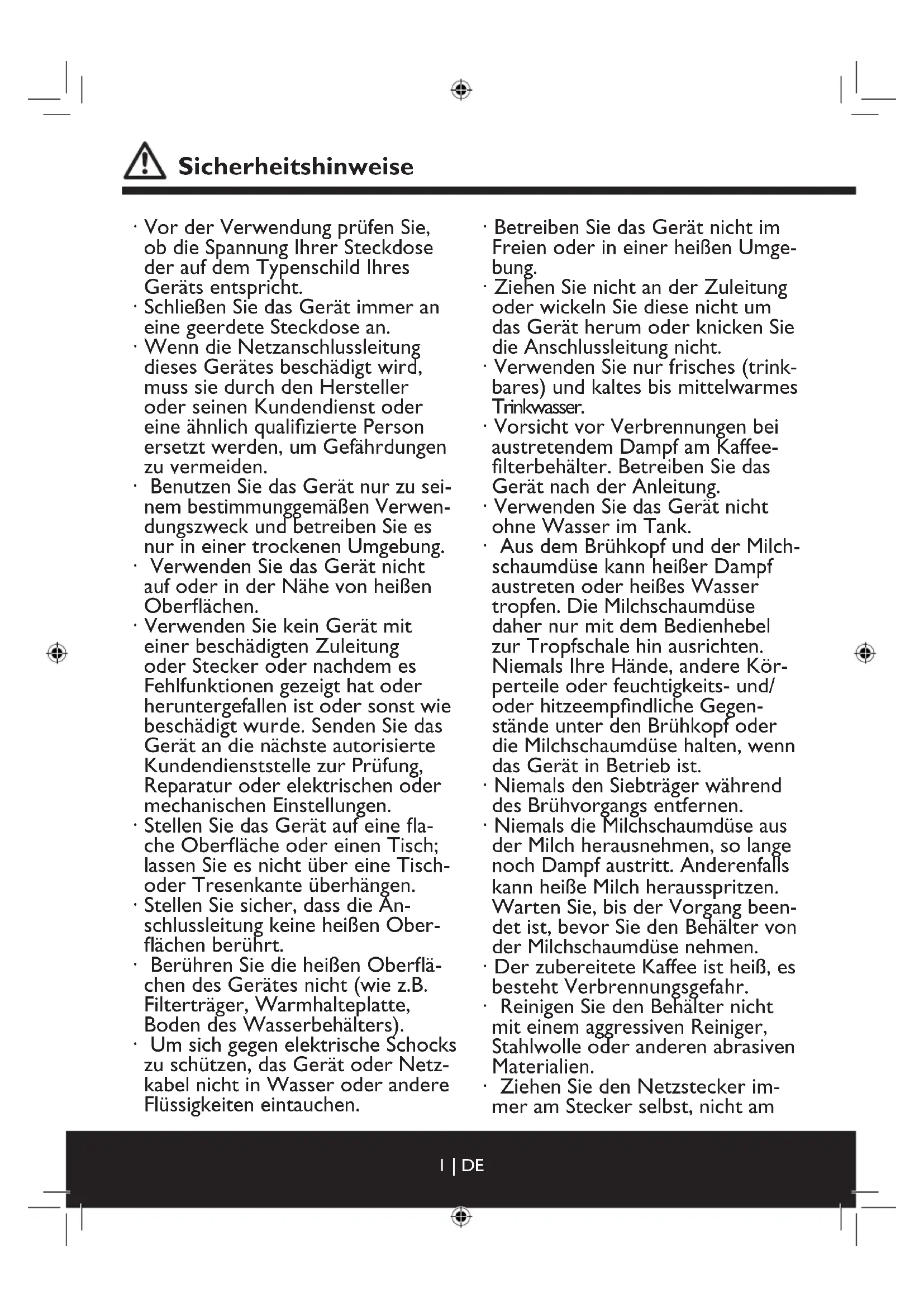 Dieses Gerät ist nur zur Zubereitung von Kaffee- und Milchgeträken für die Verwendung im Haushalt oder ähnlichen, nicht-gewerblichen Bereichen bestimmt, wie z. B. Personalküchen in Läden, Cafés, Büros oder einem anderen beruflichen Umfeld, landwirtschaftliche Anwesen, Nutzung durch Gänge in Hotels, Motels und anderen Wohnanlagen, Bed and Breakfast-Gasthauer. Eine andere oder darüber hinausgehende Benutzung gilt als nicht bestimmungsgemäß. Ansprüche jeglicher Art wegen Schäden aus nicht bestimmungsgemäßer Verwendung sind ausgeschlossen. Das Risikoträgt allein der Betreiber.