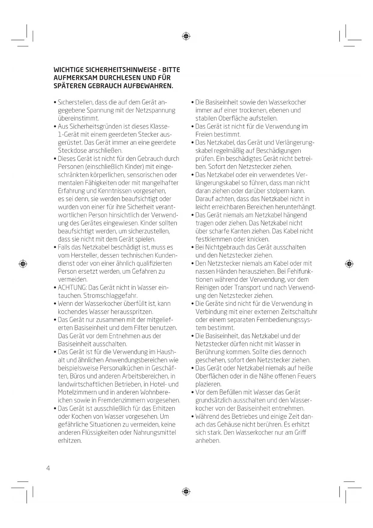 - Das Gerät ist ausschließlich für das Erhitzen oder Kochen von Wasser vorgesehen. Um gefährliche Situationen zu vermeiden, keine anderen Flüssigkeiten oder Nahrungsmittel erhitzen.